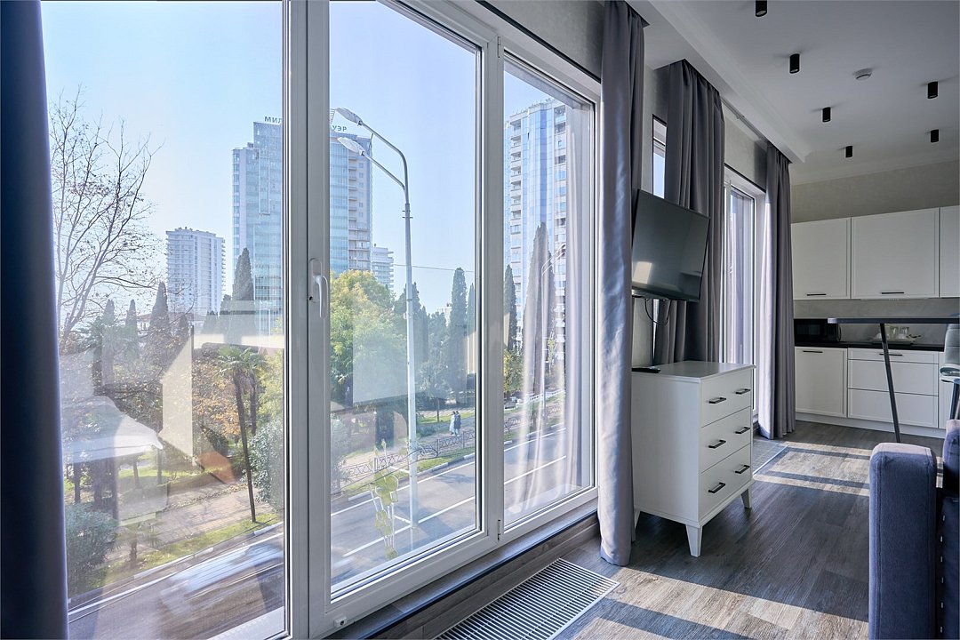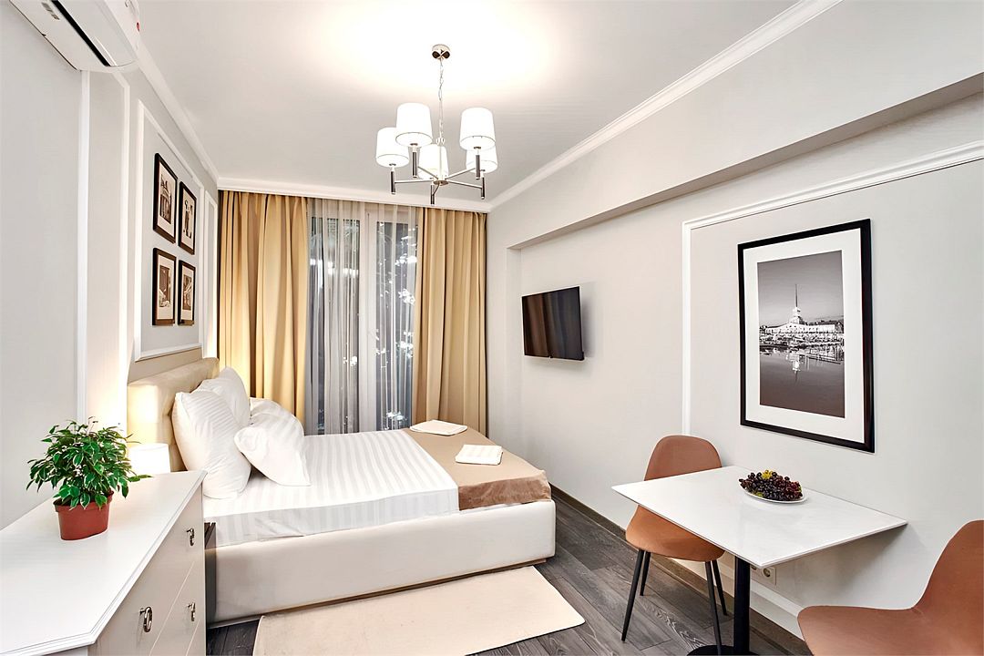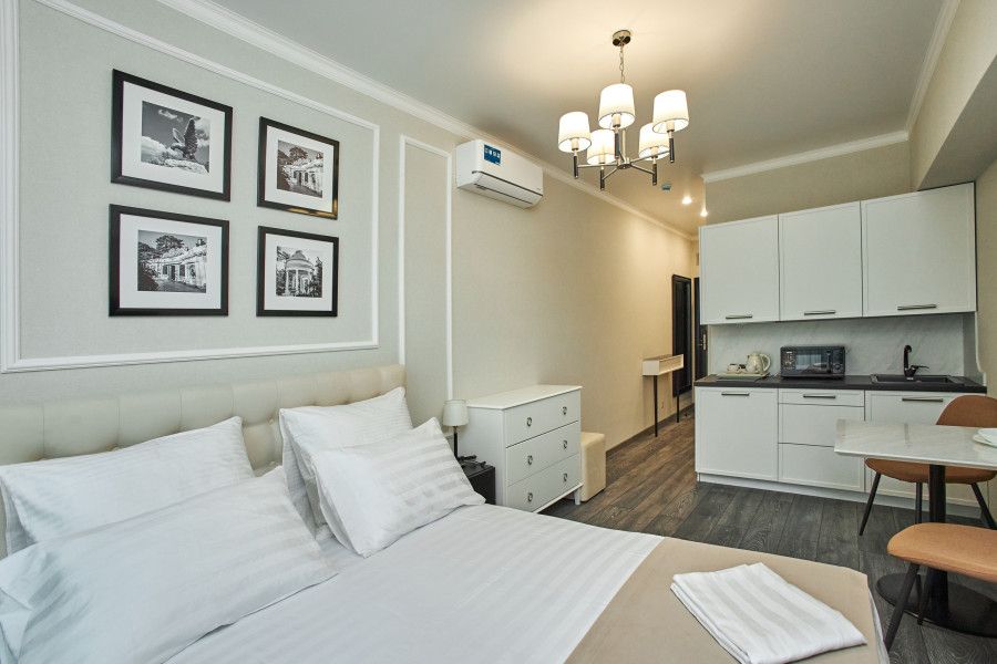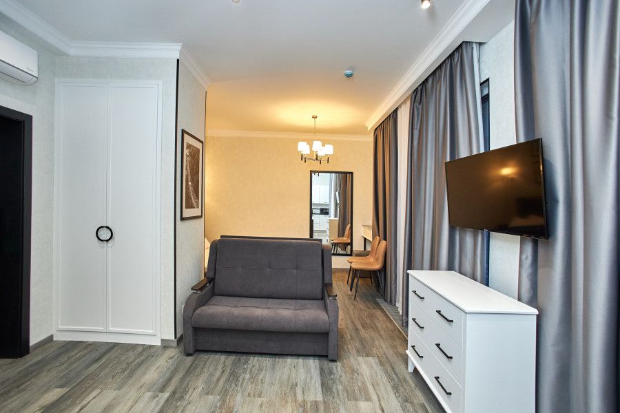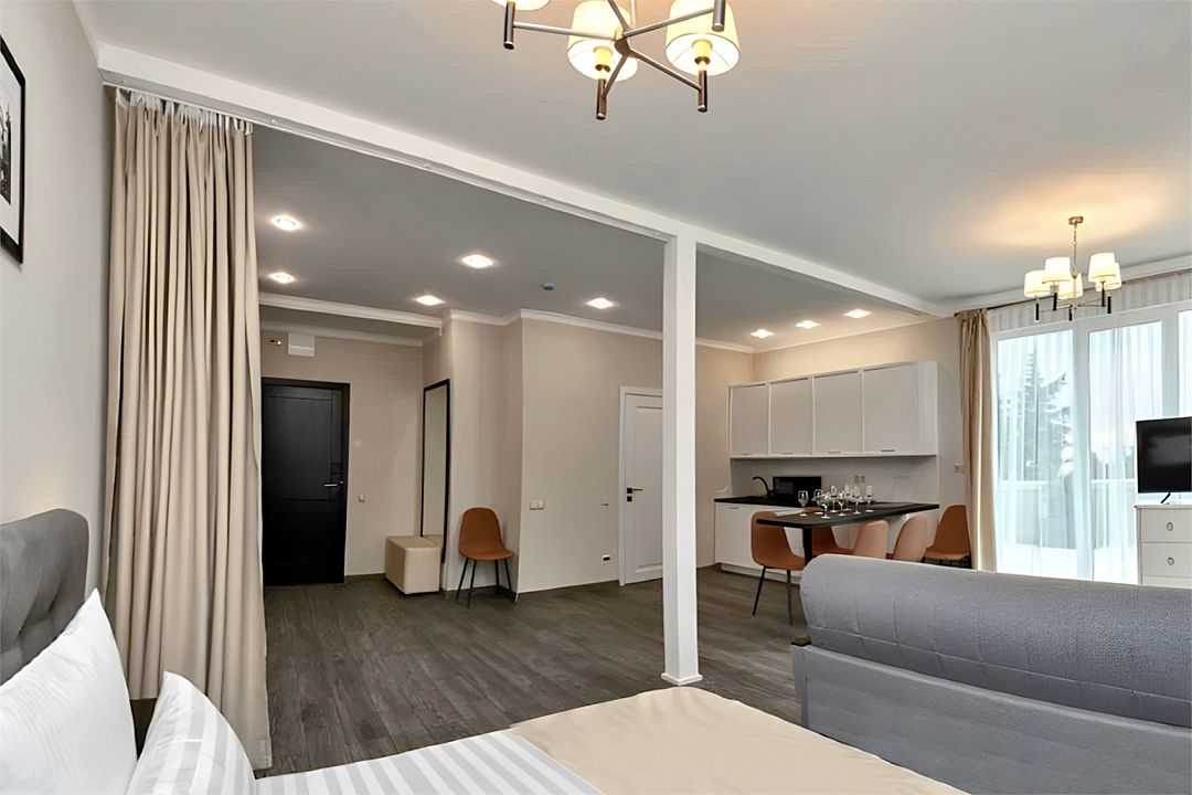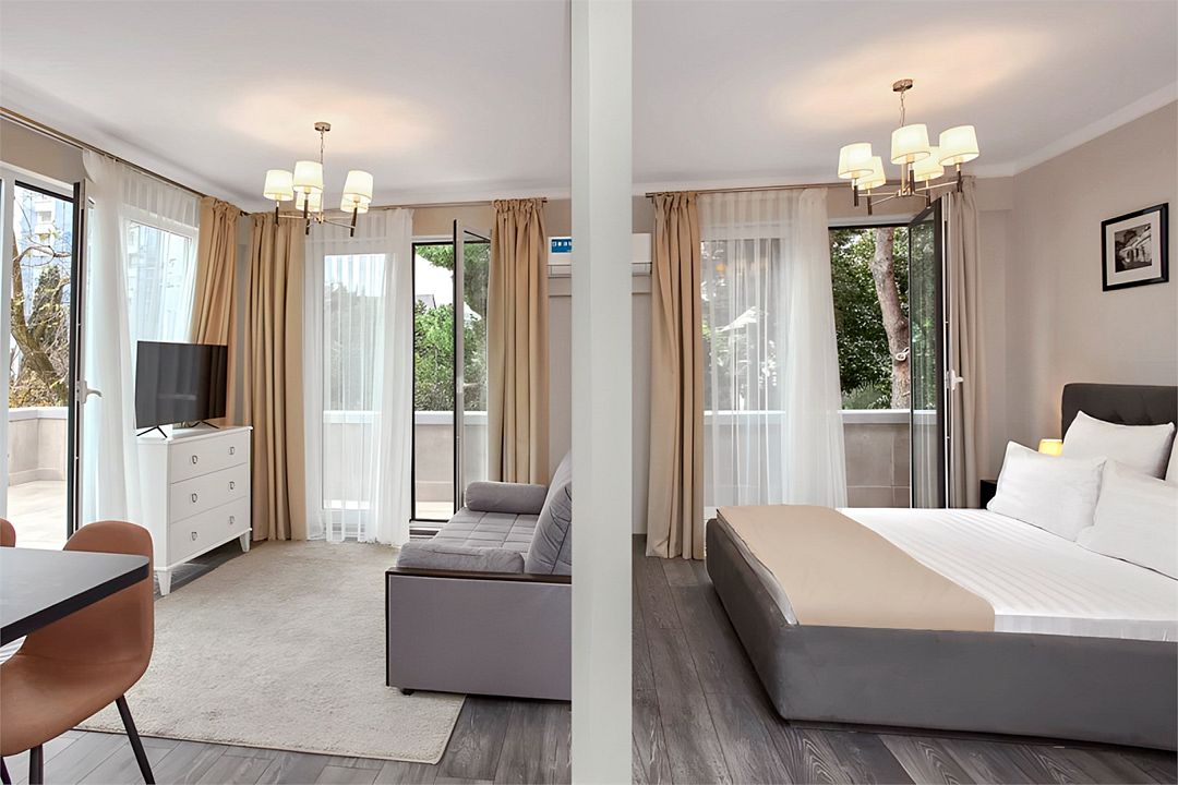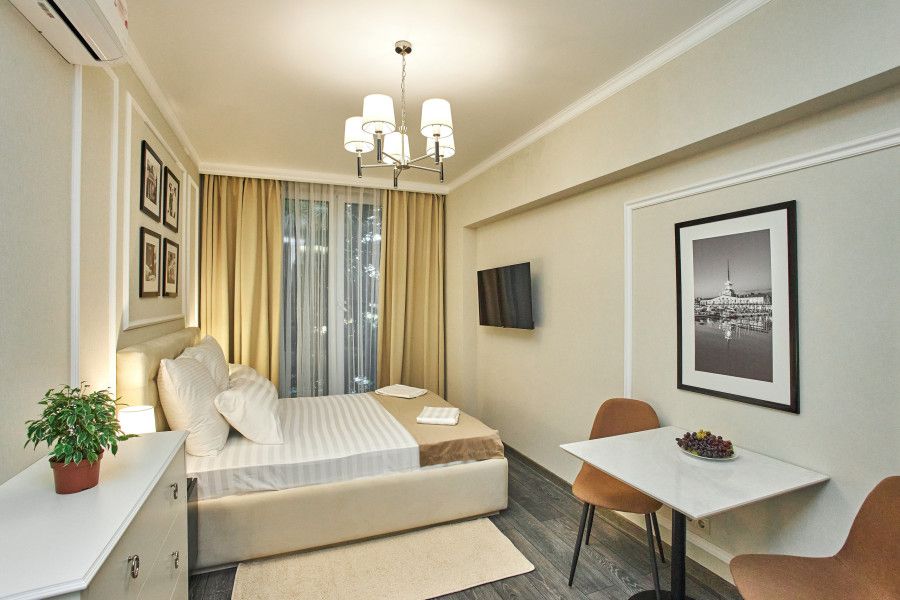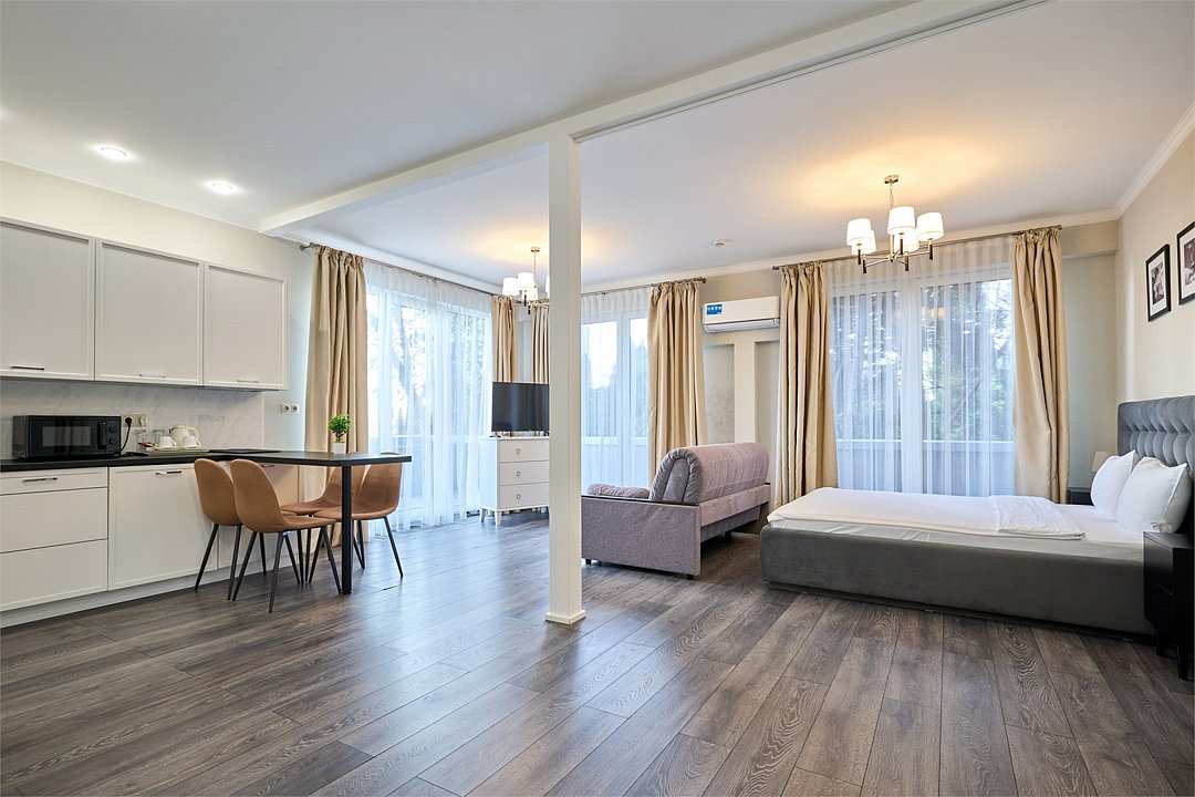 Светлые, стильные и комфортабельные студии с приятным видом на субтропические деревья. Все номера с мини кухнями. В номерах есть всё необходимое для комфортного проживания, включая микроволновую печь и стиральную машину. Почти все номера данной категории расположены на втором этаже. Площадь номера 23 - 25 кв.м. В номере есть телевизор, электронный сейф, стол, пуфики и прикроватные тумбочки. Ванная комната с раковиной, ванной / душевой кабиной, также имеются индивидуальные наборы косметических средств для гостей. Комфортную температуру обеспечивает сплит система кондиционирования. *Кровати в номере имеют фиксированную конструкцию и не могут быть трансформированы в односпальные. *Обращаем ваше внимание, что варочные поверхности в номерах не функционируют.Услуги и удобства