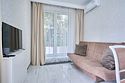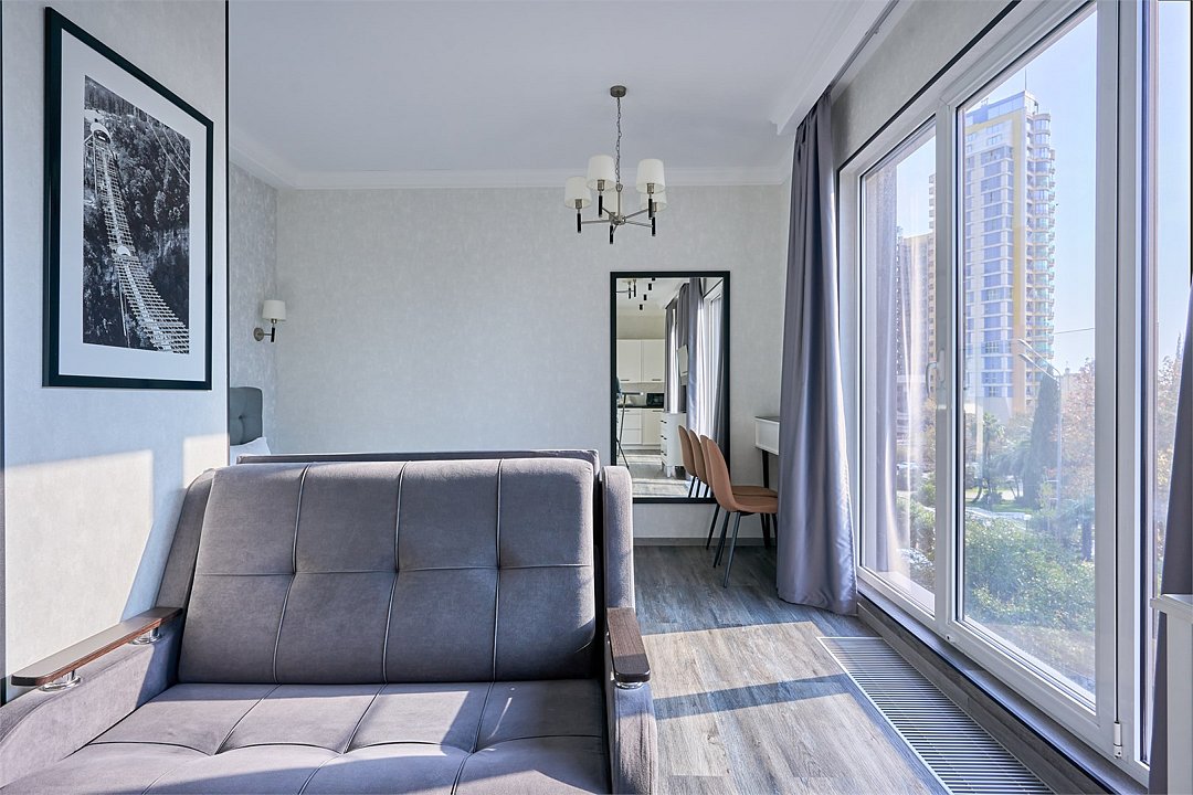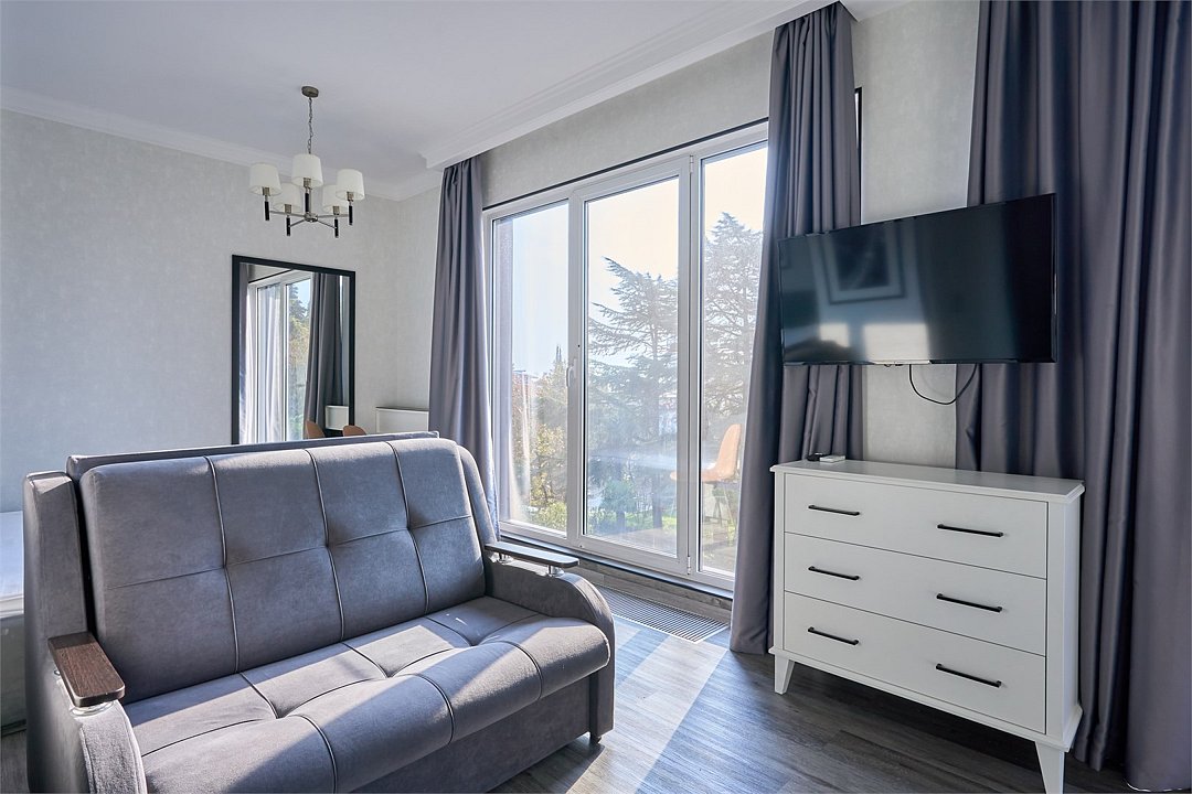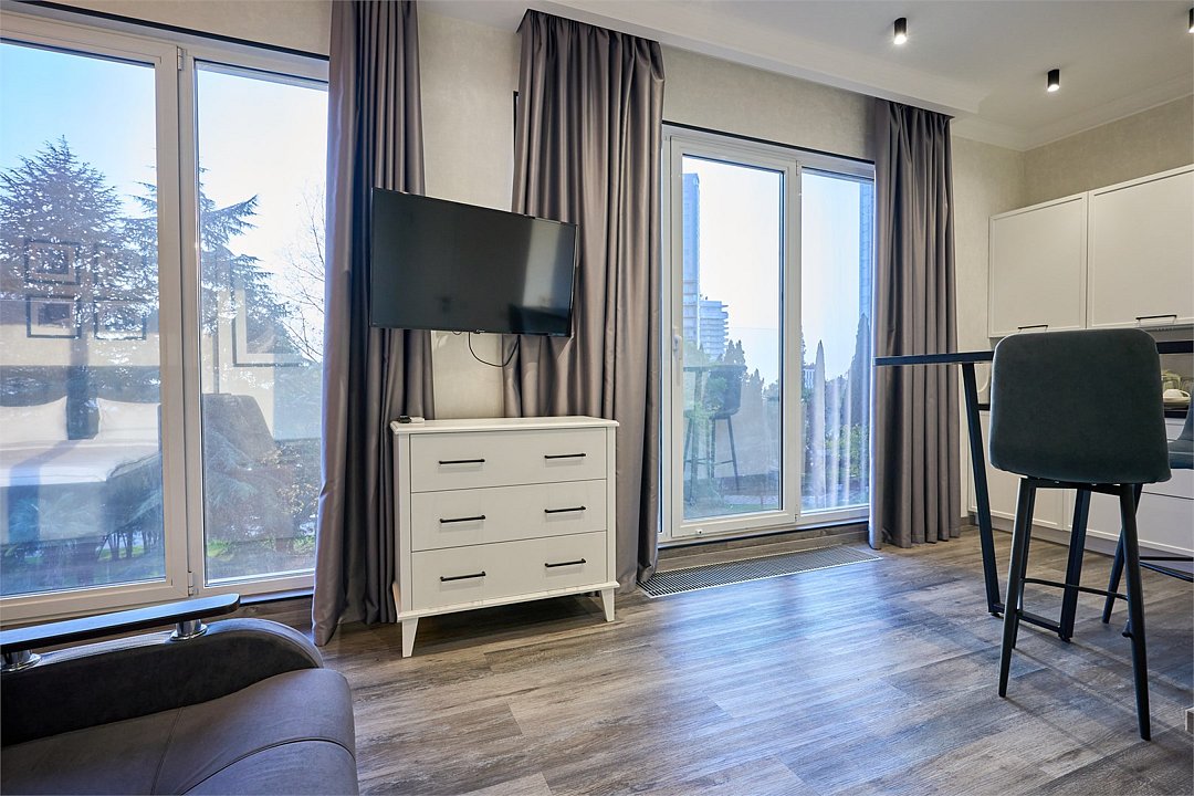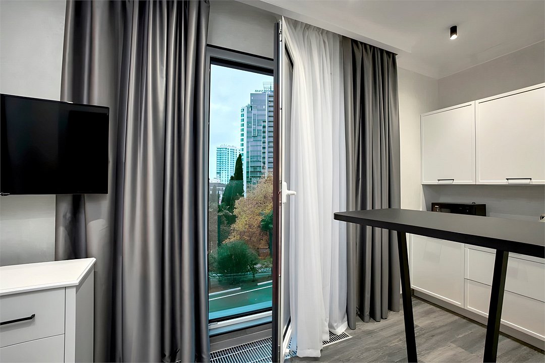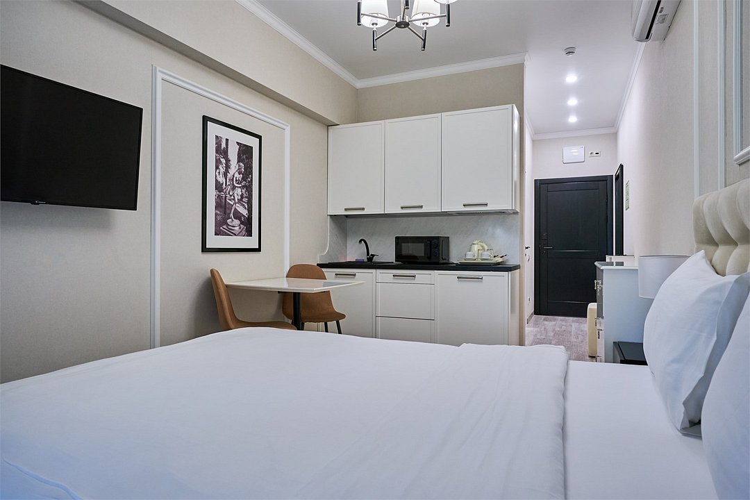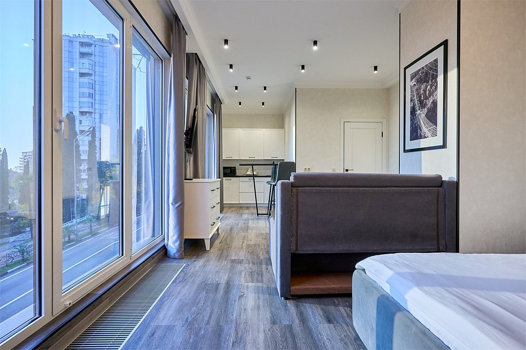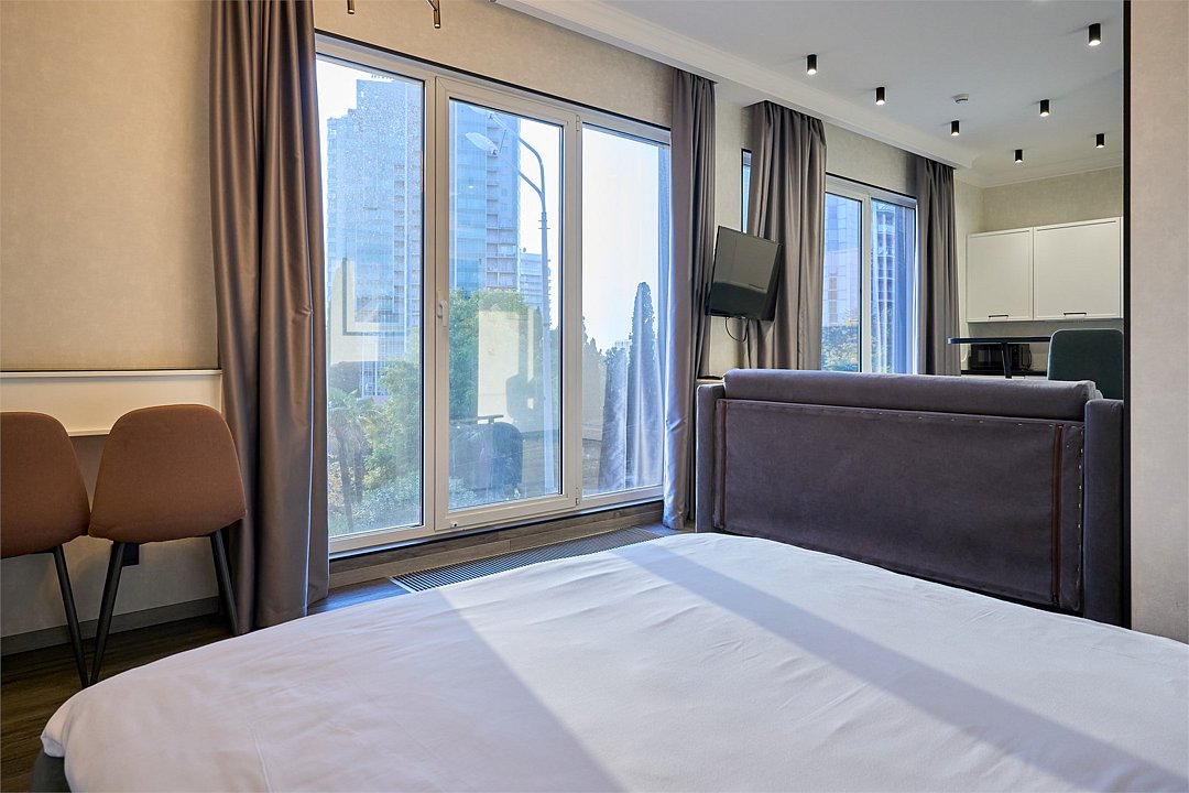 Светлые, стильные и комфортабельные студии с приятным видом на субтропические деревья. Все номера с мини кухнями. В номерах есть всё необходимое для комфортного проживания, включая микроволновую печь и стиральную машину. Почти все номера данной категории расположены на втором этаже. Площадь номера 23 - 25 кв.м. В номере есть телевизор, электронный сейф, стол, пуфики и прикроватные тумбочки. Ванная комната с раковиной, ванной / душевой кабиной, также имеются индивидуальные наборы косметических средств для гостей. Комфортную температуру обеспечивает сплит система кондиционирования. *Кровати в номере имеют фиксированную конструкцию и не могут быть трансформированы в односпальные. *Обращаем ваше внимание, что варочные поверхности в номерах не функционируют.Услуги и удобства
