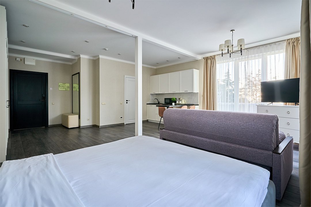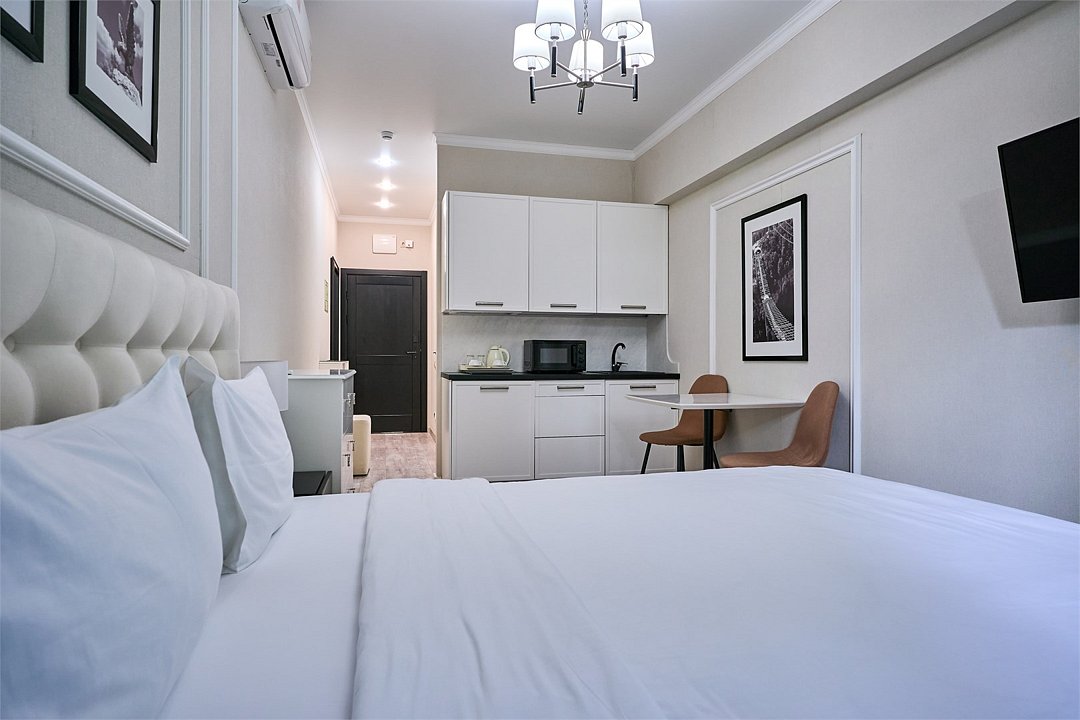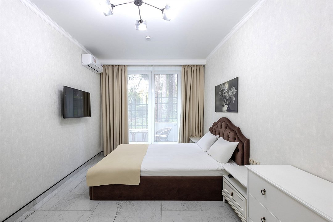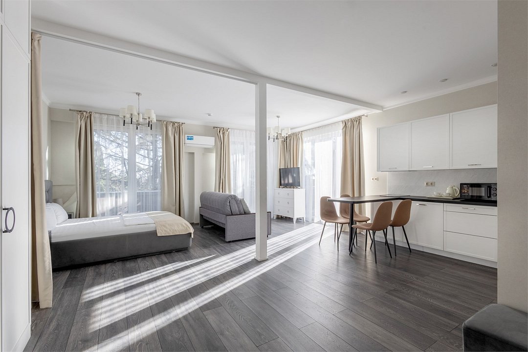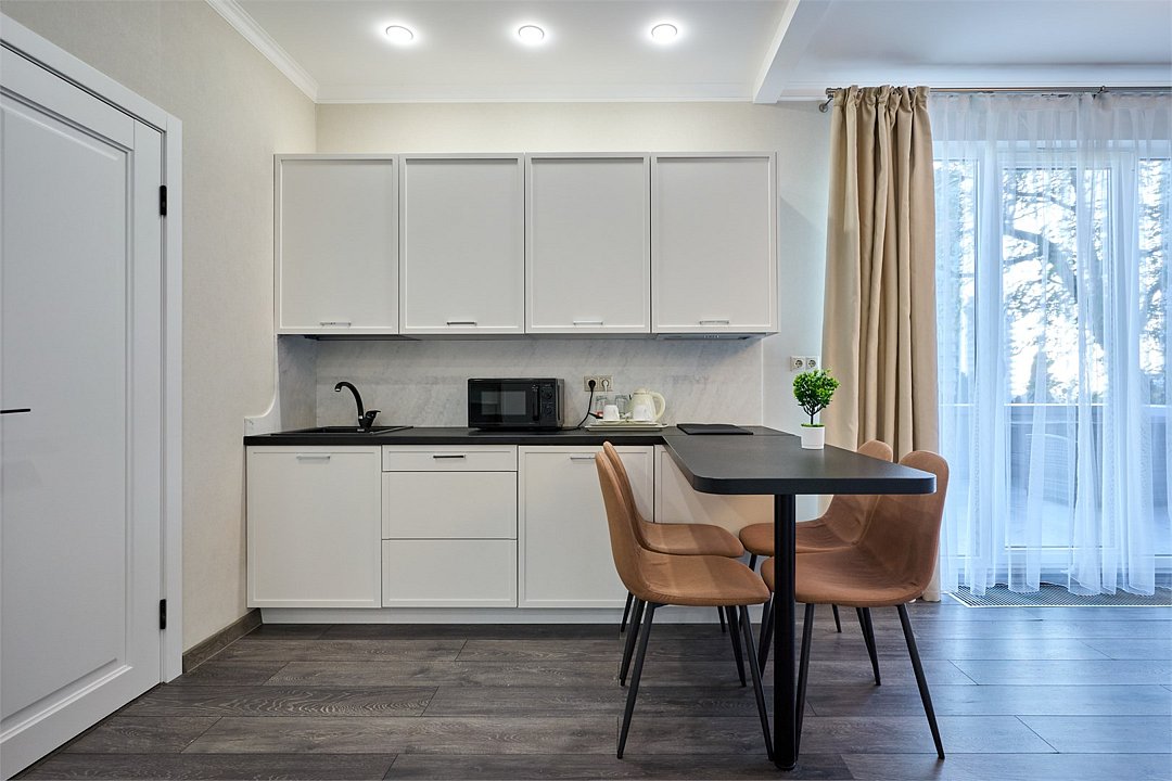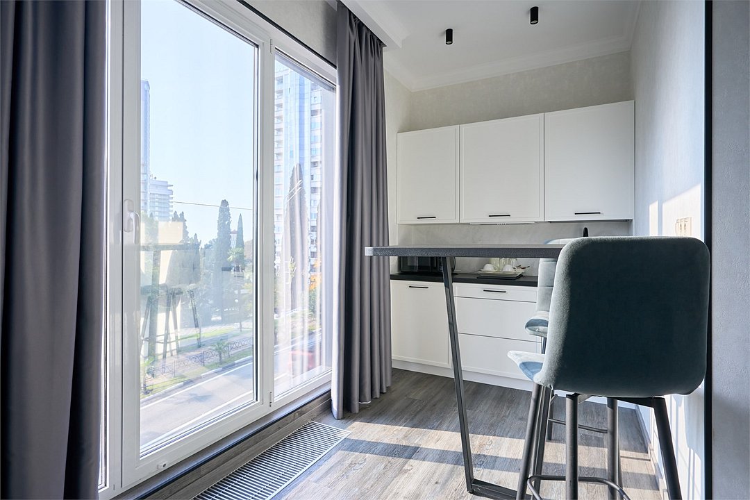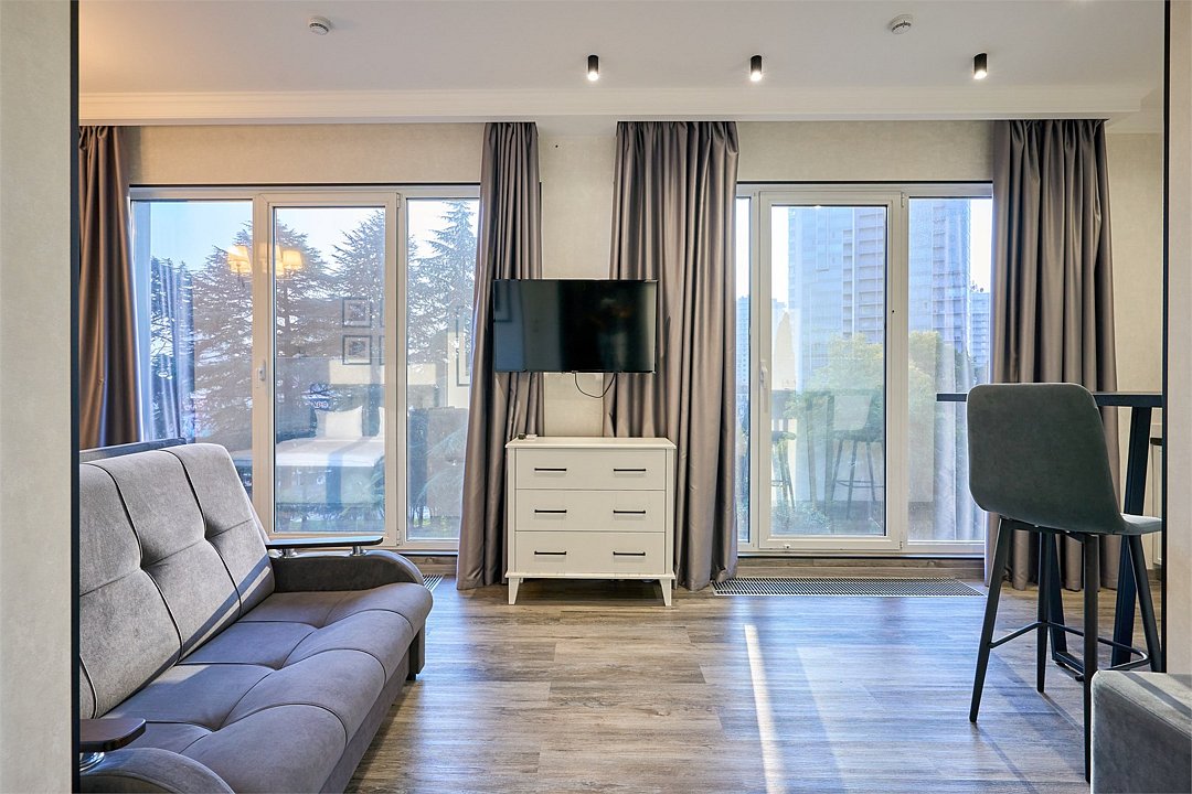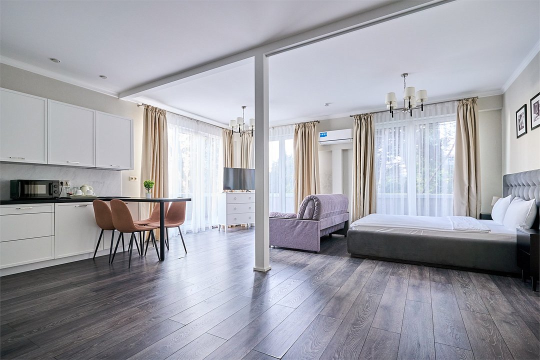 Светлые, стильные и комфортабельные студии с приятным видом на субтропические деревья. Все номера с мини кухнями. В номерах есть всё необходимое для комфортного проживания, включая микроволновую печь и стиральную машину. Почти все номера данной категории расположены на втором этаже. Площадь номера 23 - 25 кв.м. В номере есть телевизор, электронный сейф, стол, пуфики и прикроватные тумбочки. Ванная комната с раковиной, ванной / душевой кабиной, также имеются индивидуальные наборы косметических средств для гостей. Комфортную температуру обеспечивает сплит система кондиционирования. *Кровати в номере имеют фиксированную конструкцию и не могут быть трансформированы в односпальные. *Обращаем ваше внимание, что варочные поверхности в номерах не функционируют.Услуги и удобства