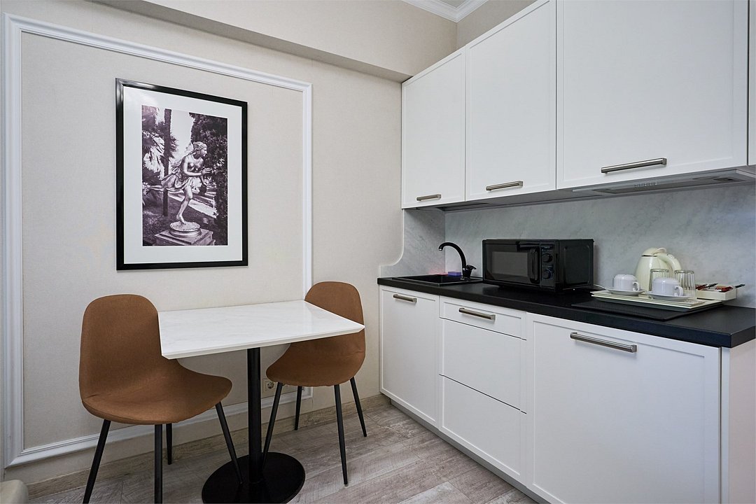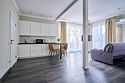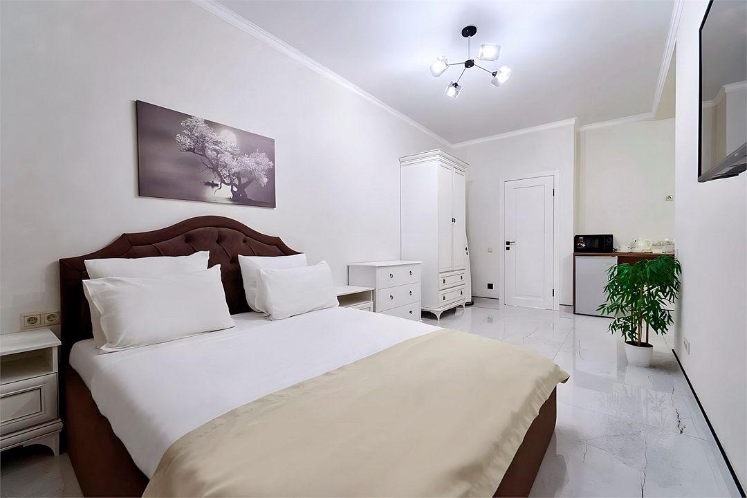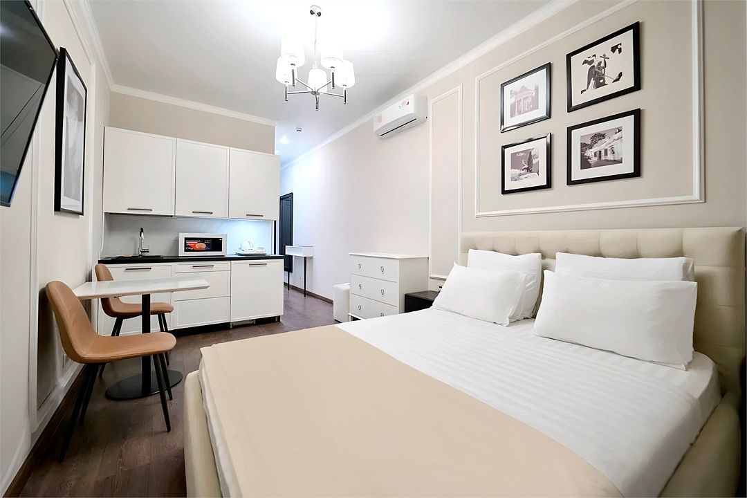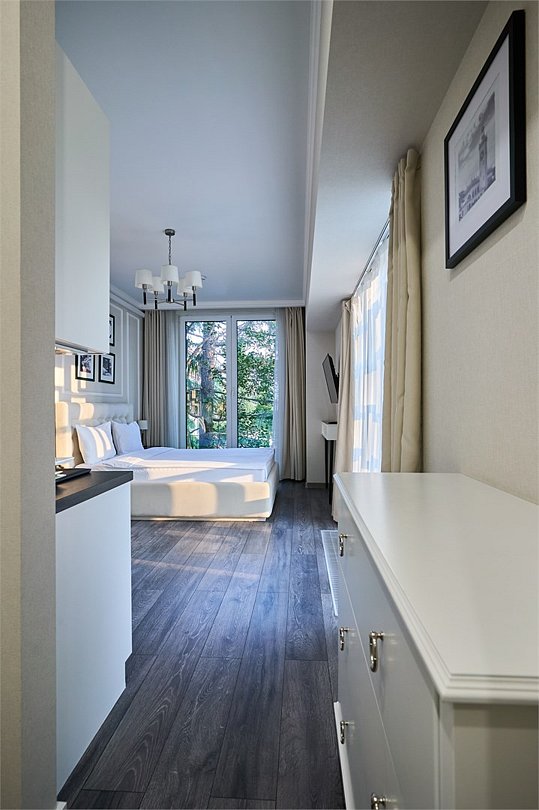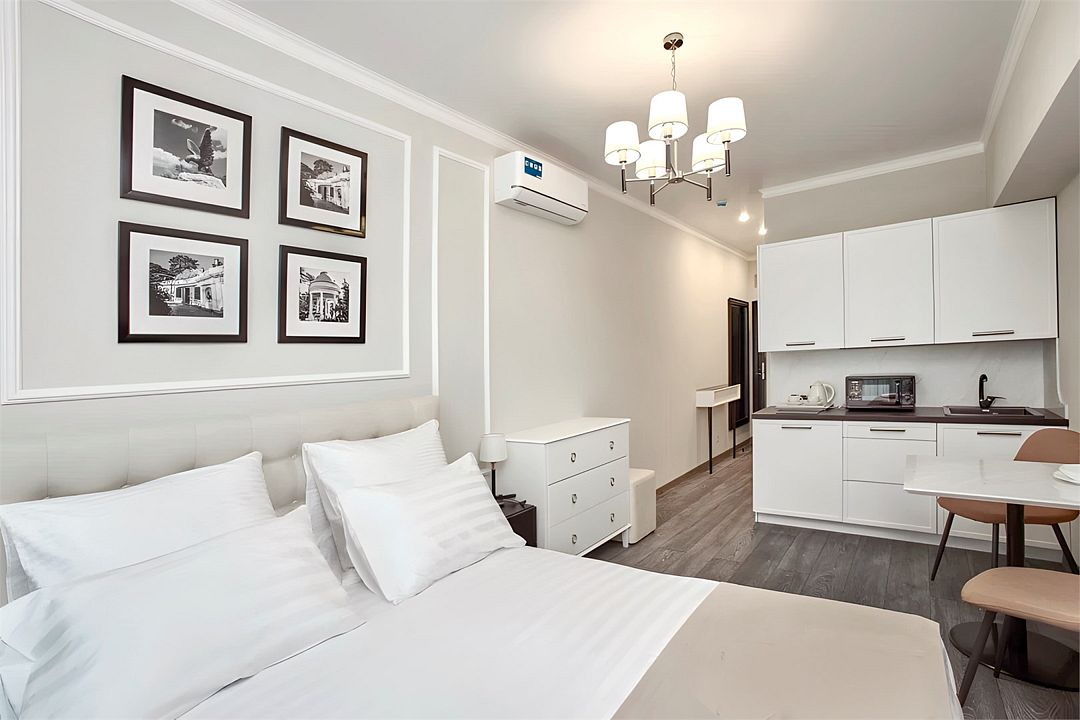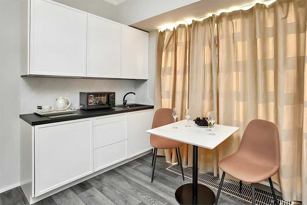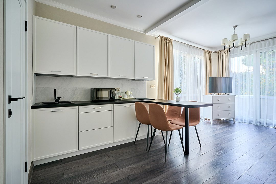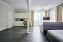 Светлые, стильные и комфортабельные студии с приятным видом на субтропические деревья. Все номера с мини кухнями. В номерах есть всё необходимое для комфортного проживания, включая микроволновую печь и стиральную машину. Почти все номера данной категории расположены на втором этаже. Площадь номера 23 - 25 кв.м. В номере есть телевизор, электронный сейф, стол, пуфики и прикроватные тумбочки. Ванная комната с раковиной, ванной / душевой кабиной, также имеются индивидуальные наборы косметических средств для гостей. Комфортную температуру обеспечивает сплит система кондиционирования. *Кровати в номере имеют фиксированную конструкцию и не могут быть трансформированы в односпальные. *Обращаем ваше внимание, что варочные поверхности в номерах не функционируют.Услуги и удобства