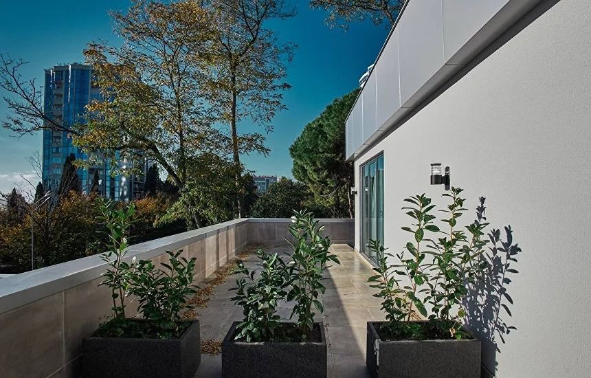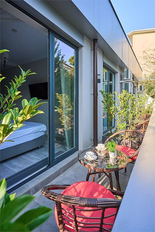 Стильные и комфортабельные номера с индивидуальной террасой, оборудованной летней мебелью. В номерах есть всё необходимое для комфортного проживания, включая микроволновую печь и стиральную машину. В номере есть телевизор, электронный сейф, стол, пуфики и прикроватные тумбочки. Ванная комната с раковиной, душем, также имеются индивидуальные наборы косметических средств для гостей. Комфортную температуру обеспечивает сплит система кондиционирования. Все номера данной категории расположены на первом этаже и имеют выход на террасу. *Кровати в номере имеют фиксированную конструкцию и не могут быть трансформированы в односпальные. *Обращаем ваше внимание, что варочные поверхности в номерах не функционируют.Услуги и удобства