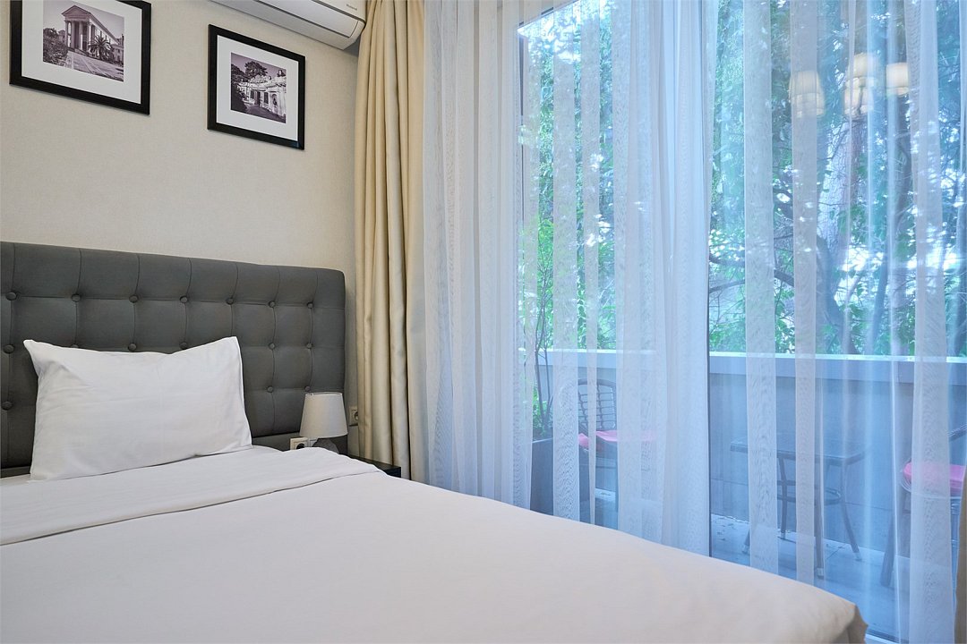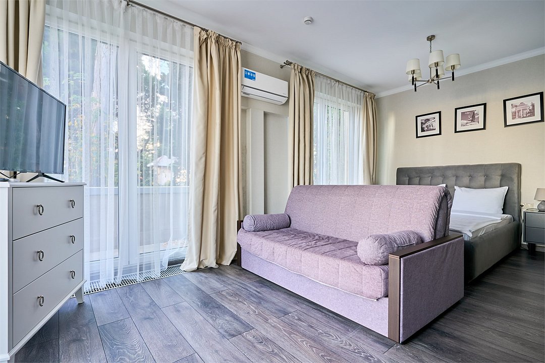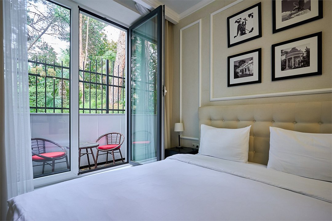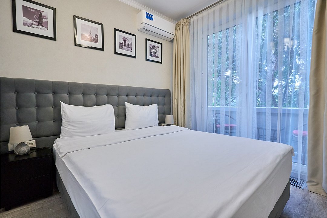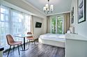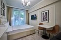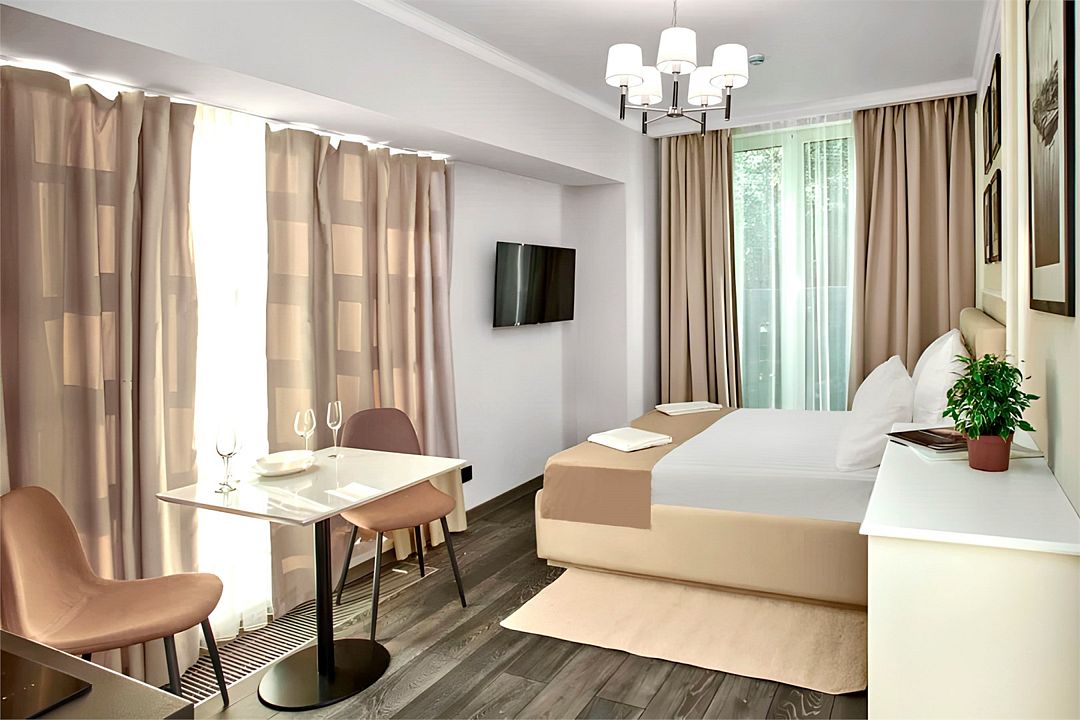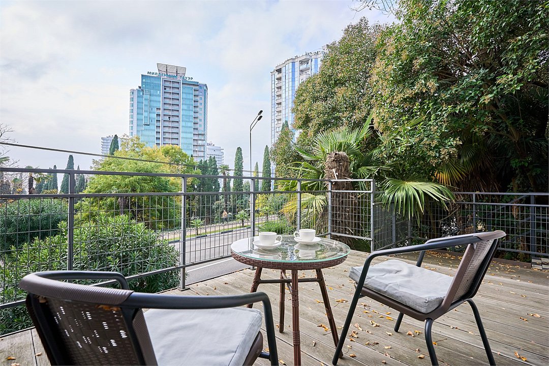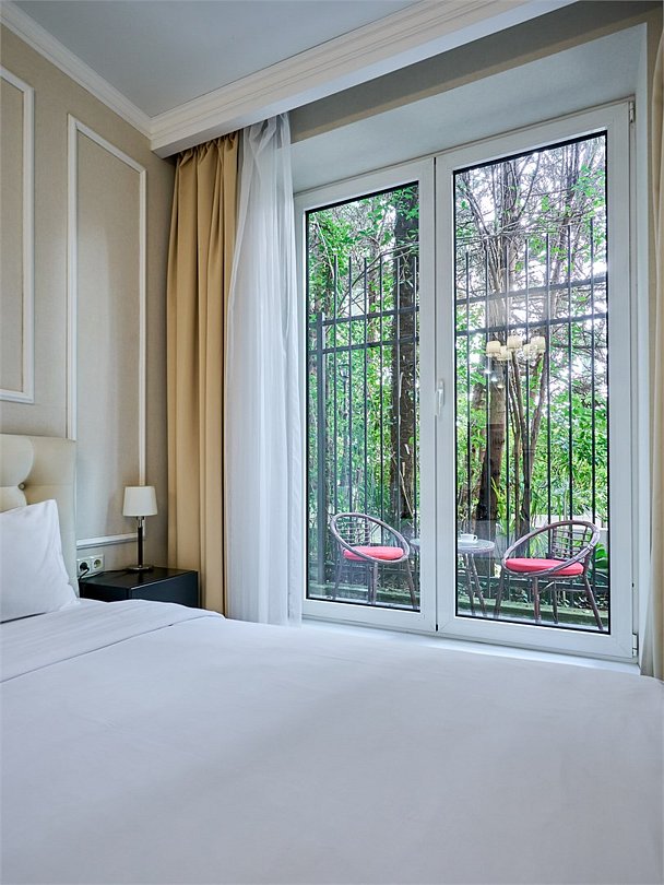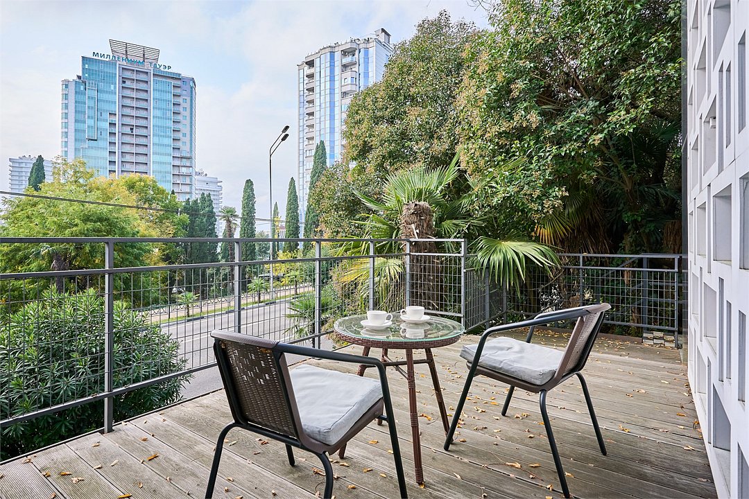 Стильные и комфортабельные номера с балконом и летней мебелью на нём. В номерах есть всё необходимое для комфортного проживания, включая микроволновую печь и стиральную машину. Номера оснащены кроватями трансформерами - две раздельные или одна двуспальная. В номере есть телевизор, электронный сейф, стол, пуфики и прикроватные тумбочки. Ванная комната с раковиной, душем, также имеются индивидуальные наборы косметических средств для гостей. Комфортную температуру обеспечивает сплит система кондиционирования. Все номера данной категории расположены на третьем этаже, имеют балкон с видом на парк.Услуги и удобства