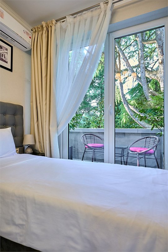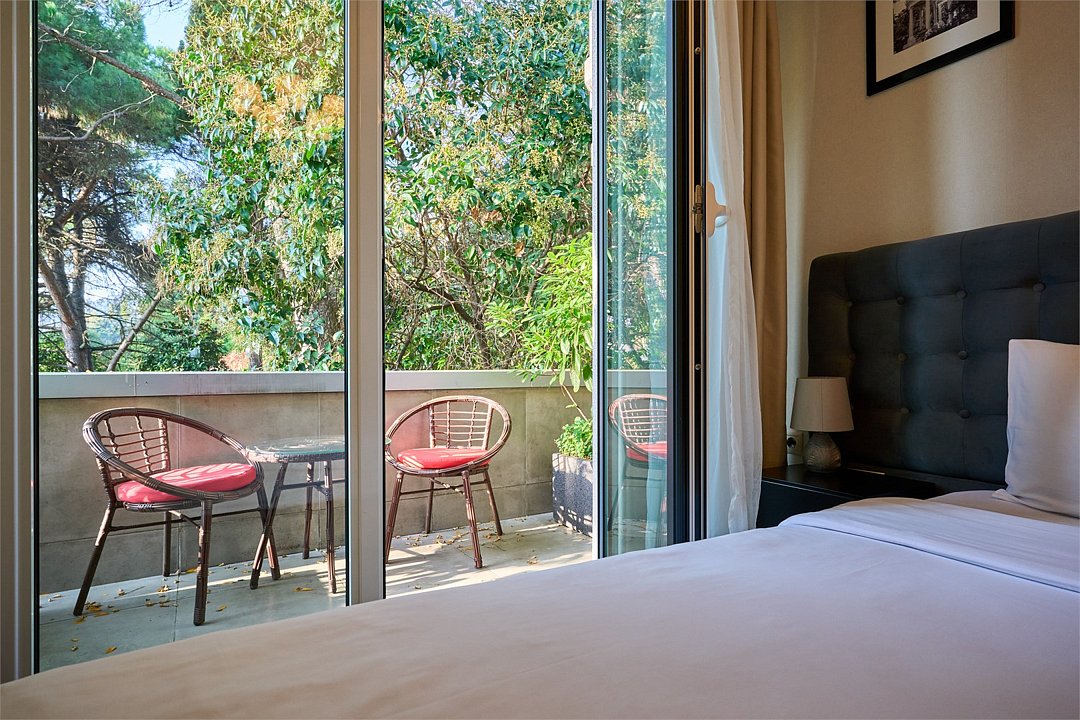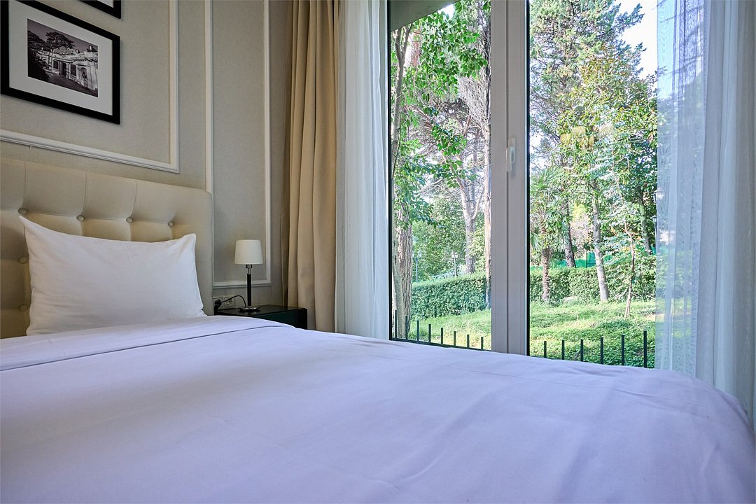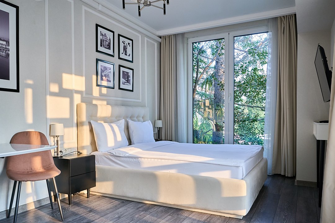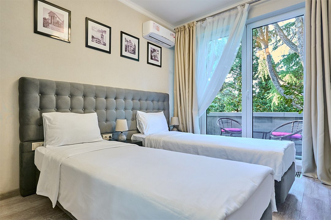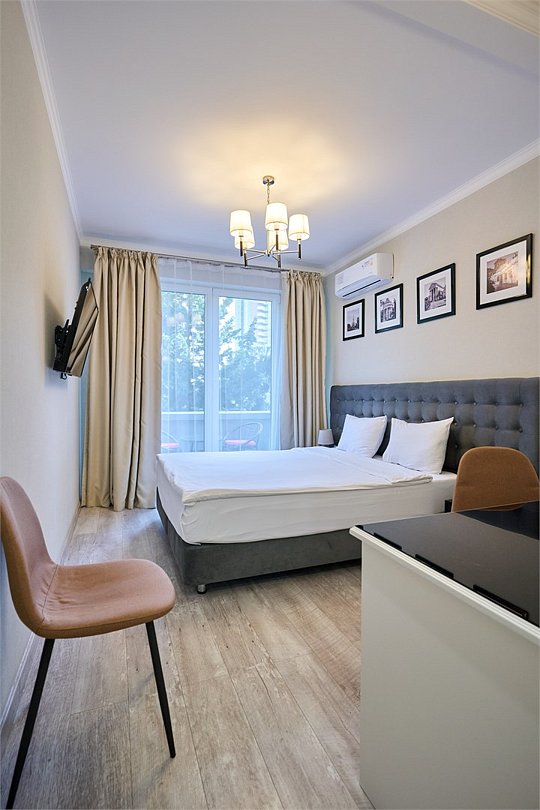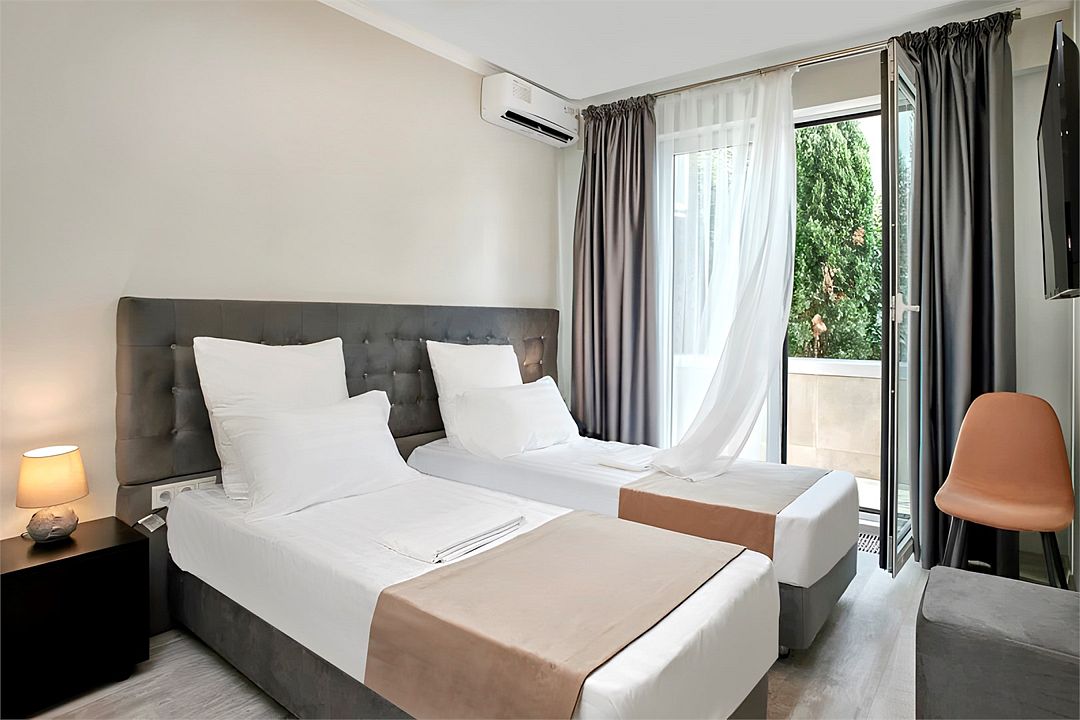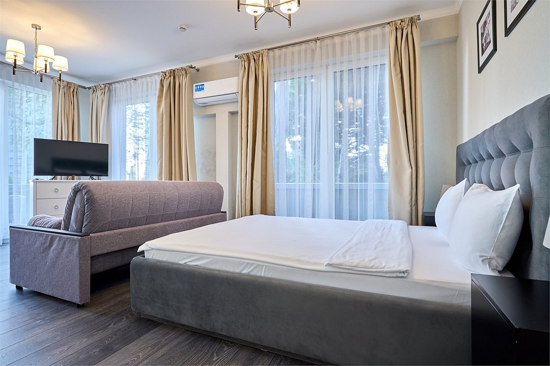 Стильные и комфортабельные номера с балконом и летней мебелью на нём. В номерах есть всё необходимое для комфортного проживания, включая микроволновую печь и стиральную машину. Номера оснащены кроватями трансформерами - две раздельные или одна двуспальная. В номере есть телевизор, электронный сейф, стол, пуфики и прикроватные тумбочки. Ванная комната с раковиной, душем, также имеются индивидуальные наборы косметических средств для гостей. Комфортную температуру обеспечивает сплит система кондиционирования. Все номера данной категории расположены на третьем этаже, имеют балкон с видом на парк.Услуги и удобства