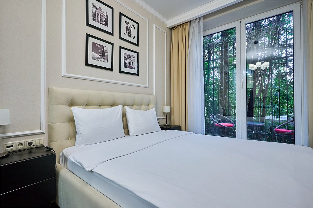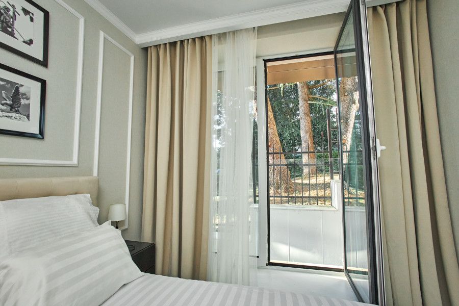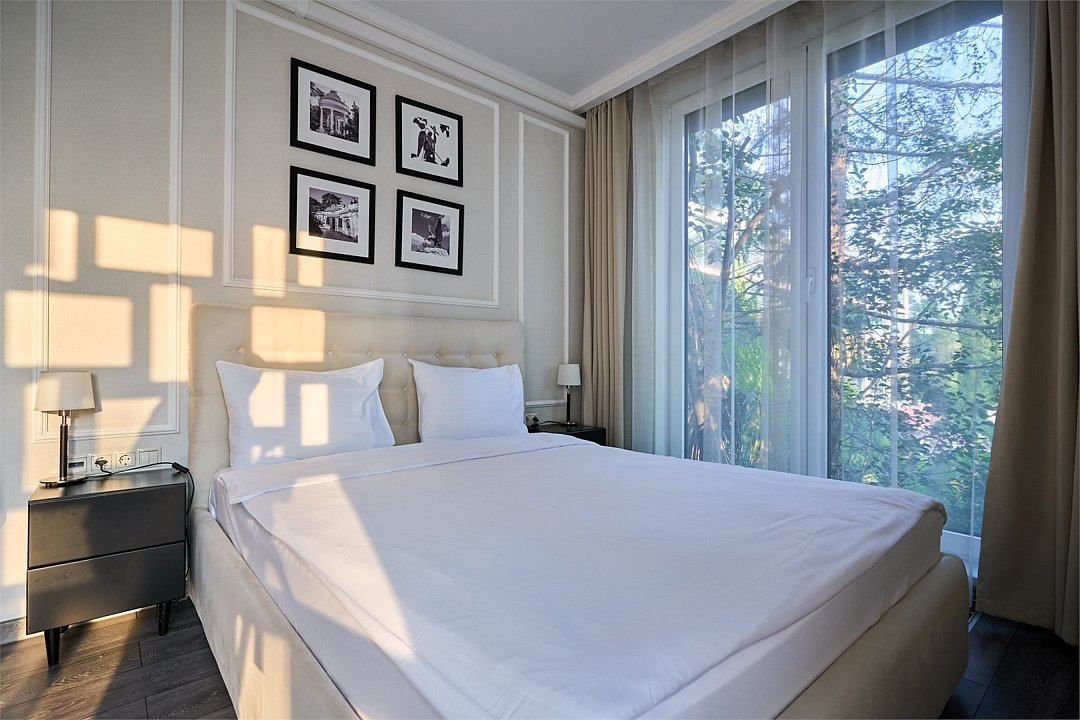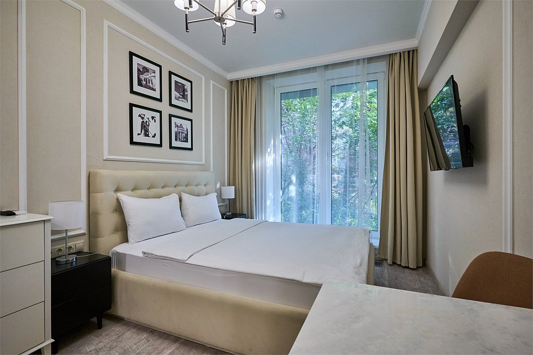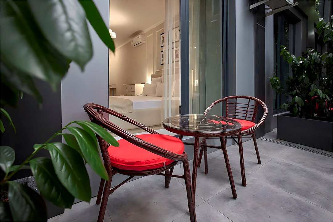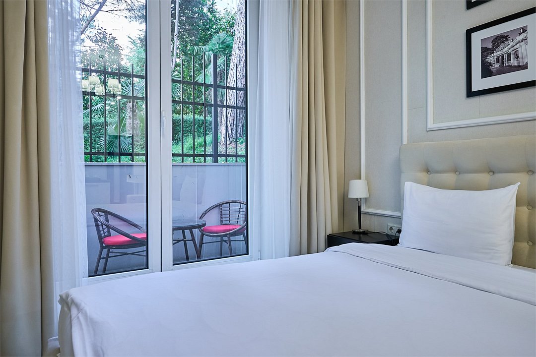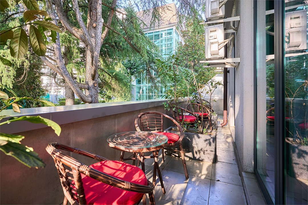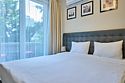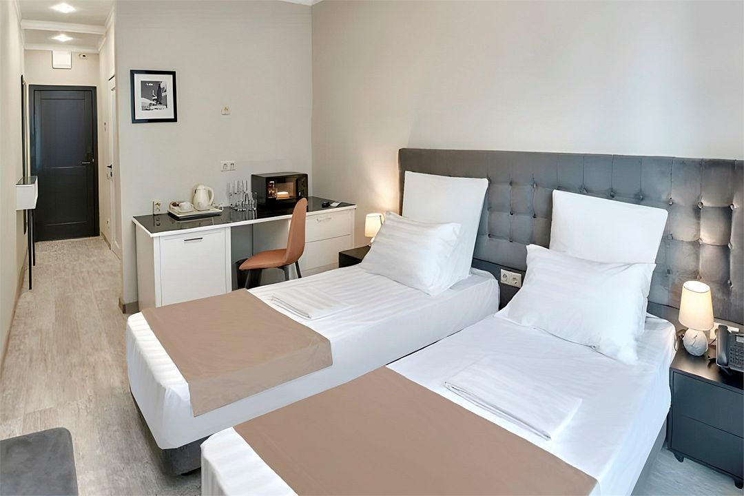 Стильные и комфортабельные номера с балконом и летней мебелью на нём. В номерах есть всё необходимое для комфортного проживания, включая микроволновую печь и стиральную машину. Номера оснащены кроватями трансформерами - две раздельные или одна двуспальная. В номере есть телевизор, электронный сейф, стол, пуфики и прикроватные тумбочки. Ванная комната с раковиной, душем, также имеются индивидуальные наборы косметических средств для гостей. Комфортную температуру обеспечивает сплит система кондиционирования. Все номера данной категории расположены на третьем этаже, имеют балкон с видом на парк.Услуги и удобства