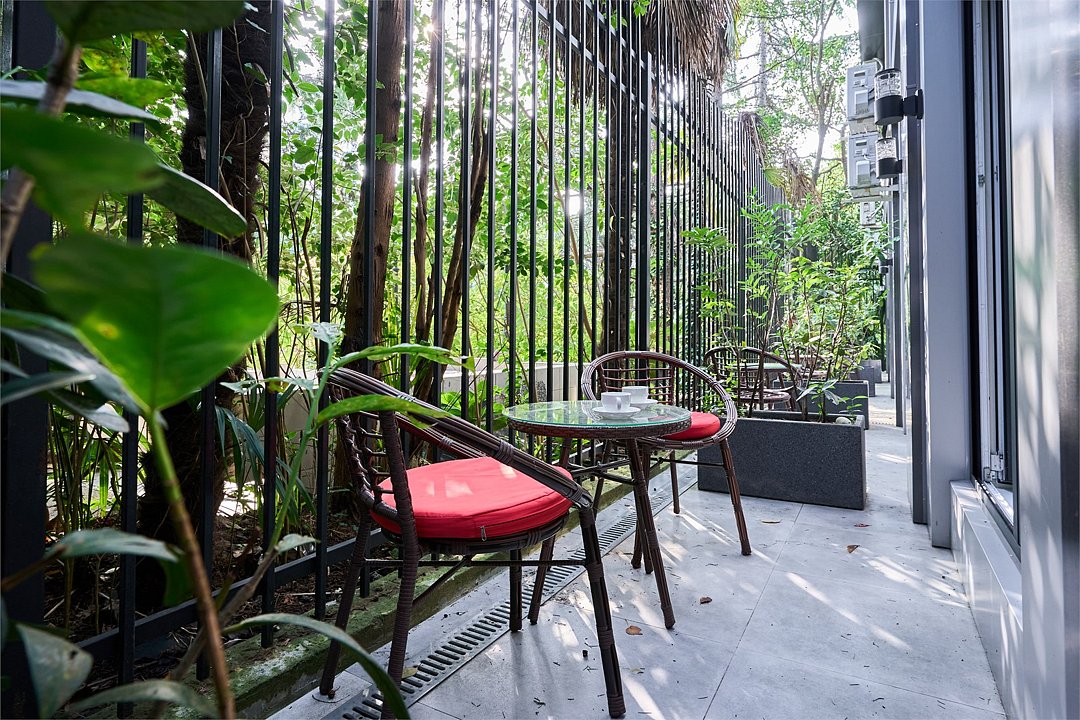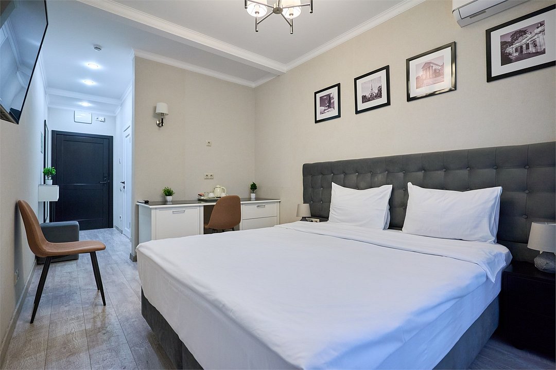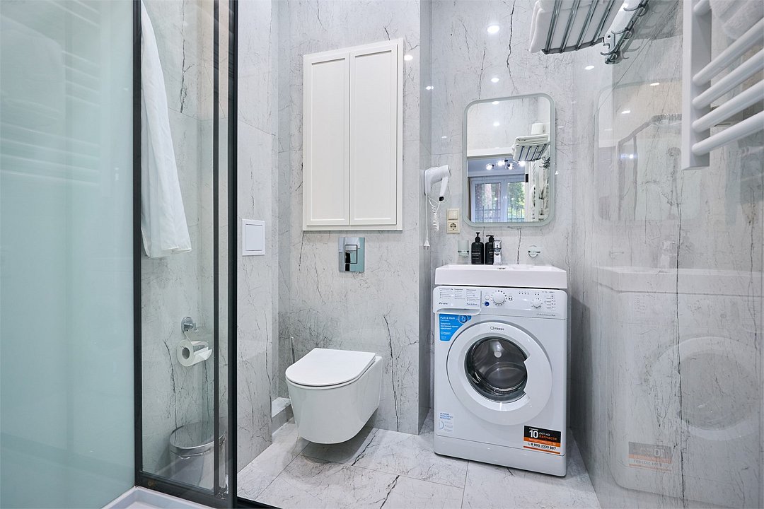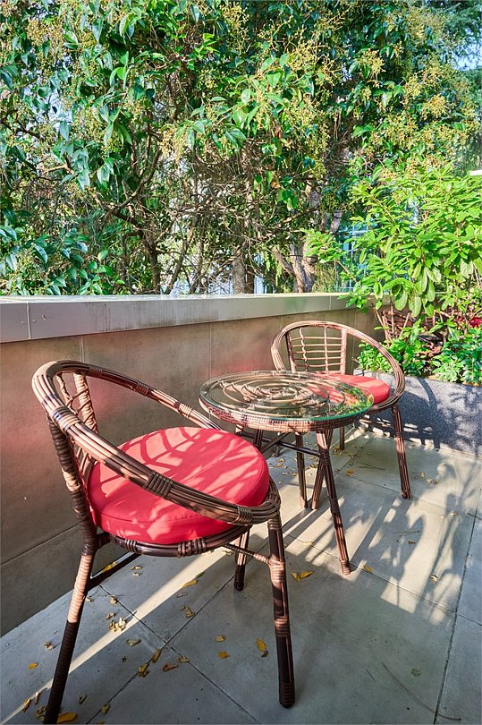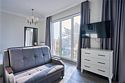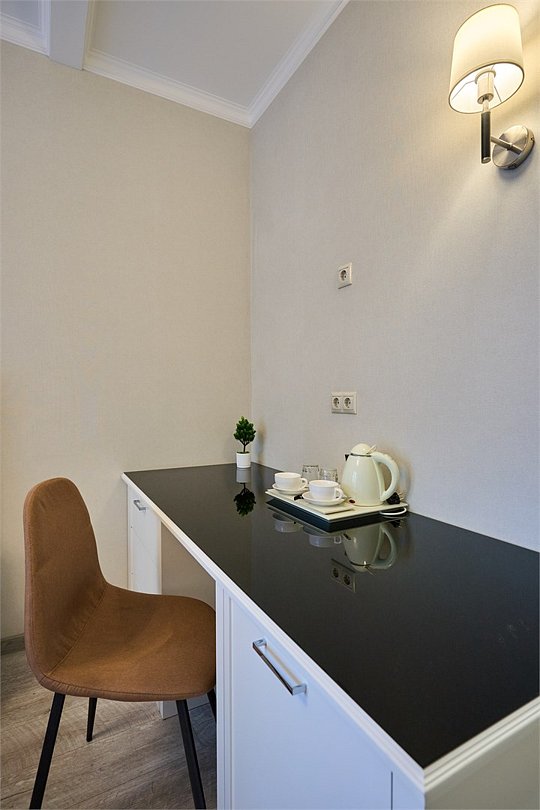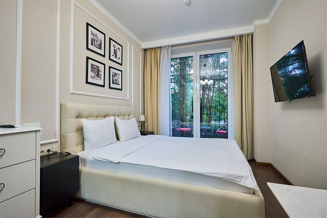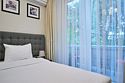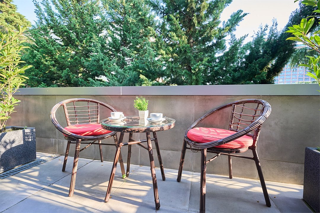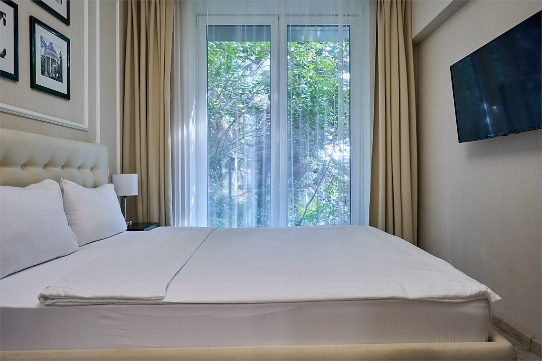 Стильные и комфортабельные номера с балконом и летней мебелью на нём. В номерах есть всё необходимое для комфортного проживания, включая микроволновую печь и стиральную машину. Номера оснащены кроватями трансформерами - две раздельные или одна двуспальная. В номере есть телевизор, электронный сейф, стол, пуфики и прикроватные тумбочки. Ванная комната с раковиной, душем, также имеются индивидуальные наборы косметических средств для гостей. Комфортную температуру обеспечивает сплит система кондиционирования. Все номера данной категории расположены на третьем этаже, имеют балкон с видом на парк.Услуги и удобства