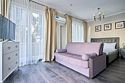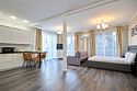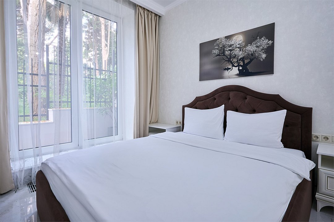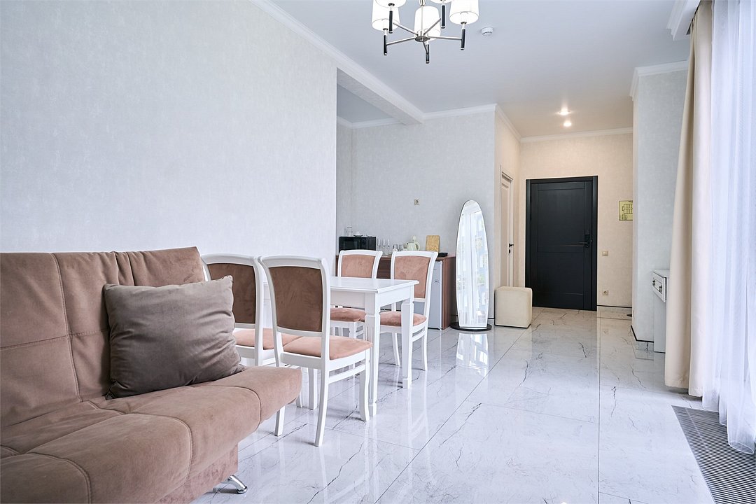 Просторный люкс с гостиной и спальней. В номере есть всё необходимое для комфортного проживания и отдыха: двуспальная кровать в спальне, двуспальный диван в гостиной, так же в номере имеется микроволновка и стиральная машина. Из окон номера и с террасы открывается вид на Курортный проспект. Номер имеет собственную просторную террасу с летней мебелью. *Кровати в номере имеют фиксированную конструкцию и не могут быть трансформированы в односпальные.Услуги и удобства