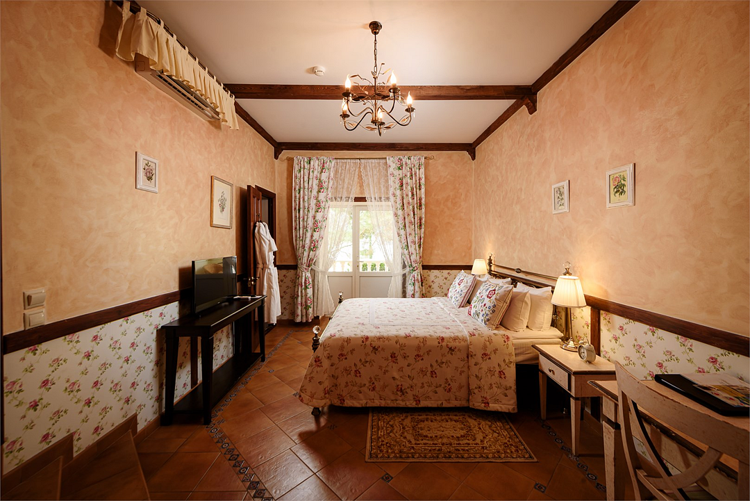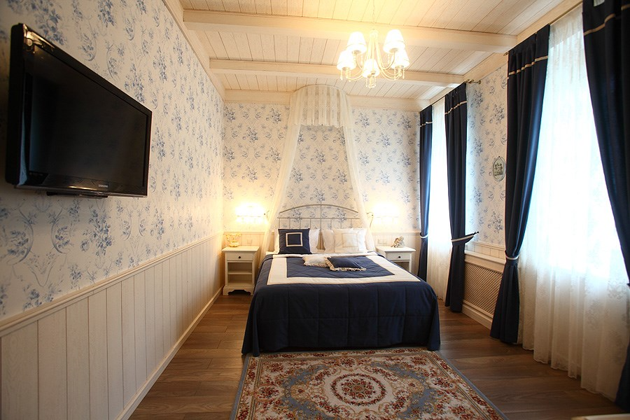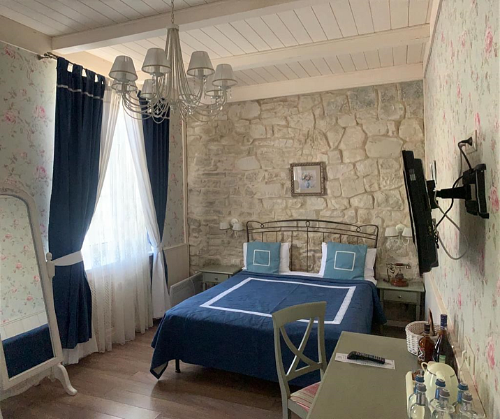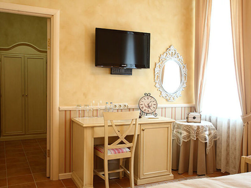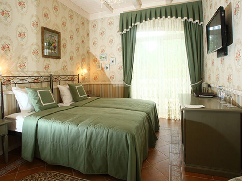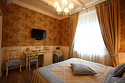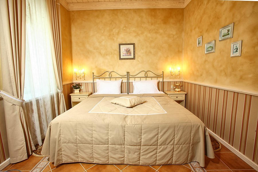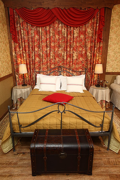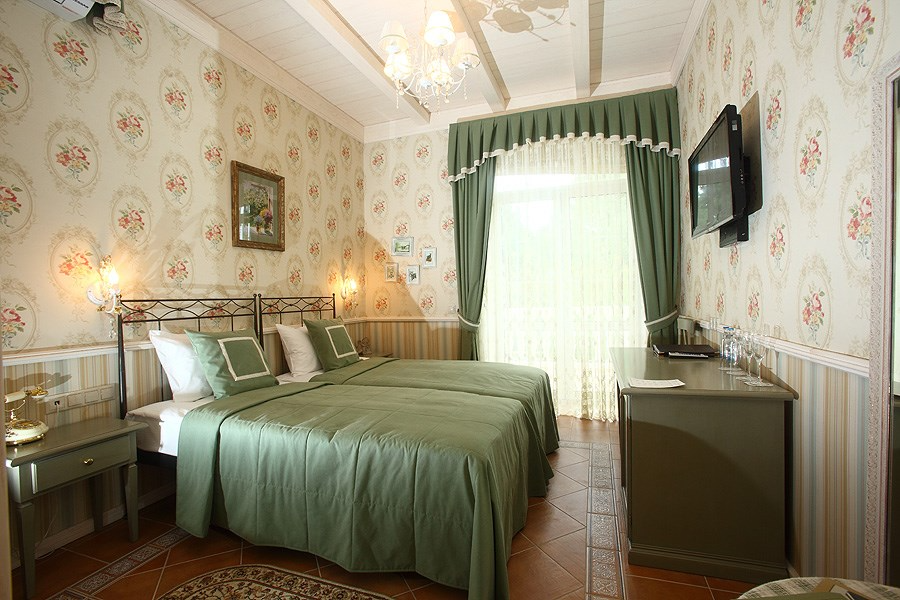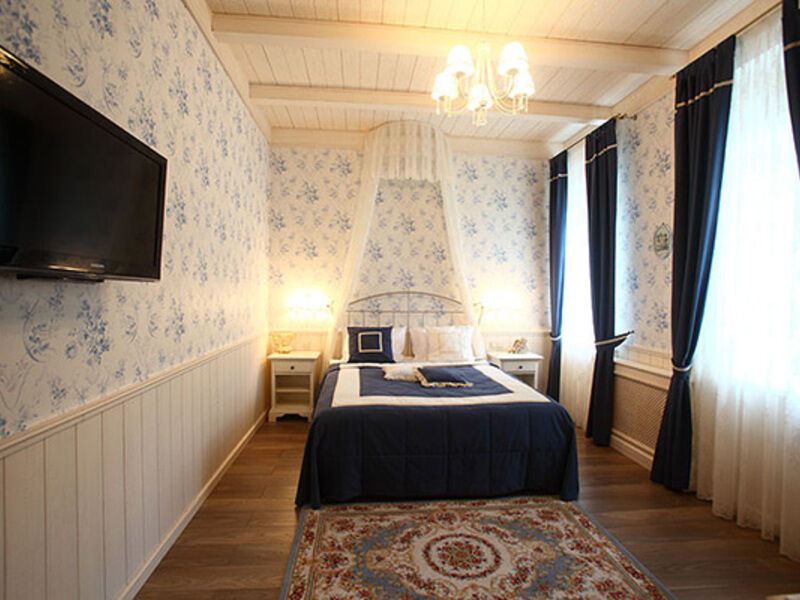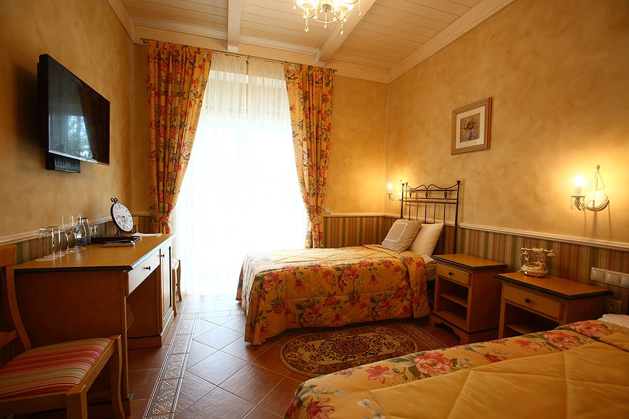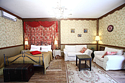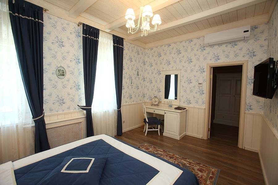 В номерах: 2-спальная кровать с балдахином или без, шкаф, трюмо или рабочий стол, журнальный столик, мягкая мебель, телевизор, мини-бар, сейф, телефон, сплит-система, фен.
