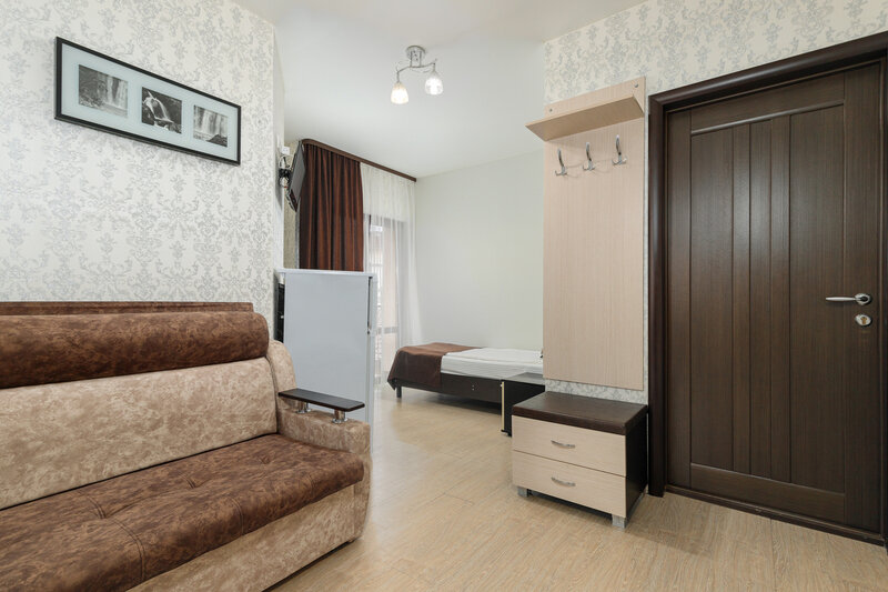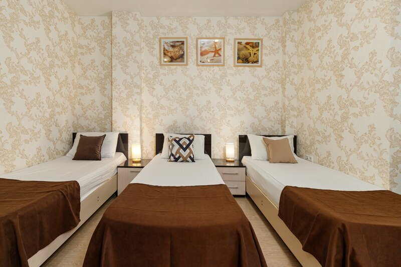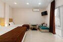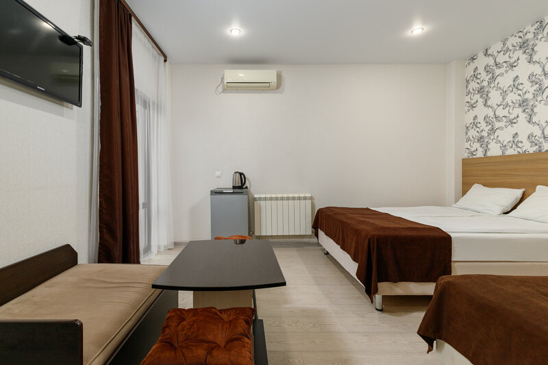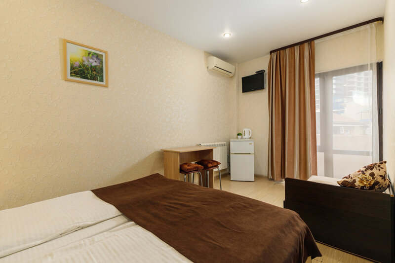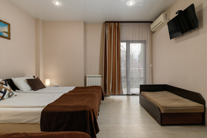 Путешествие с семьейдом в дали от домаНаша семья ( 2 взрослых и 2 детей) отлично разместились в большой комнате со всеми удобствами. Комнату разделяет перегородка, поэтому никто никому не мешал. В комнате есть холодильник, чайник, кондиционер. В ванной был тазик. На небольшом балкончике можно посушить белье. До пляжа 10 минут черепашьим шагом.