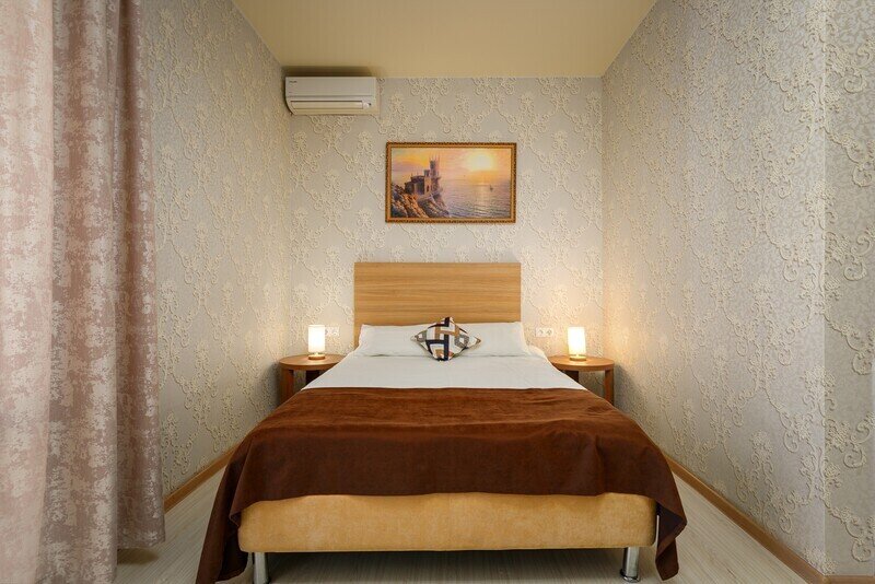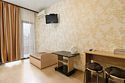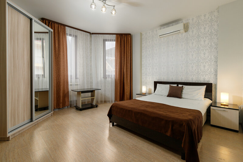 2-спальная кровать, кресло-кровать,прикроватные тумбочки,шкаф,стол,стулья,вешалка,зеркало, с/у, ванна, ТВ.