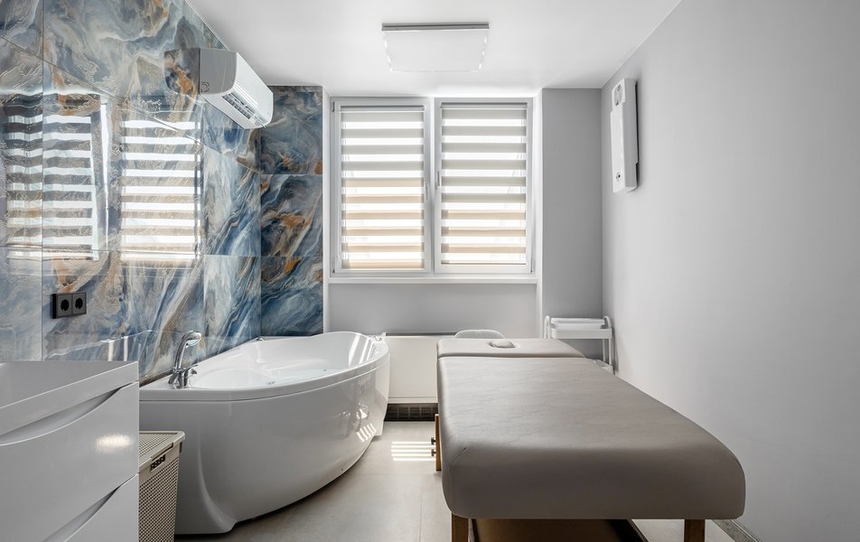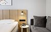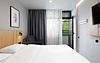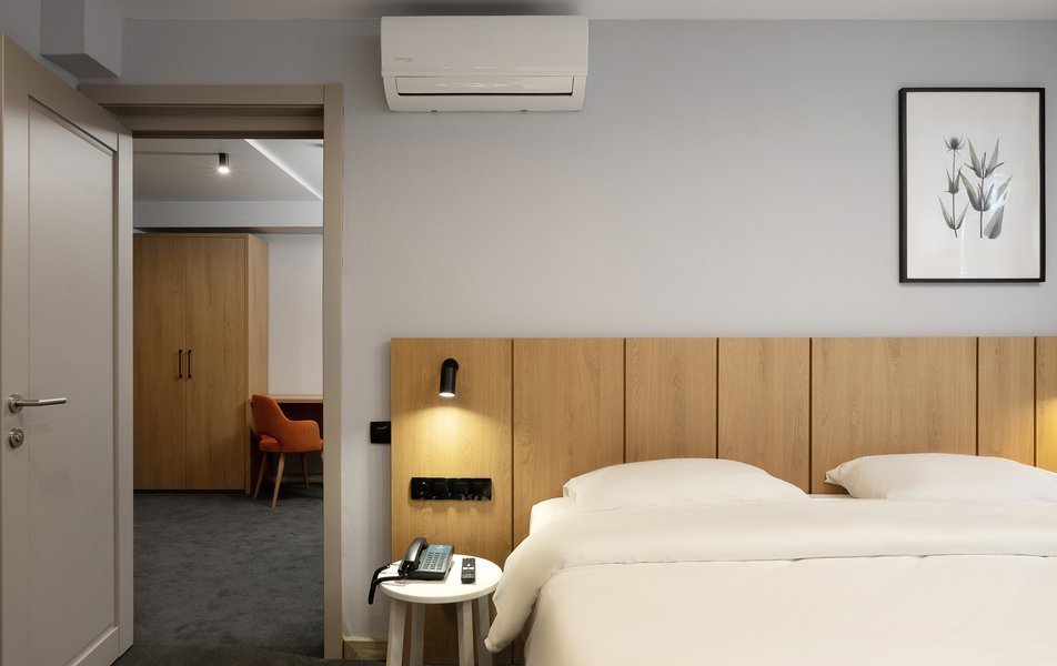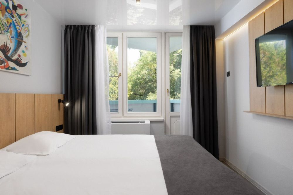 Номер с балконом, оформленный в светло-бежевой цветовой гамме, состоит из спальни, собственной ванной комнаты и оснащён всем необходимым для комфортного отдыха. В санатории используется централизованная система охлаждения – фанкойл.