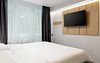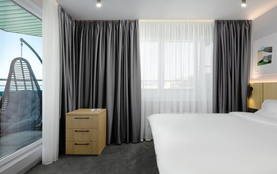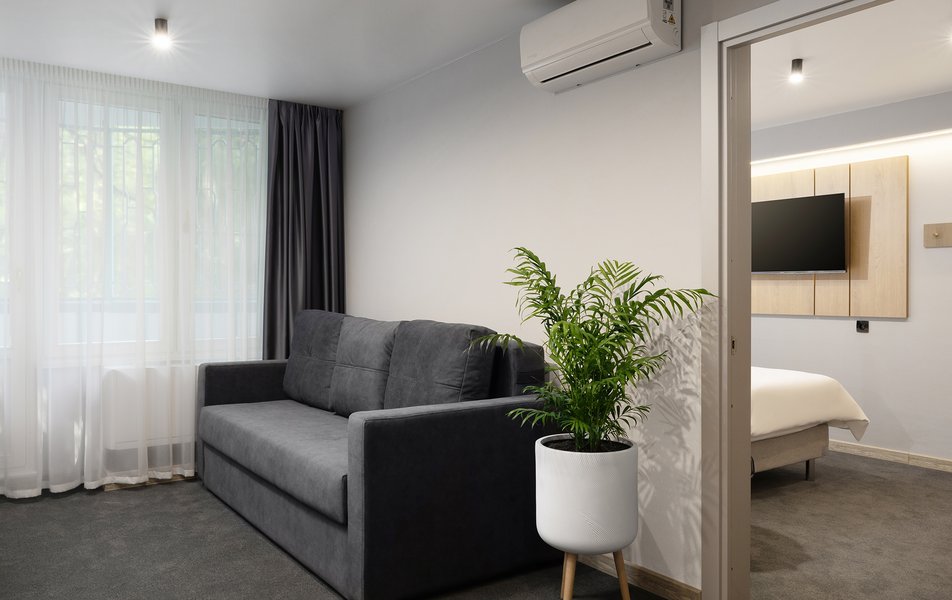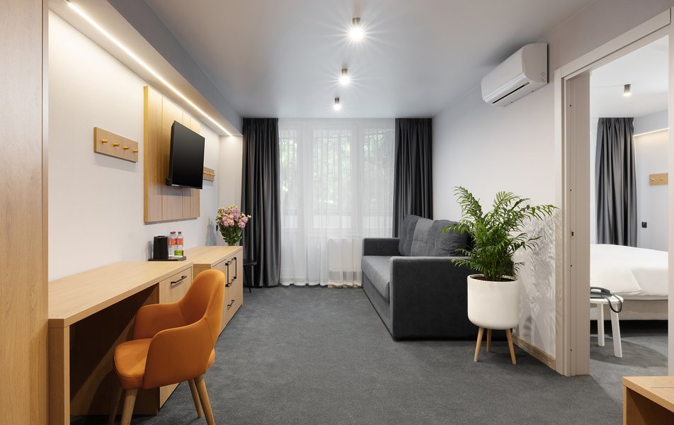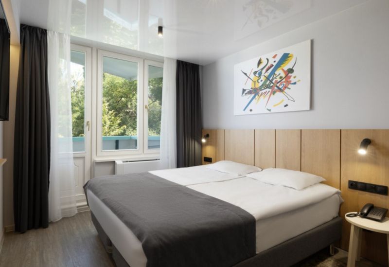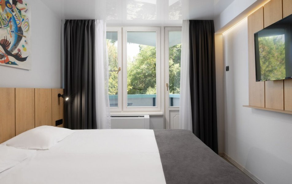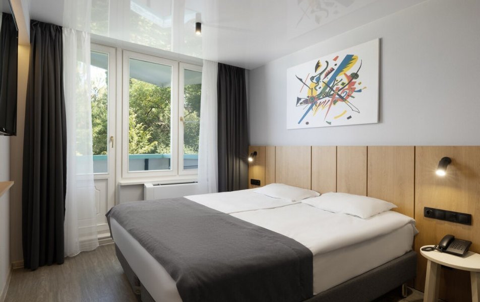 Номер с балконом, оформленный в светлой цветовой гамме, состоит из спальни, собственной ванной комнаты и оснащён всем необходимым для полноценного отдыха. В комнате также имеется раскладное кресло (70*200 см). В санатории используется централизованная система охлаждения – фанкойл.