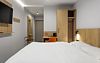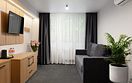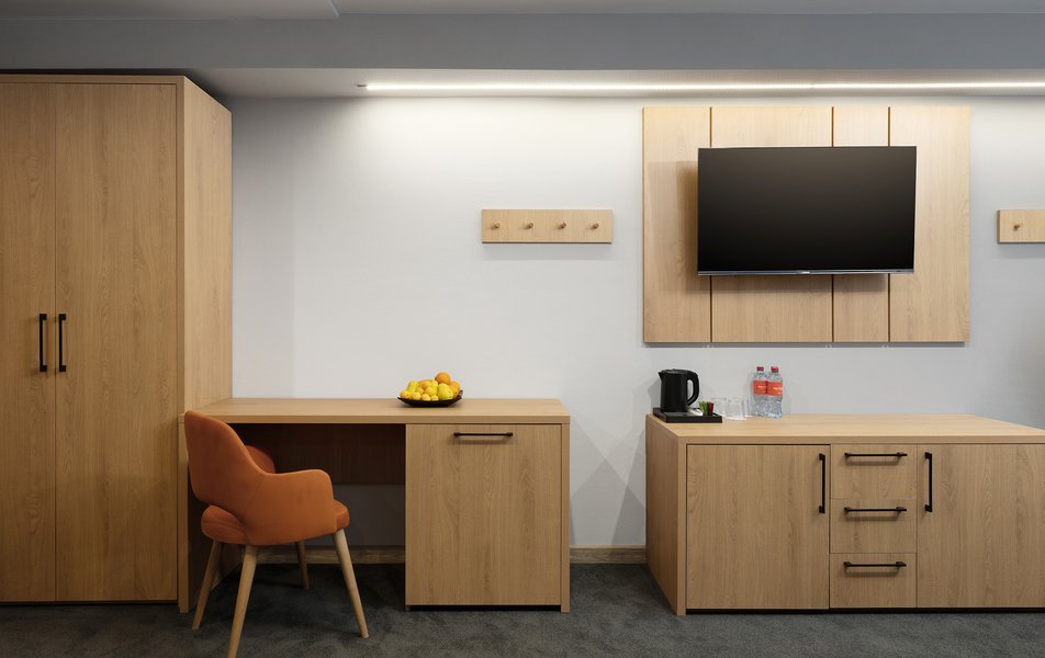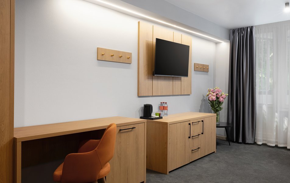 Номер с балконом, оформленный в светло-бежевой цветовой гамме, состоит из спальни, собственной ванной комнаты и оснащён всем необходимым для комфортного отдыха. В комнате также имеется раскладное кресло (70*200 см). В санатории используется централизованная система охлаждения – фанкойл.