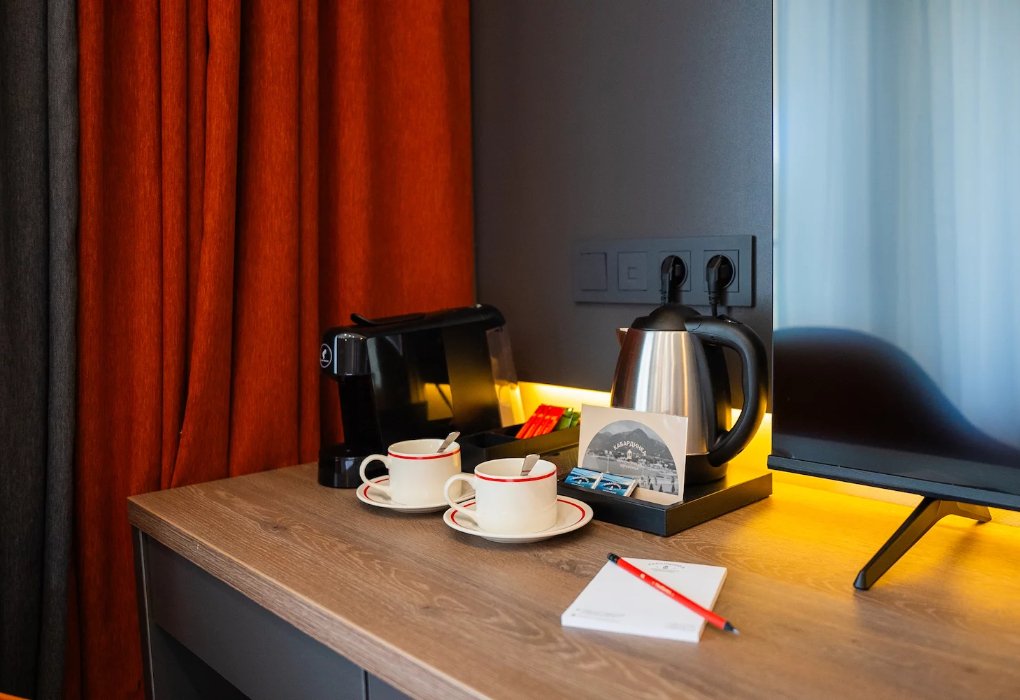 Номер оборудован всем необходимым: ТВ, Wi-Fi, сплит-система, мини-бар, сейф, чайная станция, кофемашина и бутилированная вода.