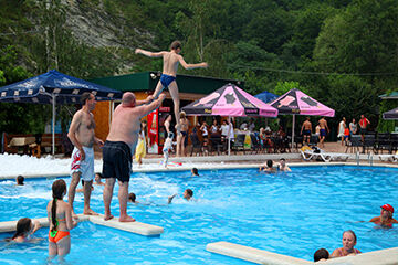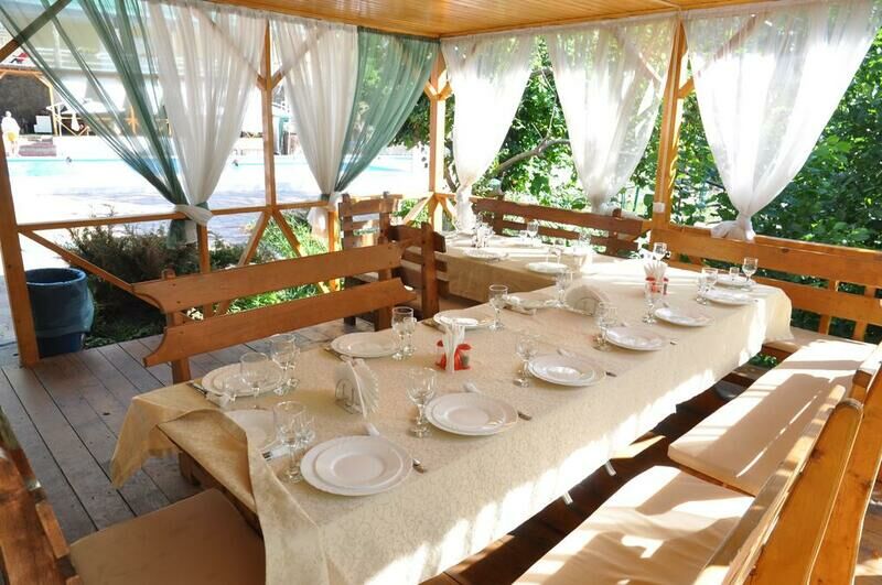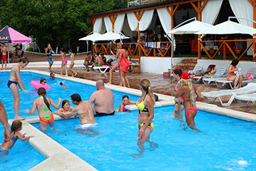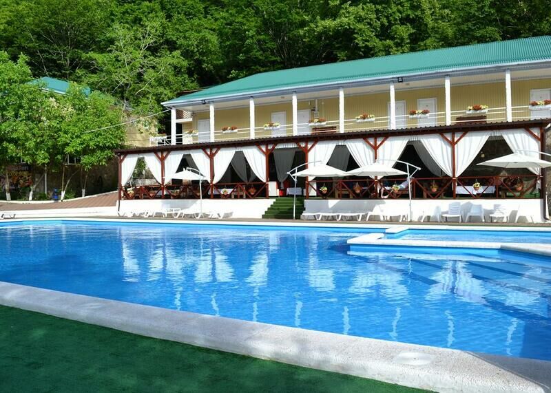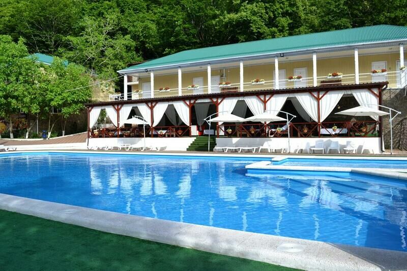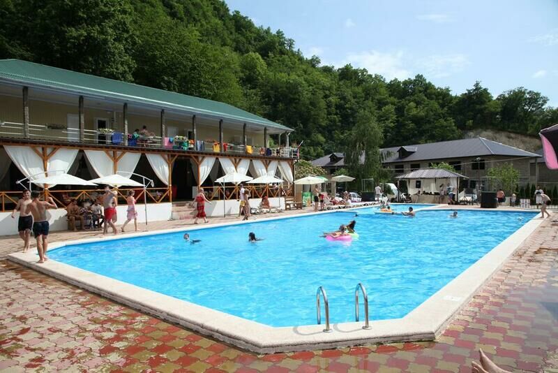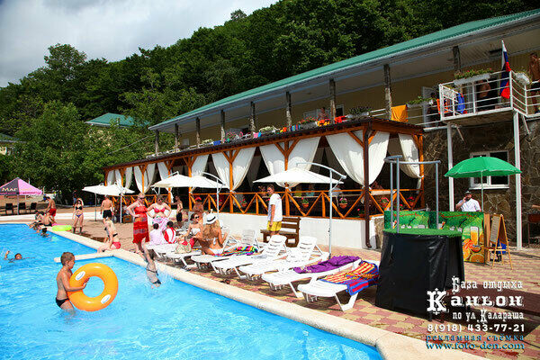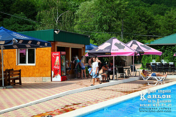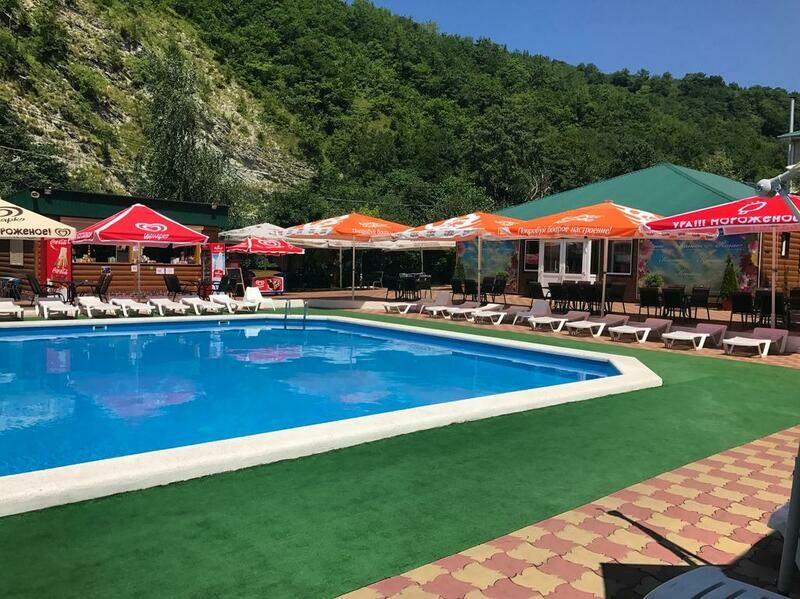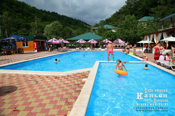 На территории базы отдыха "Каньон" имеется большой бассейн, шезлонги и бар с большим ассортиментом для комфортного отдыха.