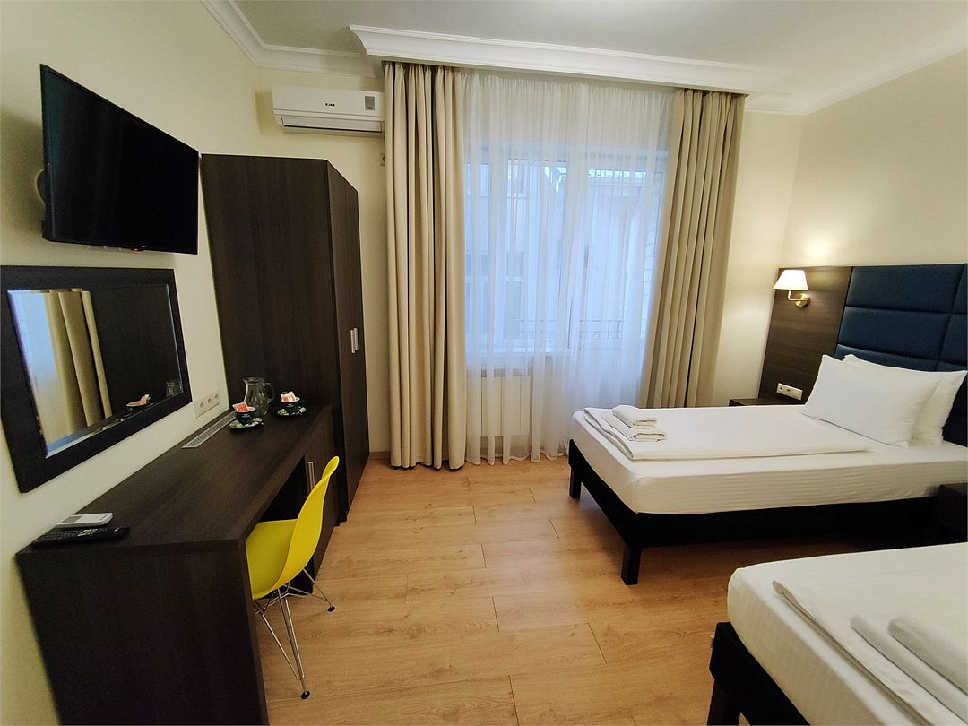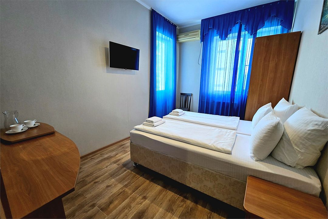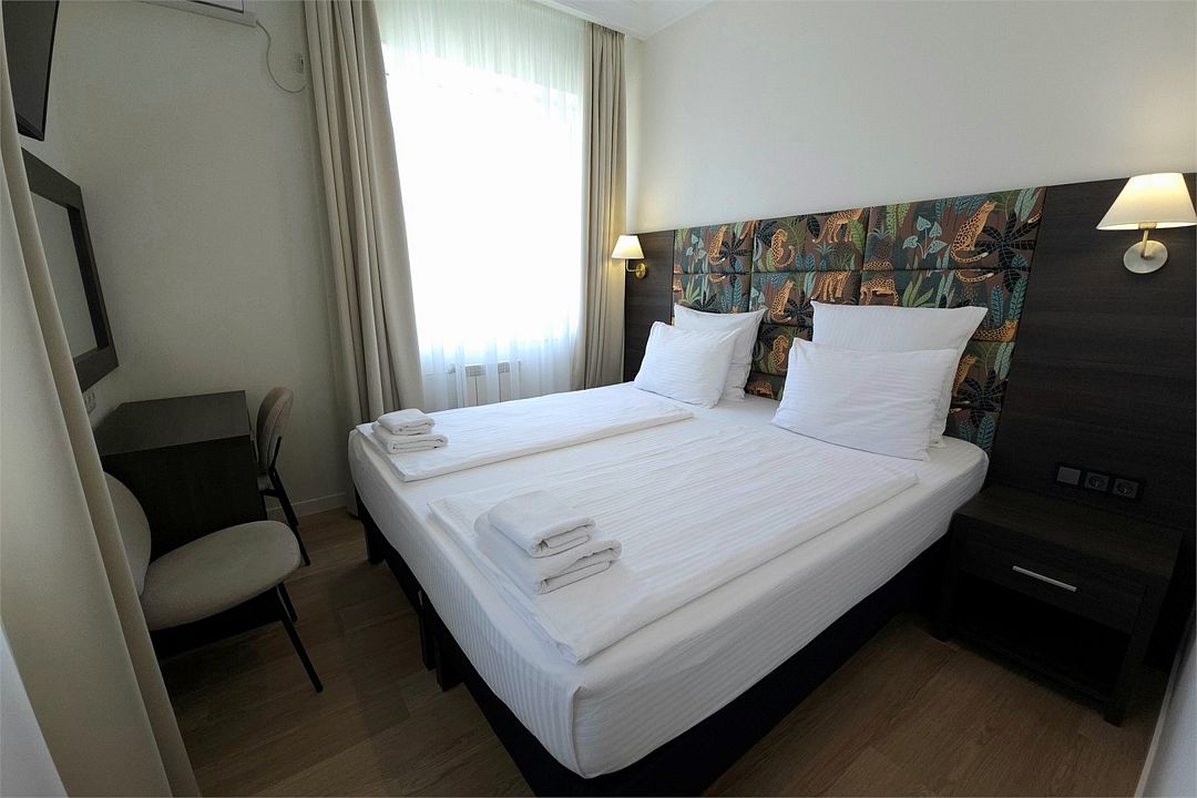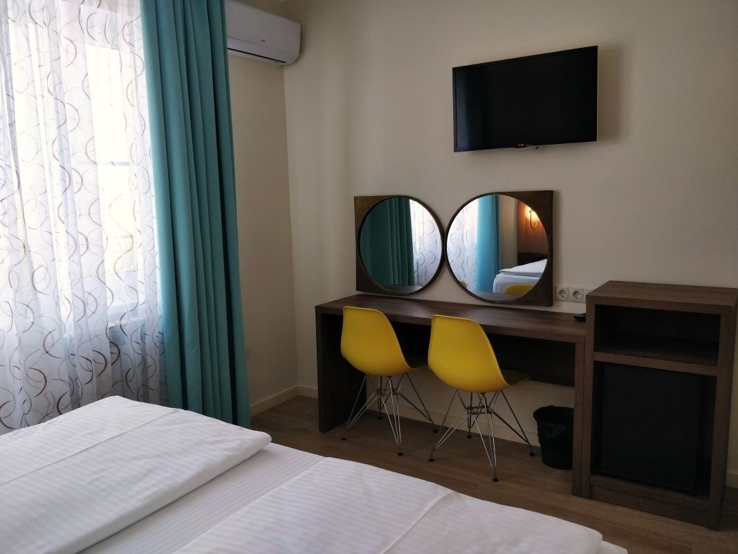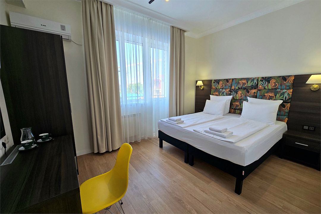 Стандарт Плюс - обновленный номер 19 квадратных метров. Современный интерьер, двуспальная кровать 180см или две кровати 90см, кондиционер, Wi-Fi, ТВ, рабочий стол, мини холодильник, балкон.Услуги и удобства