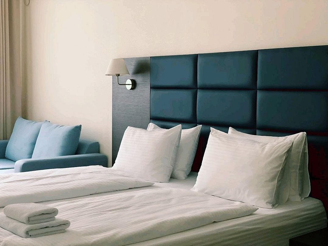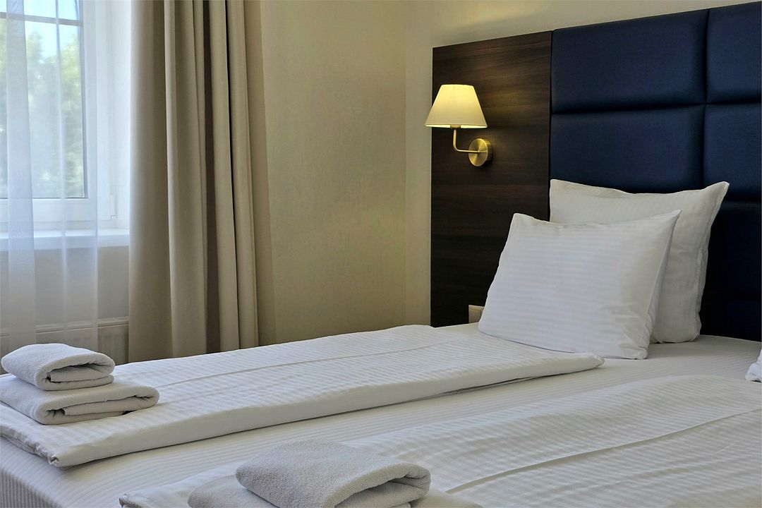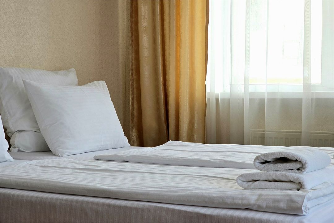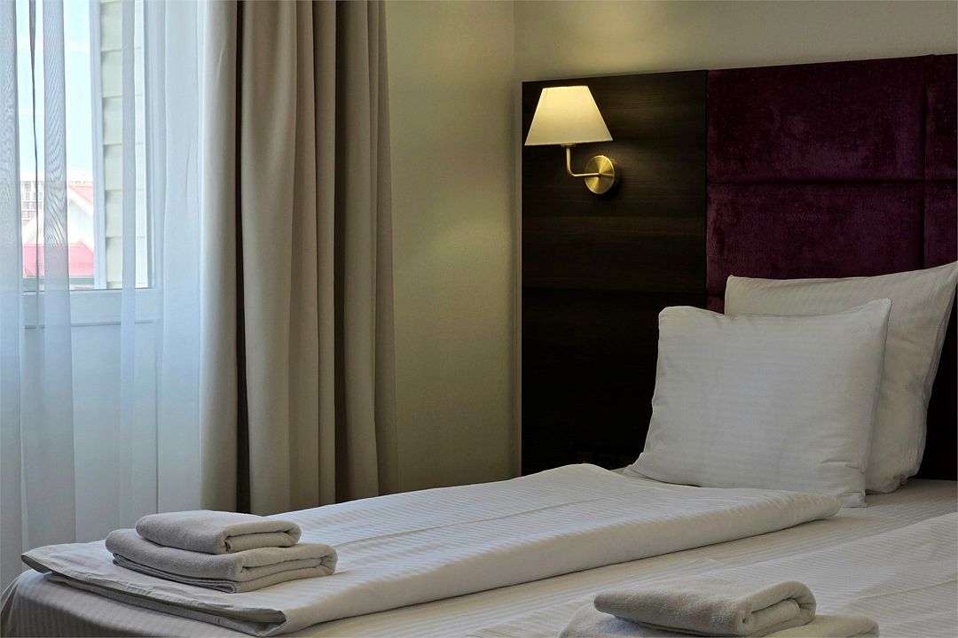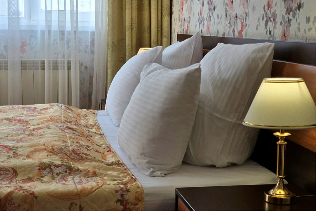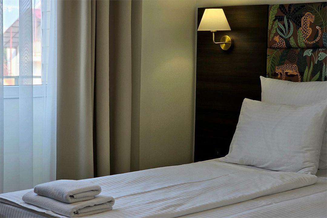 Однокомнатный номер с новой мебелью и балконом. Санузел с душевой кабиной и феном. В 2021 году проведена полная реконструкция. Современный дизайн в спокойных тонах. Мягкие прикроватные панели с светильниками у изголовья. Подходит для проживания 1 - 2 человек + ребенок до 6 лет. На этаже расположен кулер с водой и гладильная доска с утюгом. Для того чтобы воспользоваться микроволновкой, обратитесь к администратору. На территории летний бассейн с детской чашей и подогревом воды. Рядом с отелем находится Аквапарк "Тики-Так".Услуги и удобства