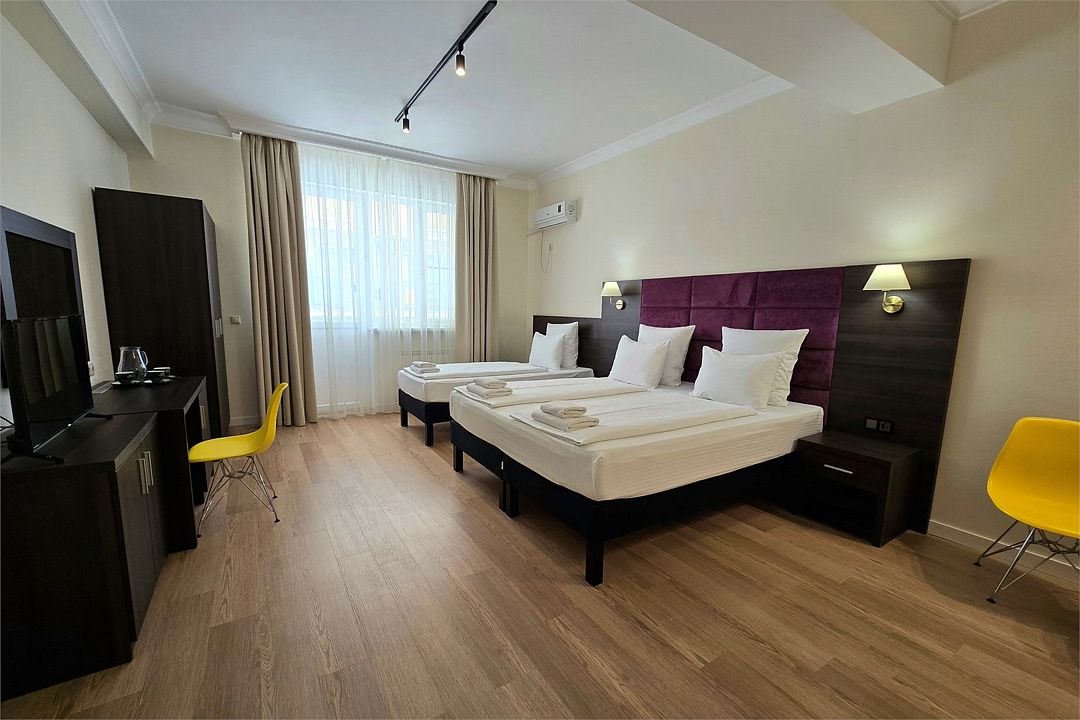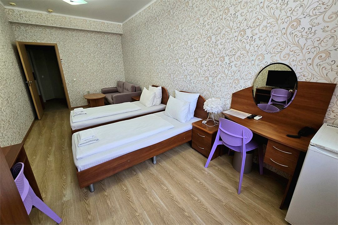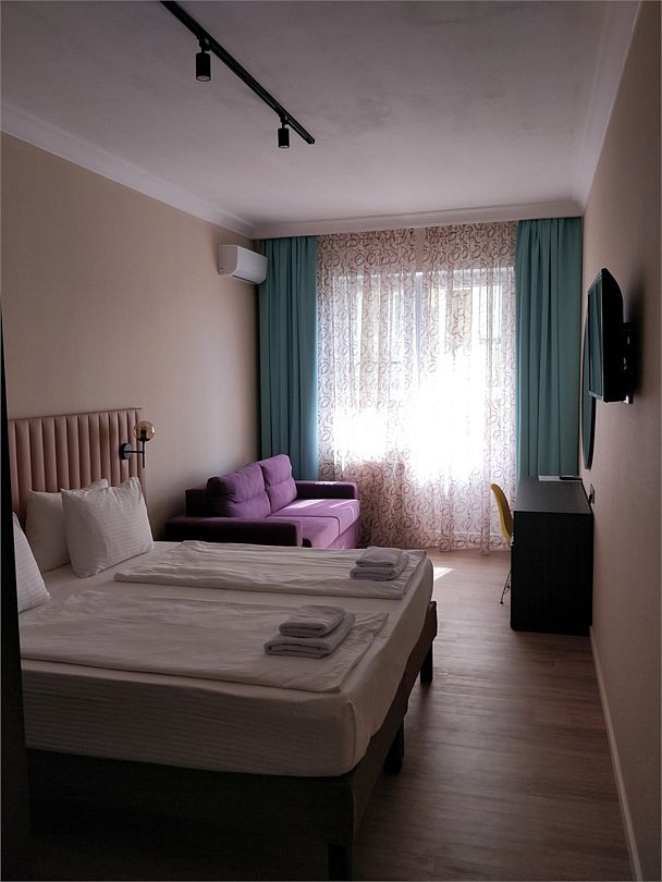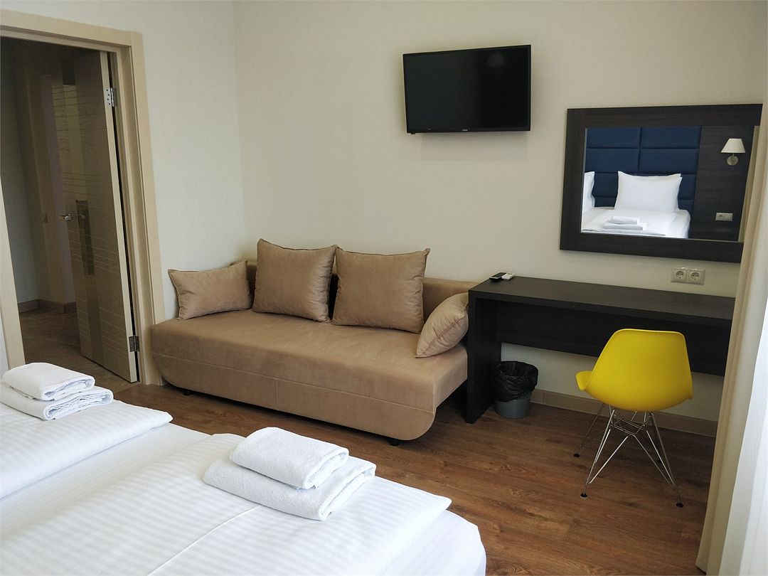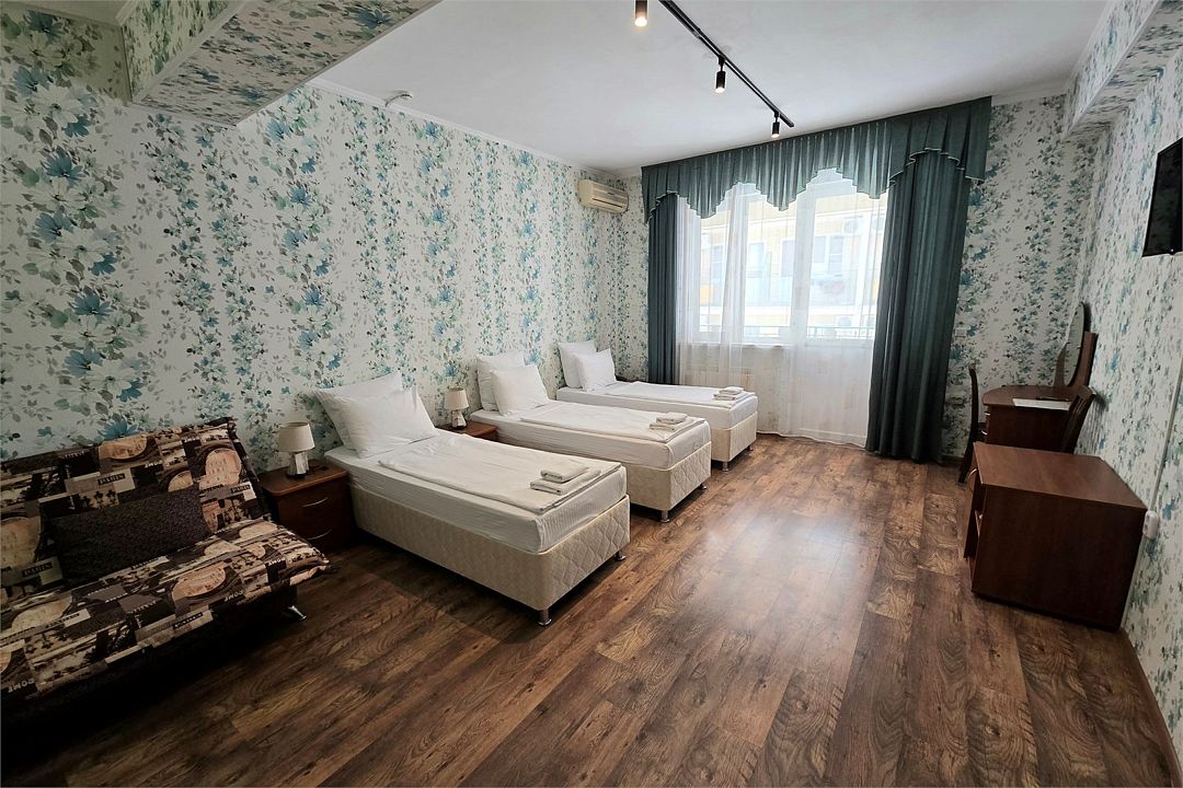 Семейный 2-комн. Плюс - просторный двухкомнатный семейный номер 35 м². Два телевизора, два кондиционера, собственный санузел, шторы блэкаут, балкон, Wi-Fi.Услуги и удобства