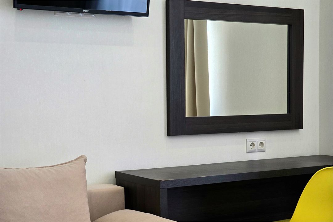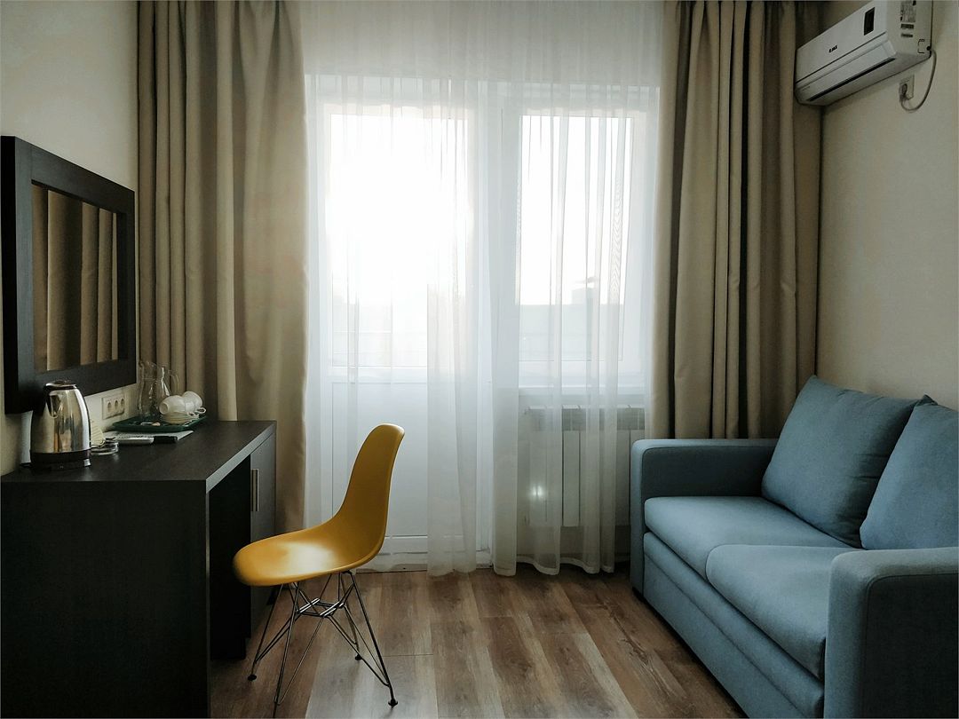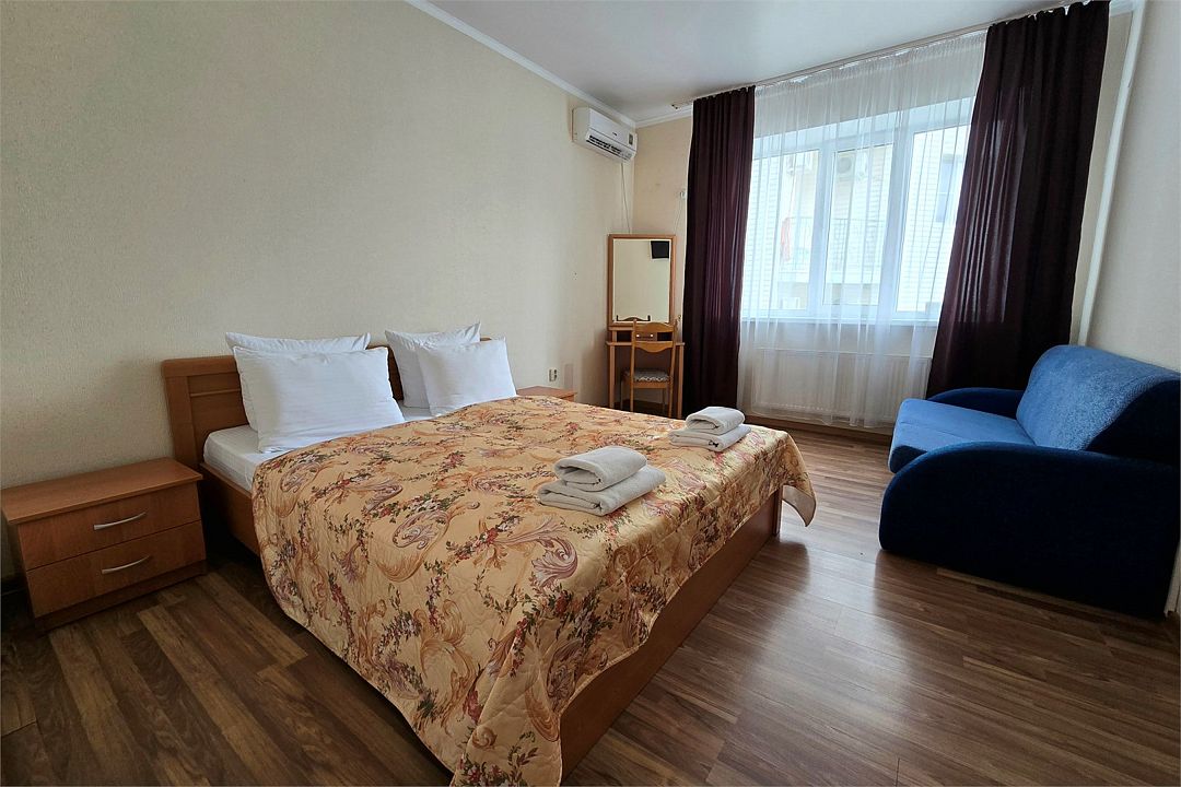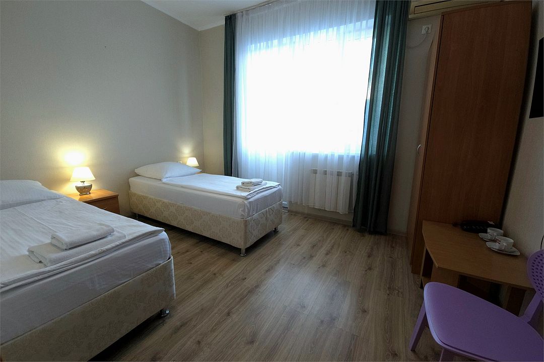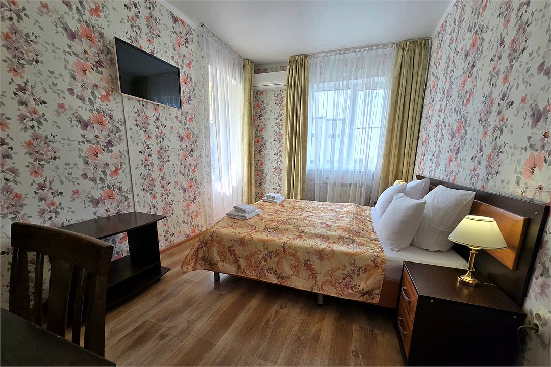 Однокомнатный номер с душем и балконом. Дизайн в классическом стиле. Подходит для проживания 1 - 2 человек + ребенок до 8 лет. На этаже расположены кулер с холодной, горячей водой и гладильная доска с утюгом. Чтобы воспользоваться микроволновкой, обратитесь к администратору. На территории летний бассейн с детской чашей и подогревом воды. Рядом с отелем находится Аквапарк "Тики-Так".Услуги и удобства