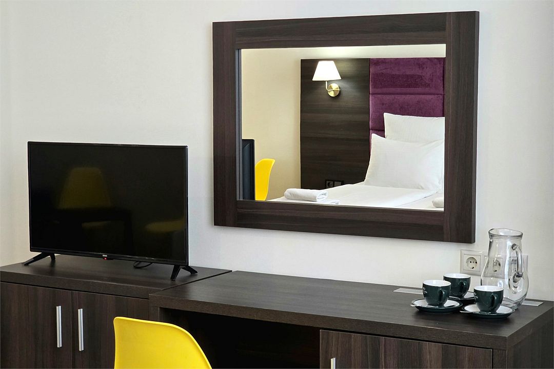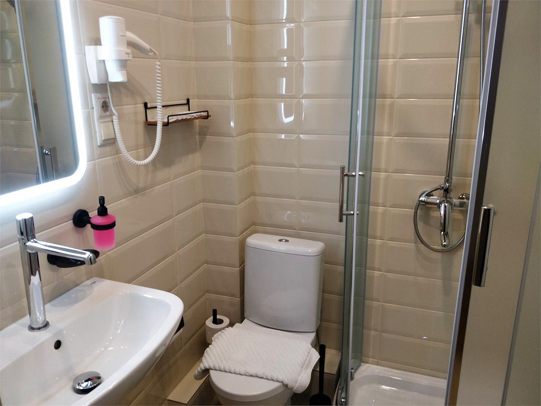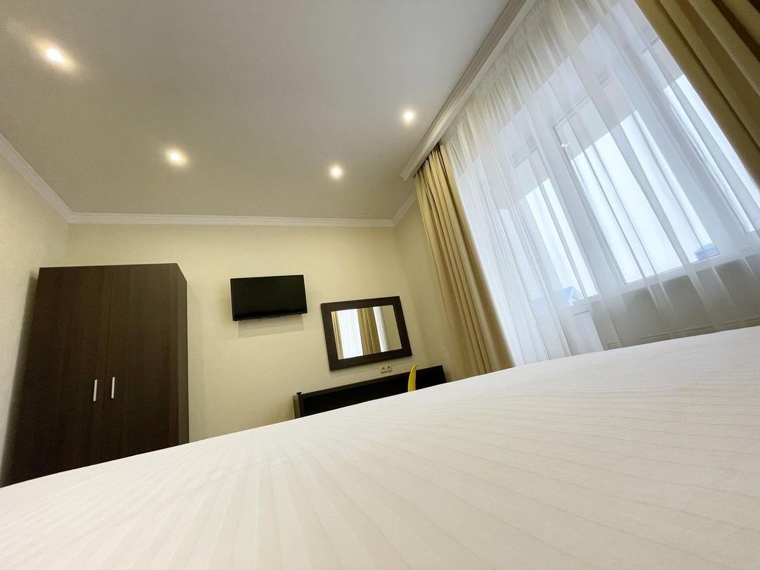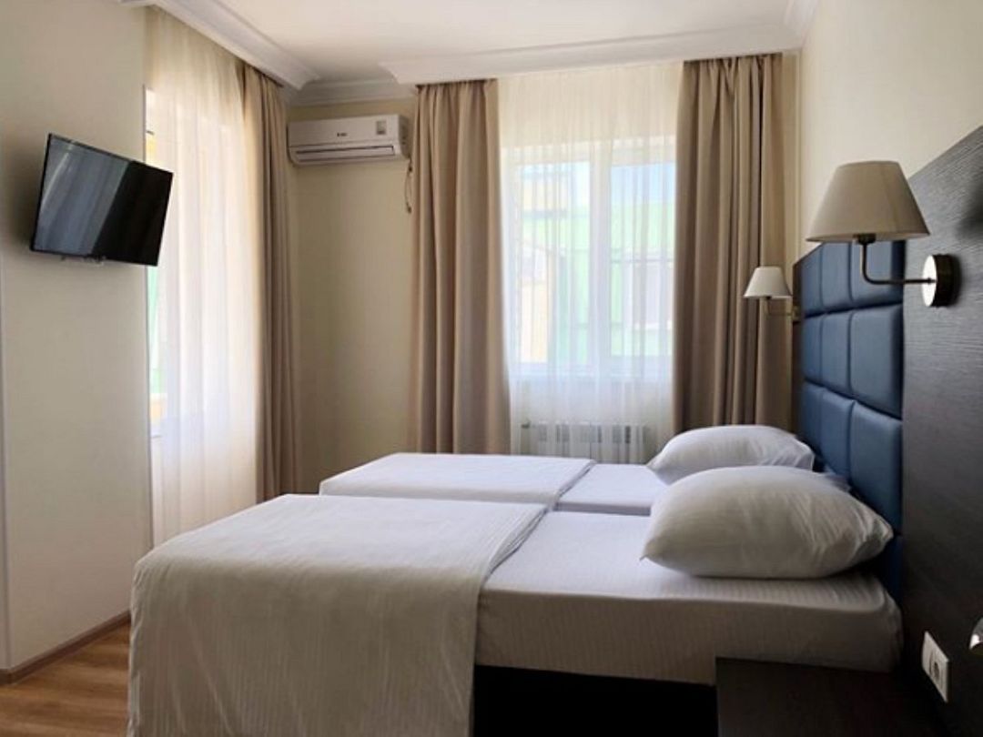 Однокомнатный номер с душем и балконом. Дизайн в классическом стиле. Подходит для проживания 1 - 2 человек + ребенок до 8 лет. На этаже расположены кулер с холодной, горячей водой и гладильная доска с утюгом. Чтобы воспользоваться микроволновкой, обратитесь к администратору. На территории летний бассейн с детской чашей и подогревом воды. Рядом с отелем находится Аквапарк "Тики-Так".Услуги и удобства