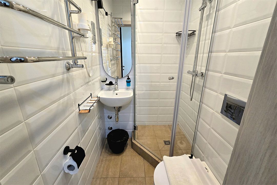Однокомнатный номер с диваном и балконом. Санузел с душевой кабиной и феном . В 2021 году проведена полная реконструкция. Современный дизайн в спокойных тонах. Мягкие прикроватные панели с светильниками у изголовья. Подходит для проживания 1 - 2 -3-х человек + ребенок до 6 лет. Есть возможность поставить детскую кроватку для ребенка до 3-х лет. На этаже расположен кулер с водой и гладильная доска с утюгом. Для того чтобы воспользоваться микроволновкой, обратитесь к администратору.Услуги и удобства