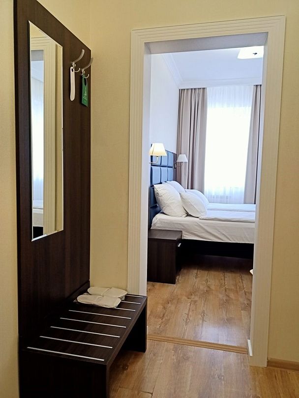 Бронировал стандартный номер, а достался семейный квартирного типа - фактически однокомнатная квартира. Номер достался на третьем этаже. окна на восток и юг. Лифта в этом корпусе нет, всего в отели три корпуса, в первом лифт точно есть, про второй не скажу - не бывал. Отель расположен прямо на Пионерском проспекте - основной магистрале. До пляжной линии минут 15 пешком, до аэропорта минут 20 на такси, до Эры 15 минут пешком.