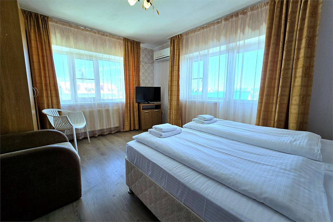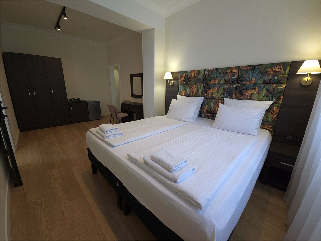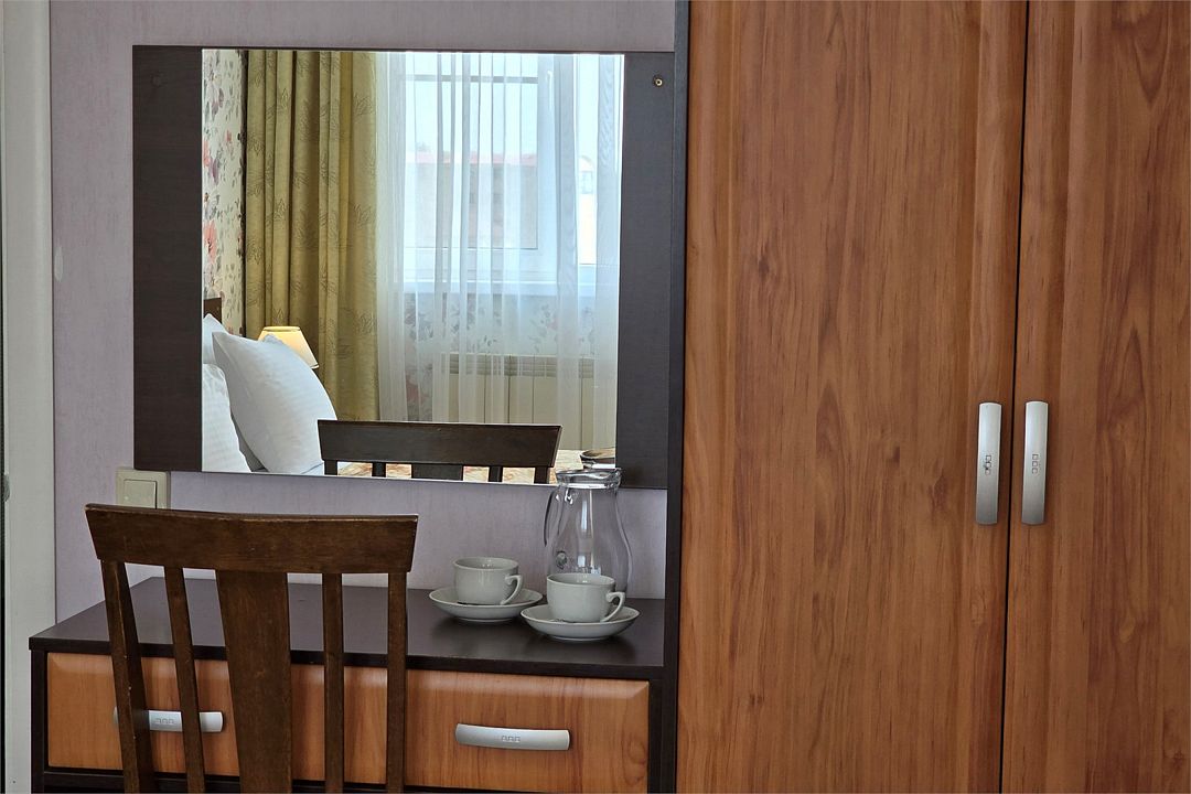 Wi-Fi, интернет, душевая кабина, санузел, банные полотенца, гигиенические средства, балкон, кровать «King size», две односпальные или большая двуспальная кровать, ортопедический матрас, тумбы, стулья, шкаф для одежды, вешалки, багажная тумба, зеркало, чайный набор, унитаз, раковина, отопление, душ, кулер на этаже, плиточное покрытие, вид во двор, ламинат, столовые приборы, туалетный столик, туалетный столик, туалетные средства, сплит-система, сушилка для белья, диван-кровать, раскладной диван, телевизор с плоским экраном, мини-холодильник, москитная сетка, номер для некурящих, общественный бассейн, уборка номера, услуги прачечной (платно), вешалки-плечики, мыло, затемняющая штора, прачечная (за дополнительную плату), уличная мебельВ гостиничном номере