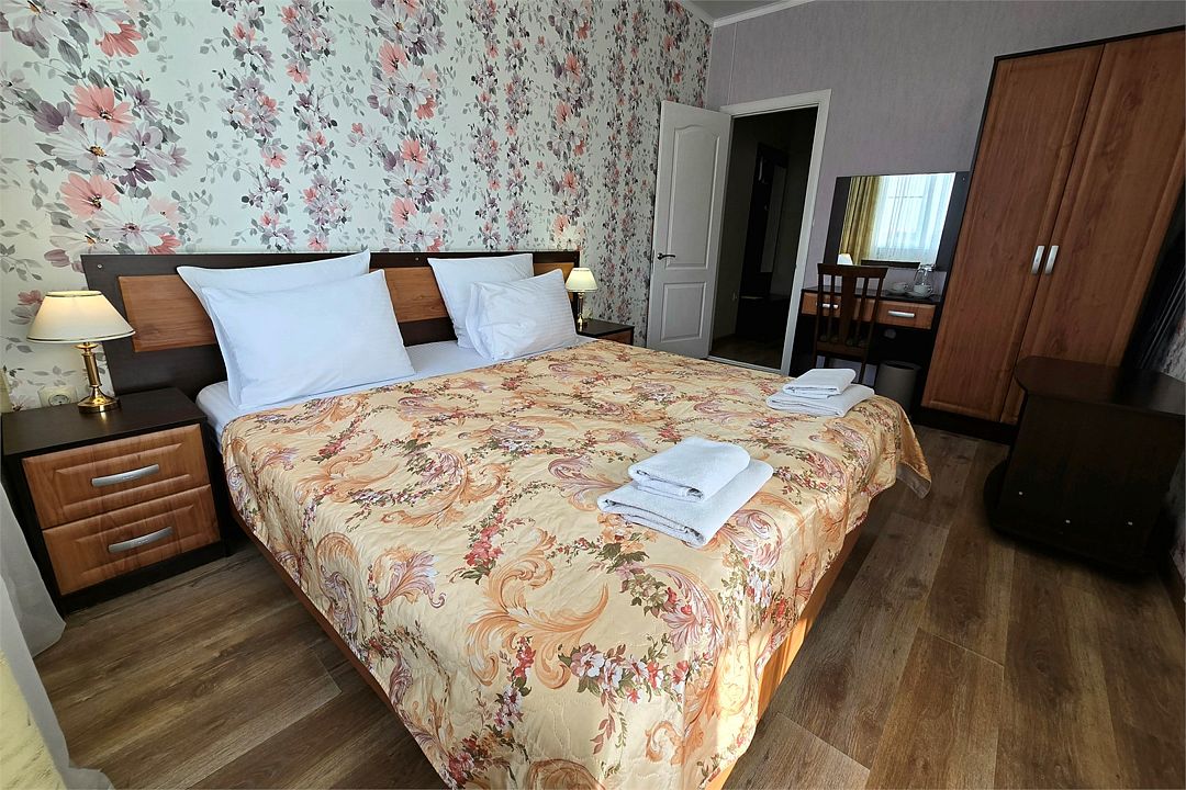 Двухкомнатный номер с балконом. Одна из комнат проходная. Санузел с душевой кабиной и феном. В 2021 году проведена полная реконструкция. Современный дизайн в спокойных тонах. Мягкие прикроватные панели с светильниками у изголовья. В каждой комнате кондиционер, телевизор, кровать. Это очень удобно, если Вы приехали с друзьями или с детьми. Дети могут спать в отдельной комнате, смотреть детские передачи по телевизору. Кондиционер, в детской комнате, можно включить на комфортный для них режим. В то же время, родители в своей комнате могут смотреть взрослые передачи и включить кондиционер на более прохладный режим (летом). Для того чтобы воспользоваться микроволновкой, обратитесь к администратору. На этаже расположен кулер с водой и гладильная доска с утюгом. Подходит для проживания 2 - 4 человек + 2 детей до 6 лет. Есть возможность поставить детскую кроватку для ребенка до 3-х лет.Услуги и удобства