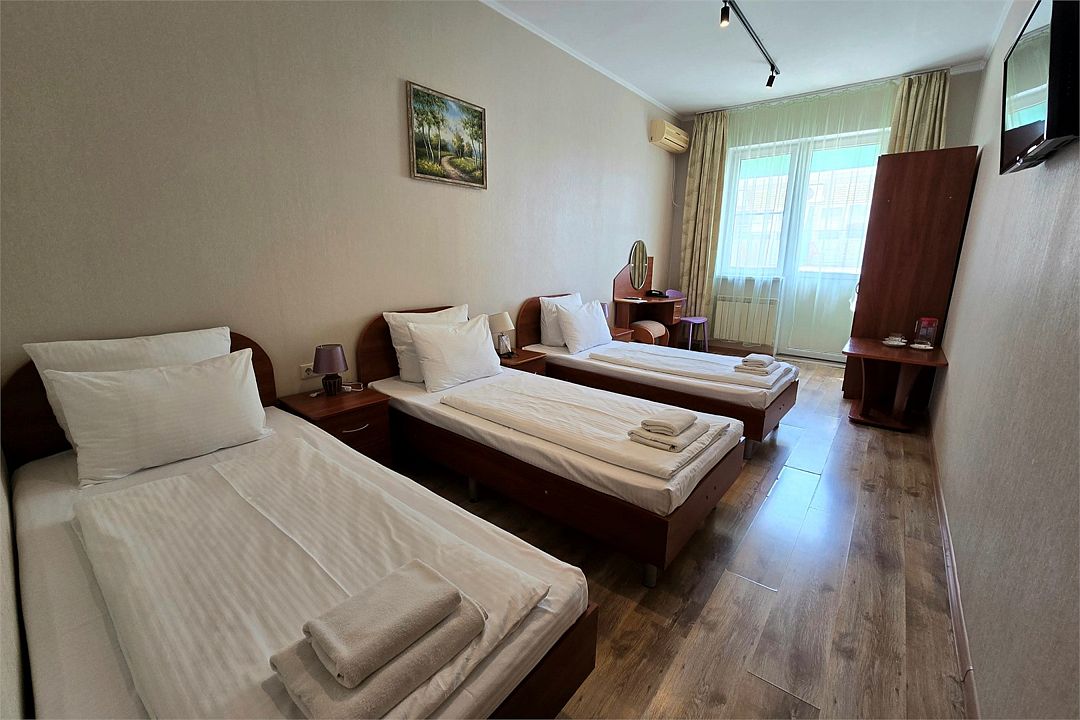 Номер с балконом. На территории летний бассейн с детской чашей и подогревом воды. Рядом с отелем находится Аквапарк "Тики-Так". На этаже расположен кулер с водой и гладильная доска с утюгом. Для того чтобы воспользоваться микроволновкой, обратитесь к администратору.Услуги и удобства