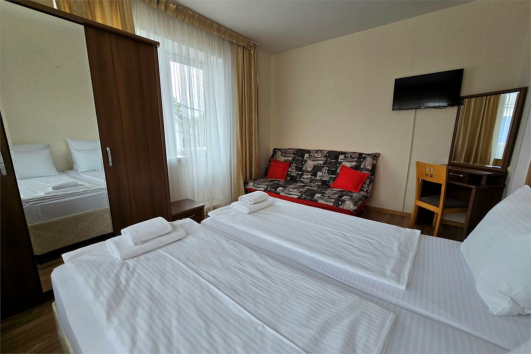 телевизор, Wi-Fi, холодильник, кондиционер, душевая кабина, санузел, банные полотенца, лоджия, две односпальные или большая двуспальная кровать, диван, шкаф для одежды, унитаз, раковина, три односпальные кровати, вид во двор, диван-кровать, общественный бассейн, уборка номераВ гостиничном номере