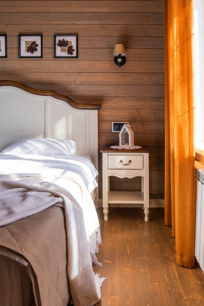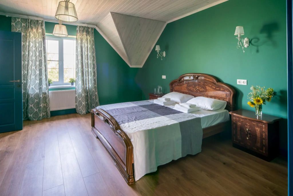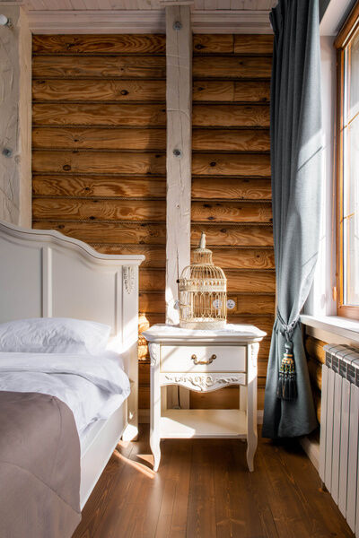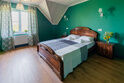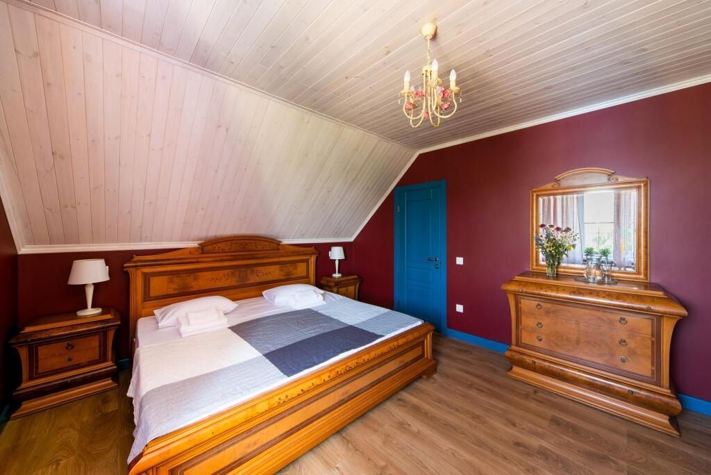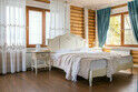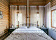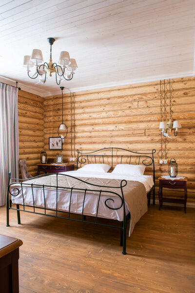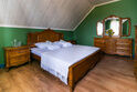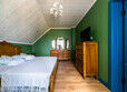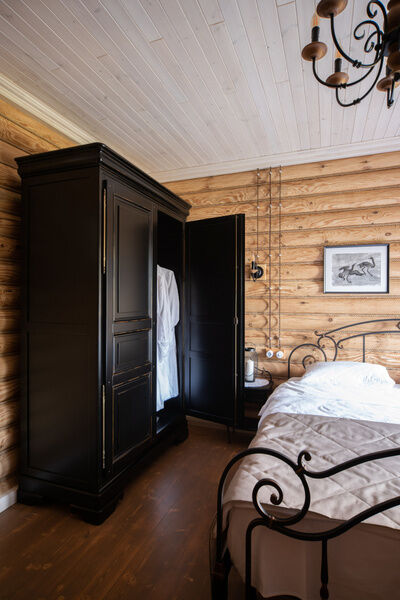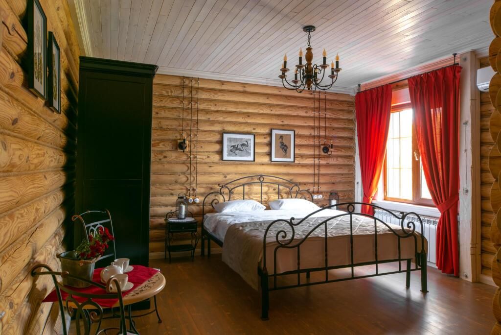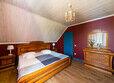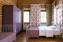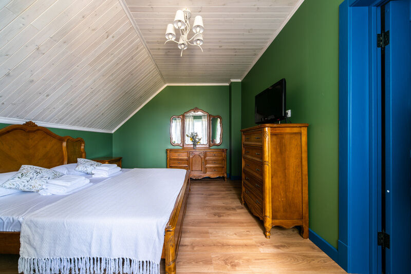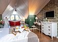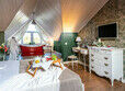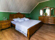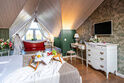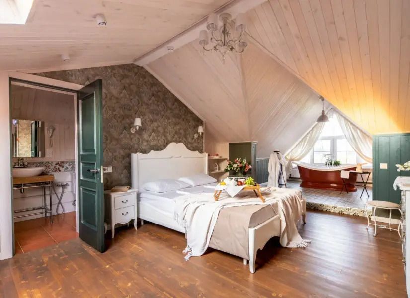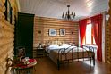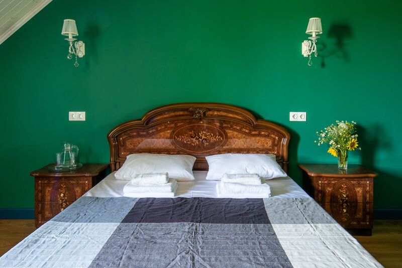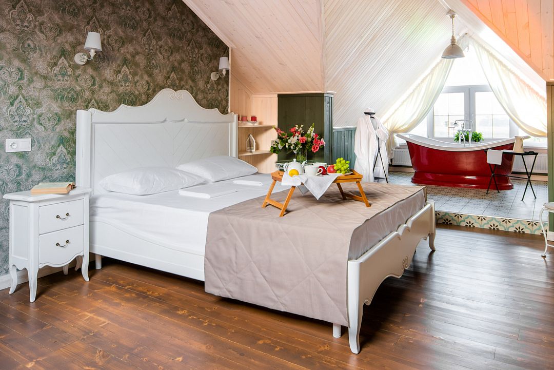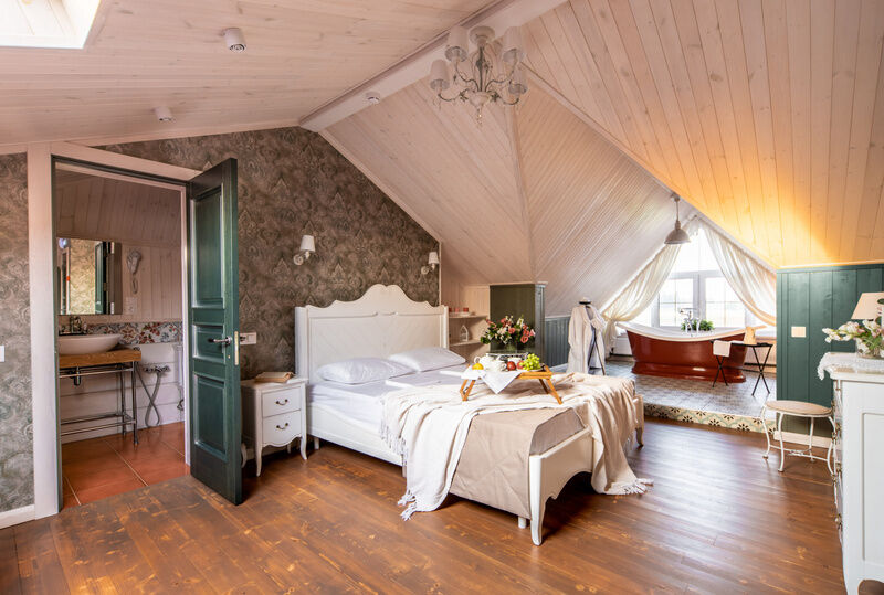 «Свадебный» номер – это комфортабельный номер с романтической атмосферой. Он находится на втором мансардном этаже, откуда открываются прекрасные пейзажи на территорию усадьбы и ее окрестности. А огромная ванна, стоящая у окна, придает ему еще больше романтики. Номер оснащен большой двухместной кроватью и одноместным диваном.
