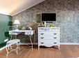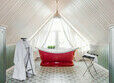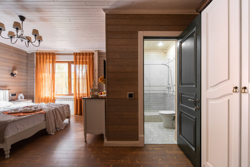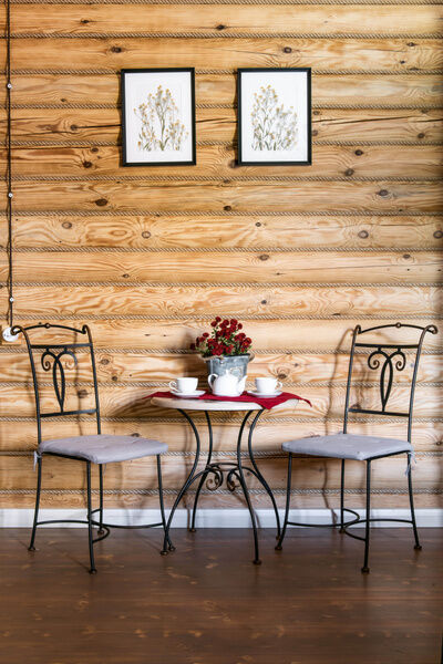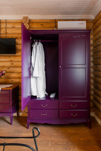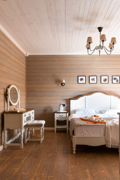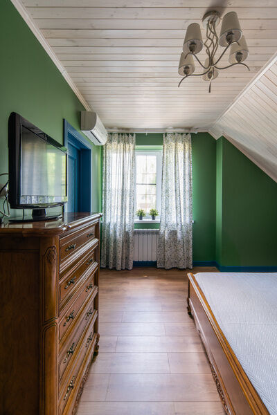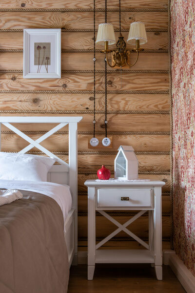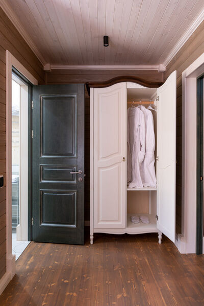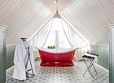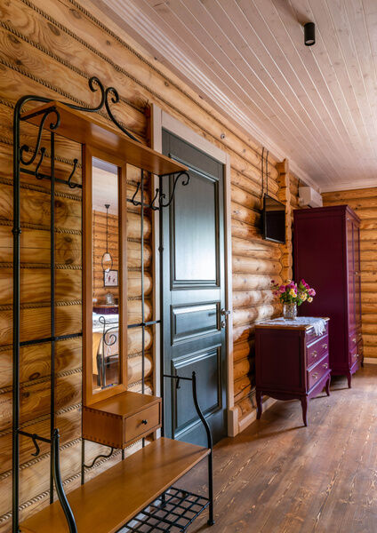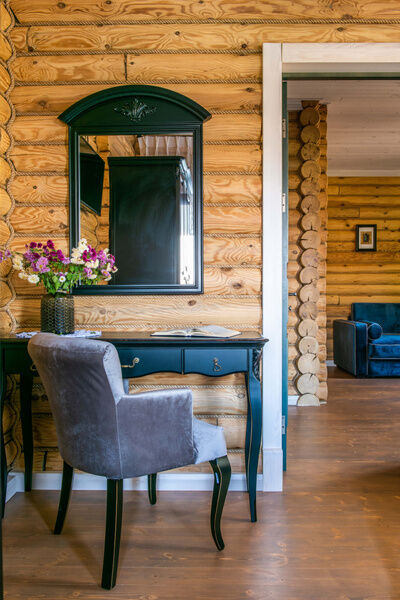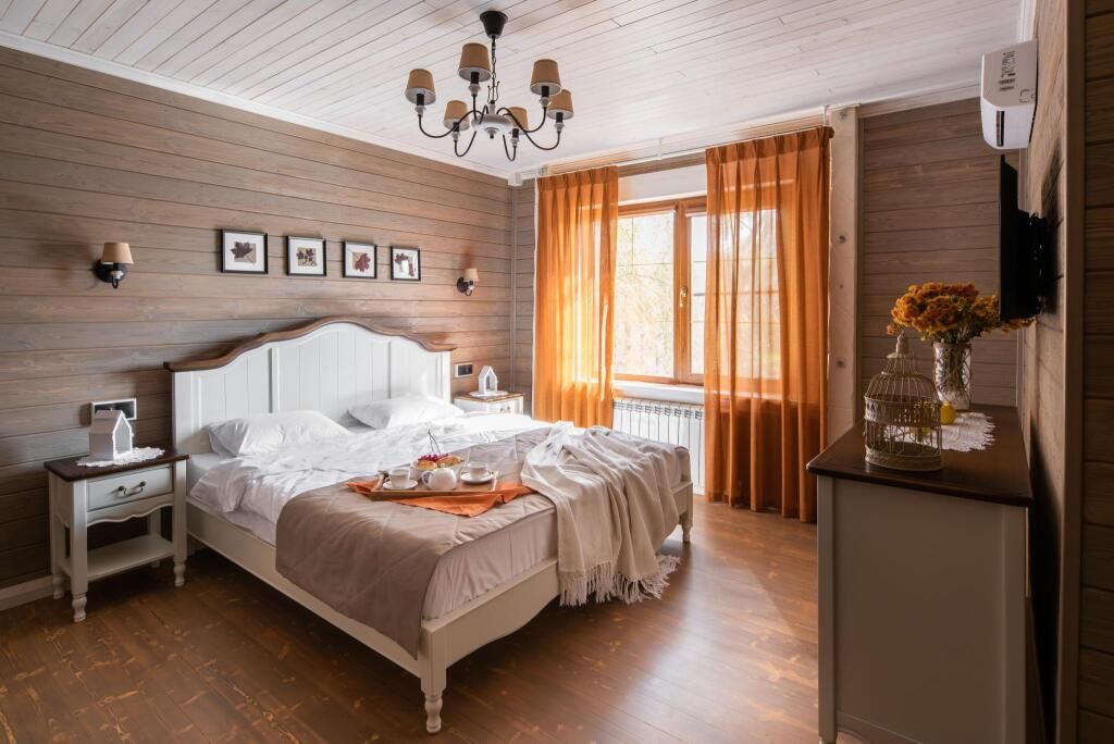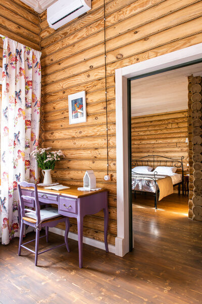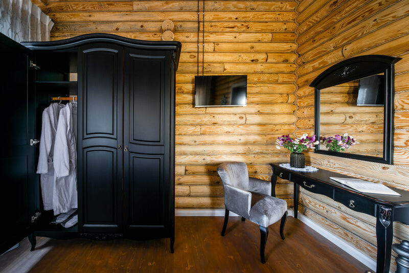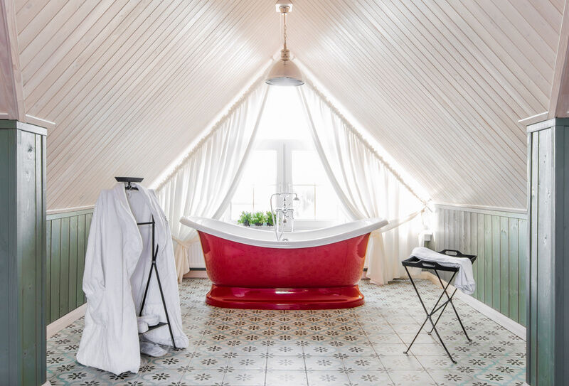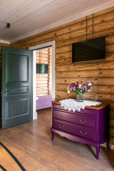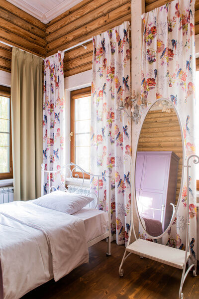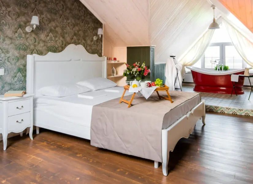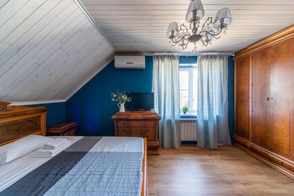 «Свадебный» номер – это комфортабельный номер с романтической атмосферой. Он находится на втором мансардном этаже, откуда открываются прекрасные пейзажи на территорию усадьбы и ее окрестности. А огромная ванна, стоящая у окна, придает ему еще больше романтики. Номер оснащен большой двухместной кроватью и одноместным диваном.