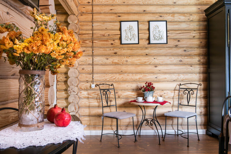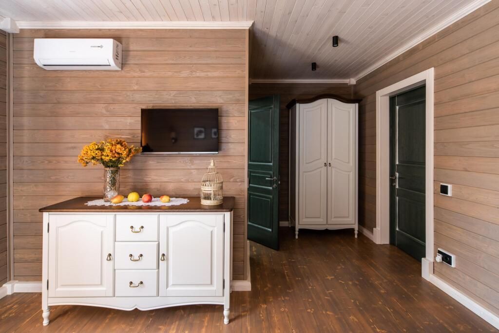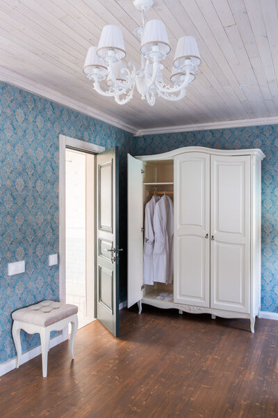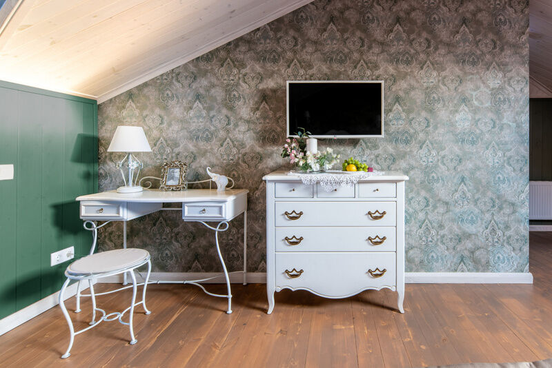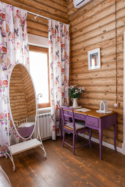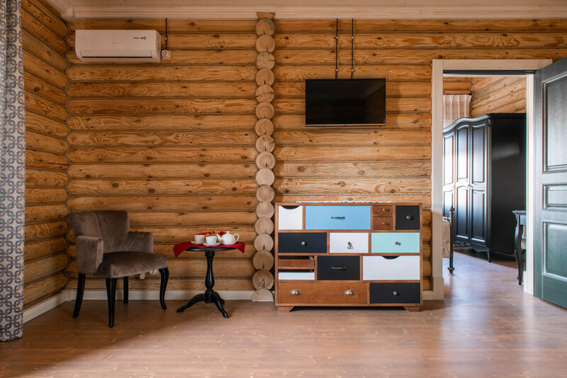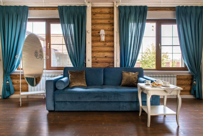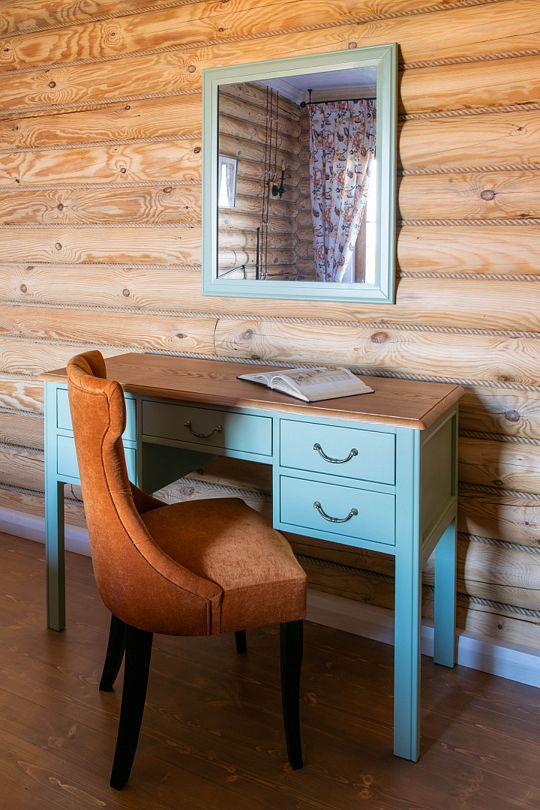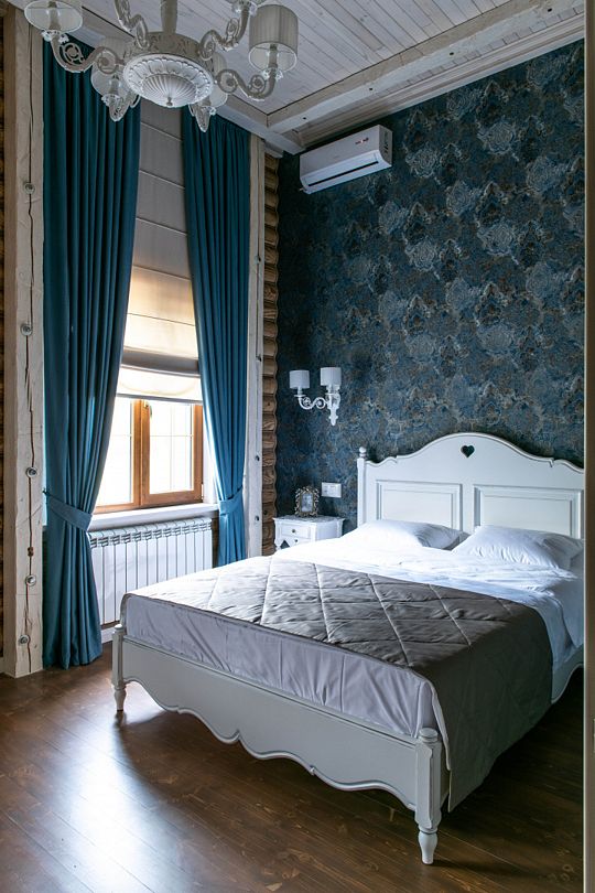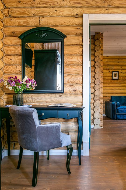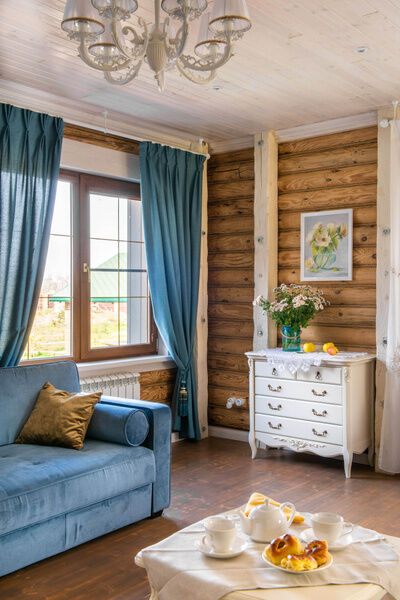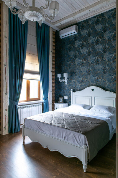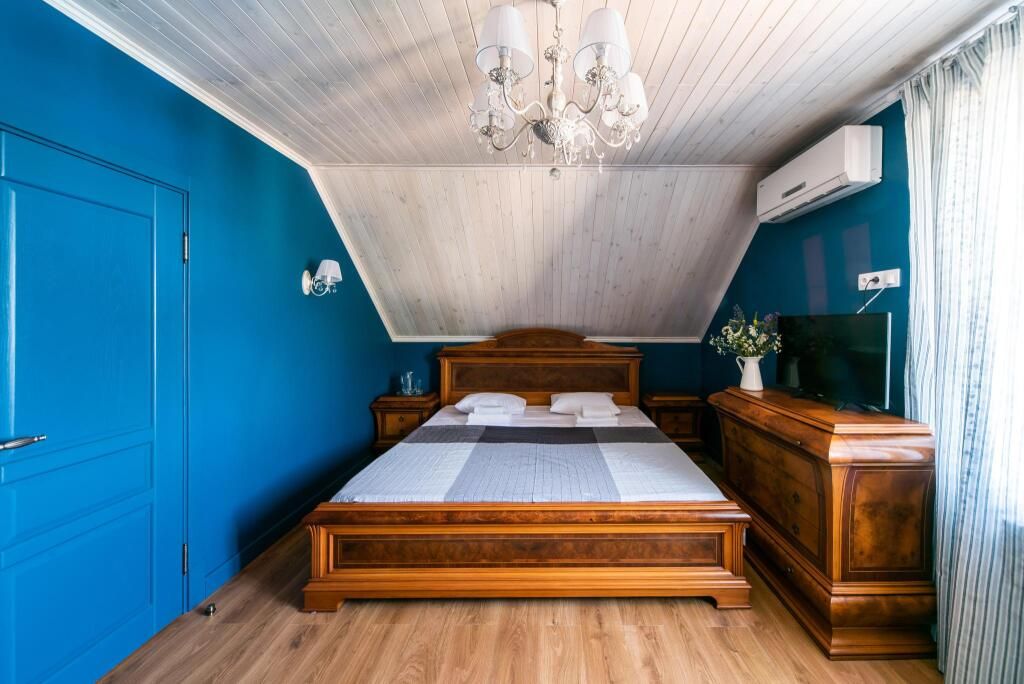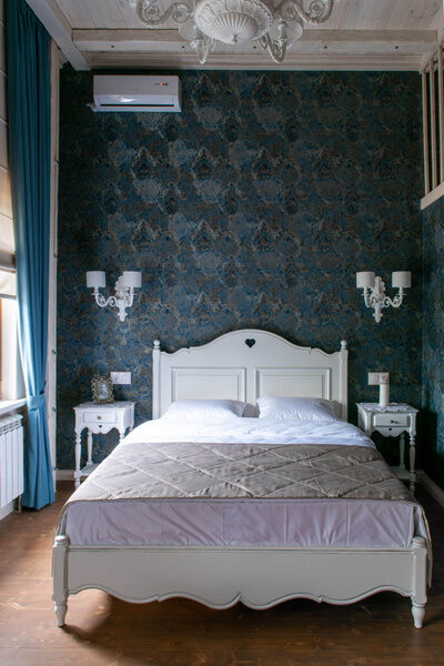 Номер Романтик светлый, комфортный. В нем классическая мебель из натурального дерева. Дизайн помещения выполнен в приятных голубых тоннах. Окна номера выходят на внутренний дворик и маленький пруд, это одна из самых светлых и просторных комнат.