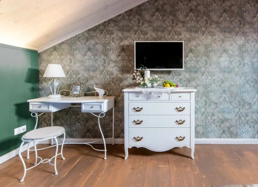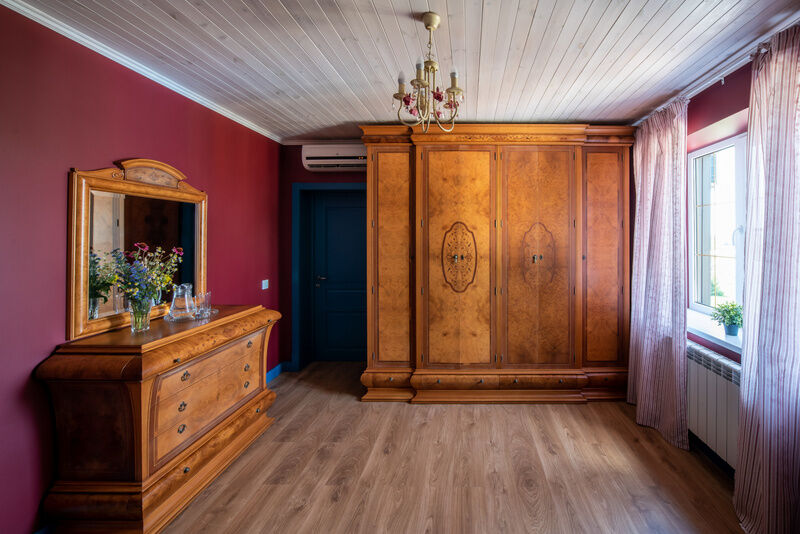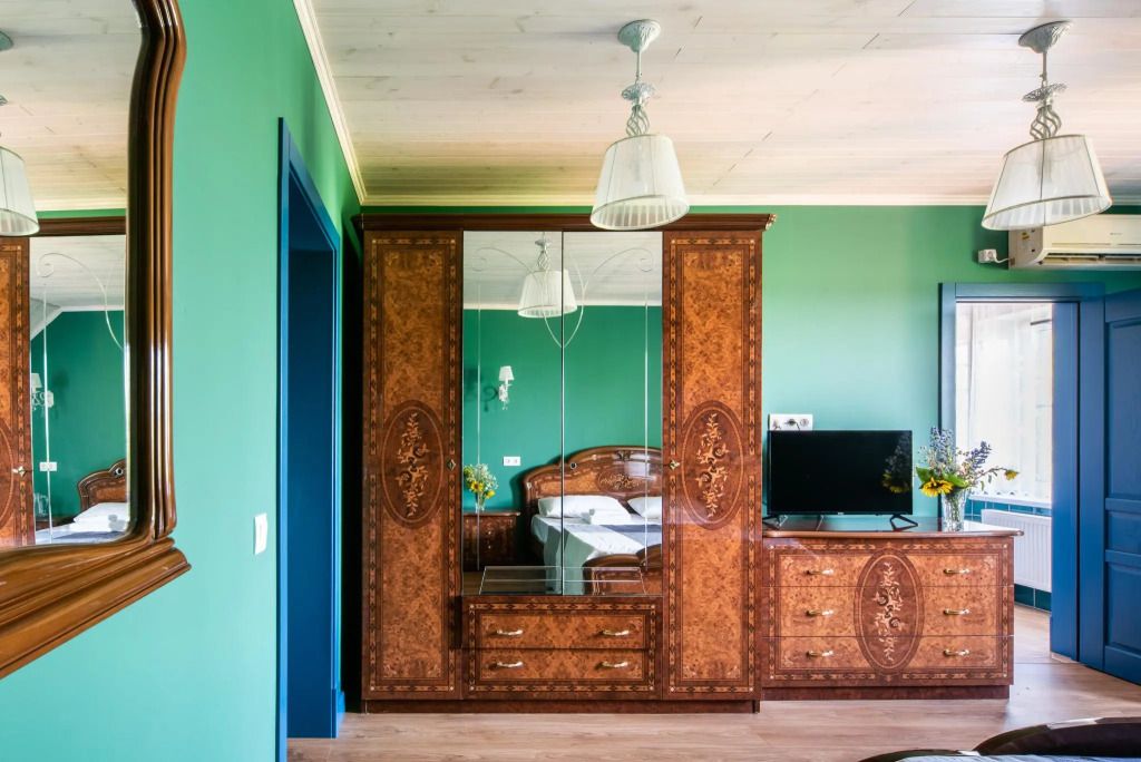 Номер укомплектован антикварной мебелью из дерева. Санузел и душ находятся в номере. Великолепный вид из окна на бассейн и пруд.