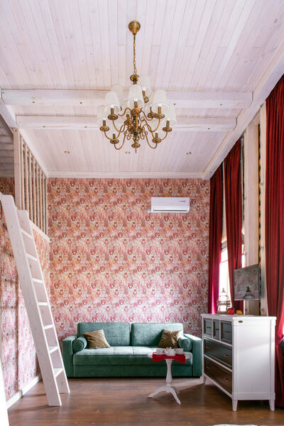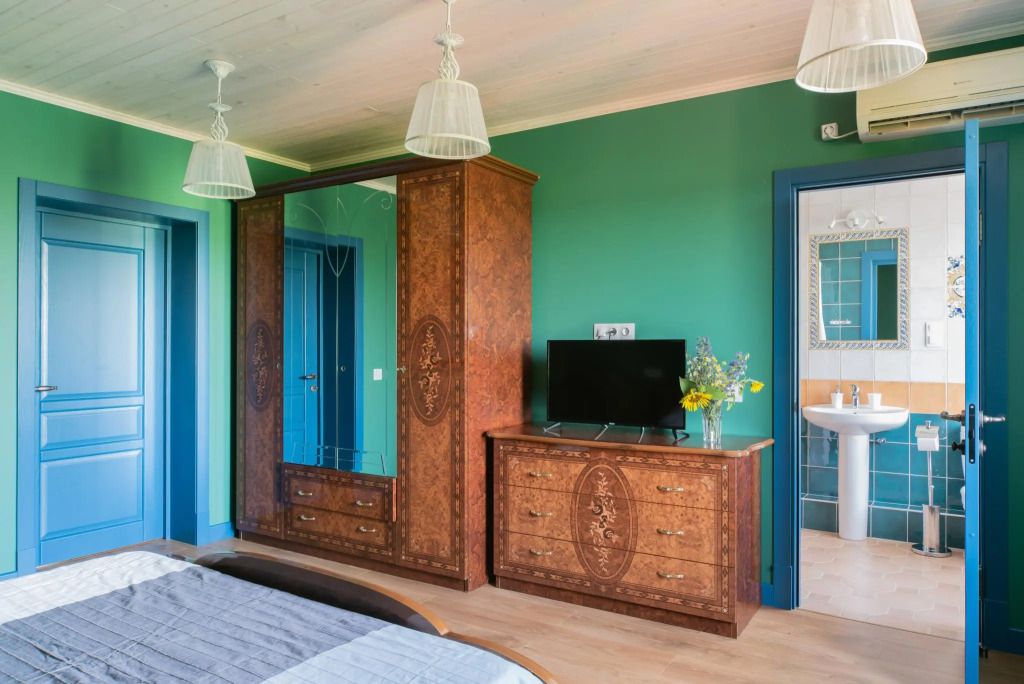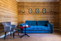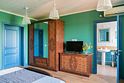 Семейный «Синий Софи» станет идеальной находкой для тех, кто предпочитает темные интерьер. Площадь этого номера 15,68 кв. м. предназначена для размещения 4 гостей, с возможностью установки дополнительного места. В нем есть двухместная кровать и спальное «чердачное» место в верхнем ярусе. Огромный окна этого номера выходят на внутренний дворик и бассейн.