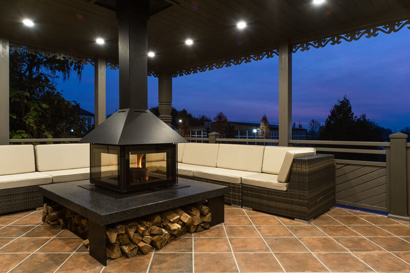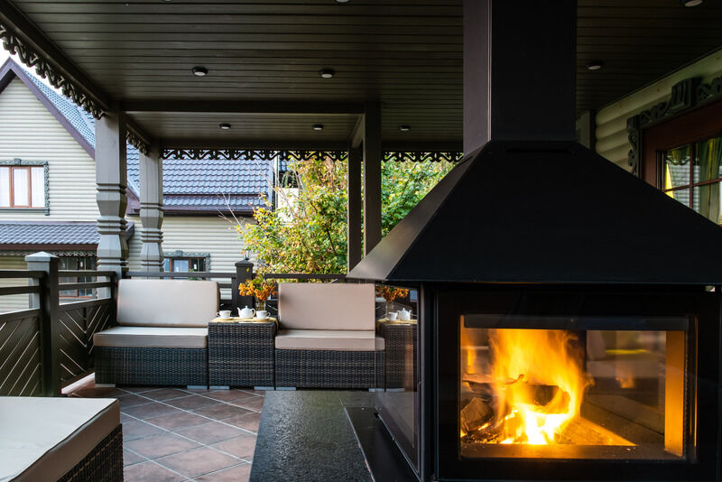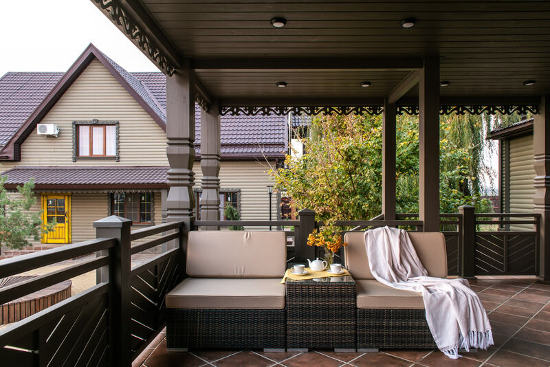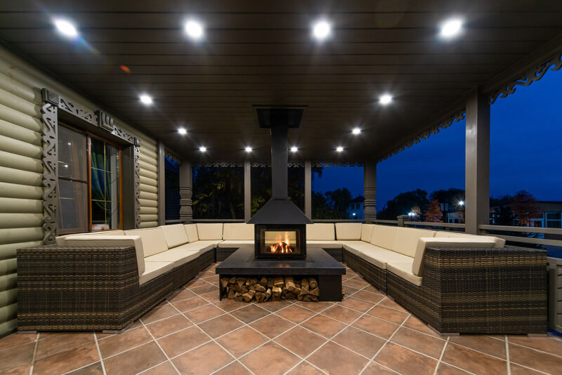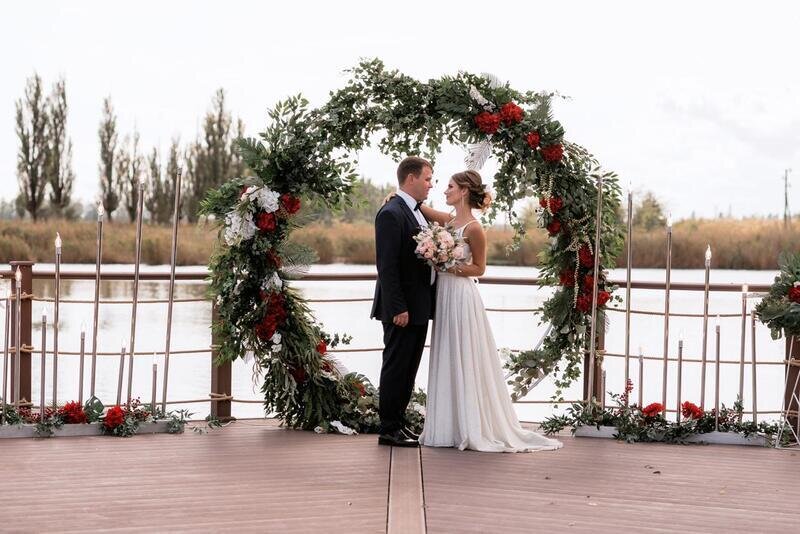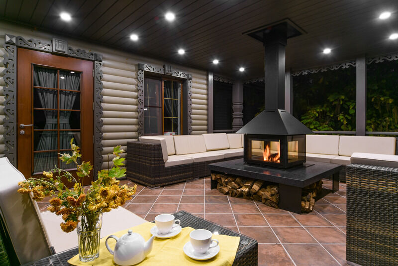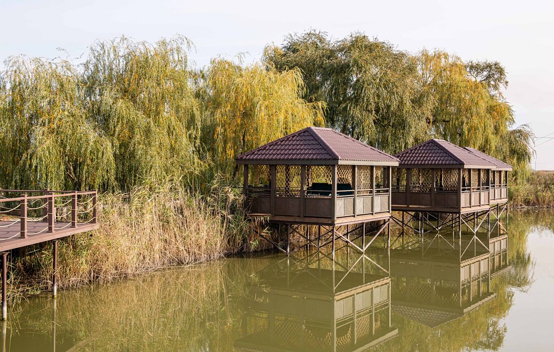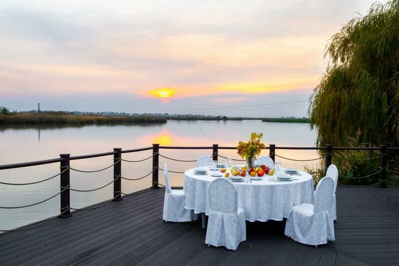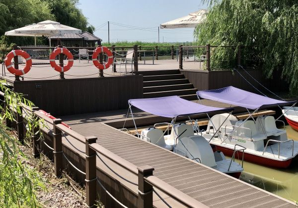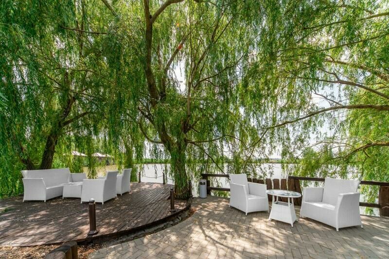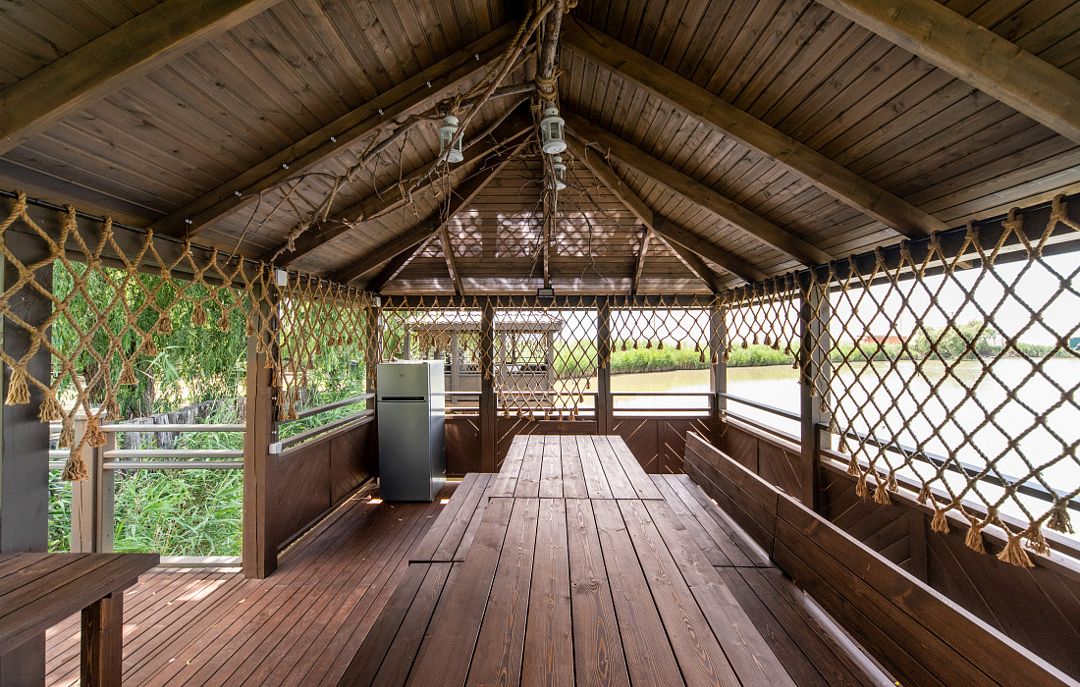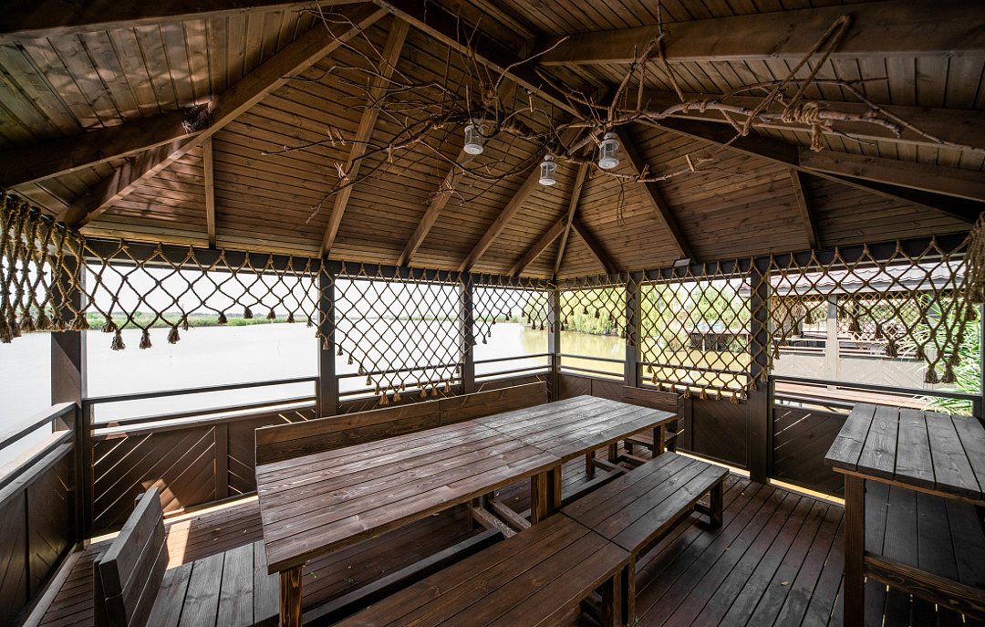 Гости располагаются за столиками на красивейшей открытой террасе на берегу водоема.