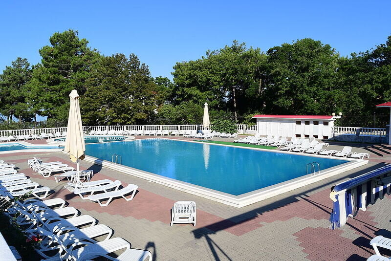 У пансионата есть собственный пляж. На галечном побережье все обустроено для комфортного отдыха — есть лежаки, навесы, шезлонги, работают душевые.