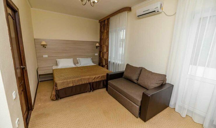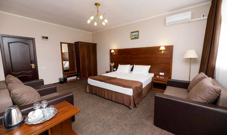 Комплекс занимает территорию площадью 9 гектаров, расположенную всего в 100 метрах от моря. В благоустроенных трех- и пятиэтажных корпусах разместились однокомнатные и двухкомнатные номера, оснащенные всеми необходимым удобствами. Везде есть санузел с душем, сплит-система, бытовая техника: электрочайник, холодильник, фен, телевизор.