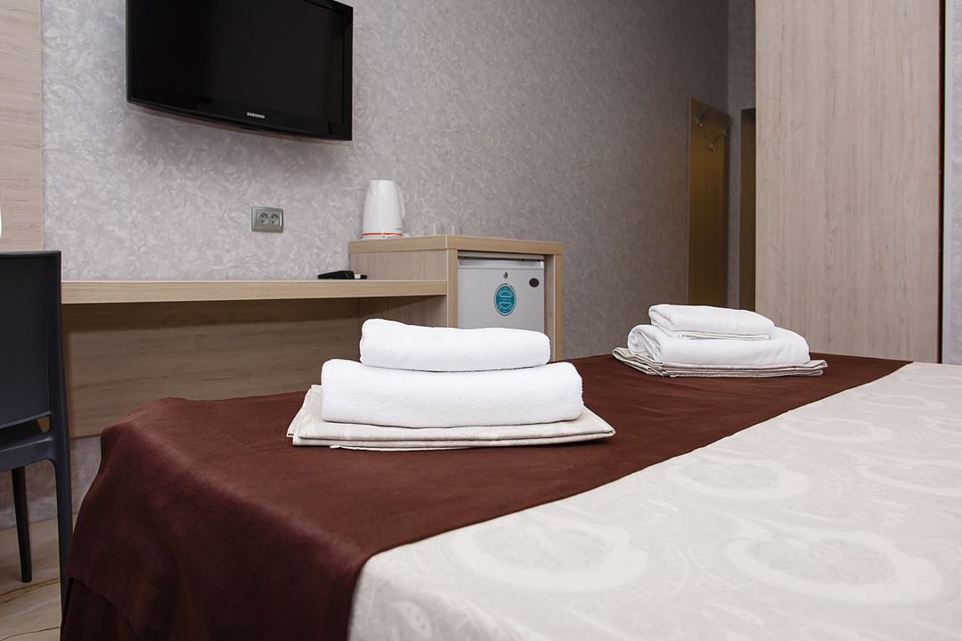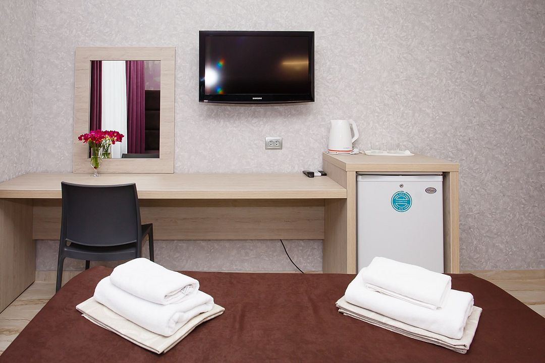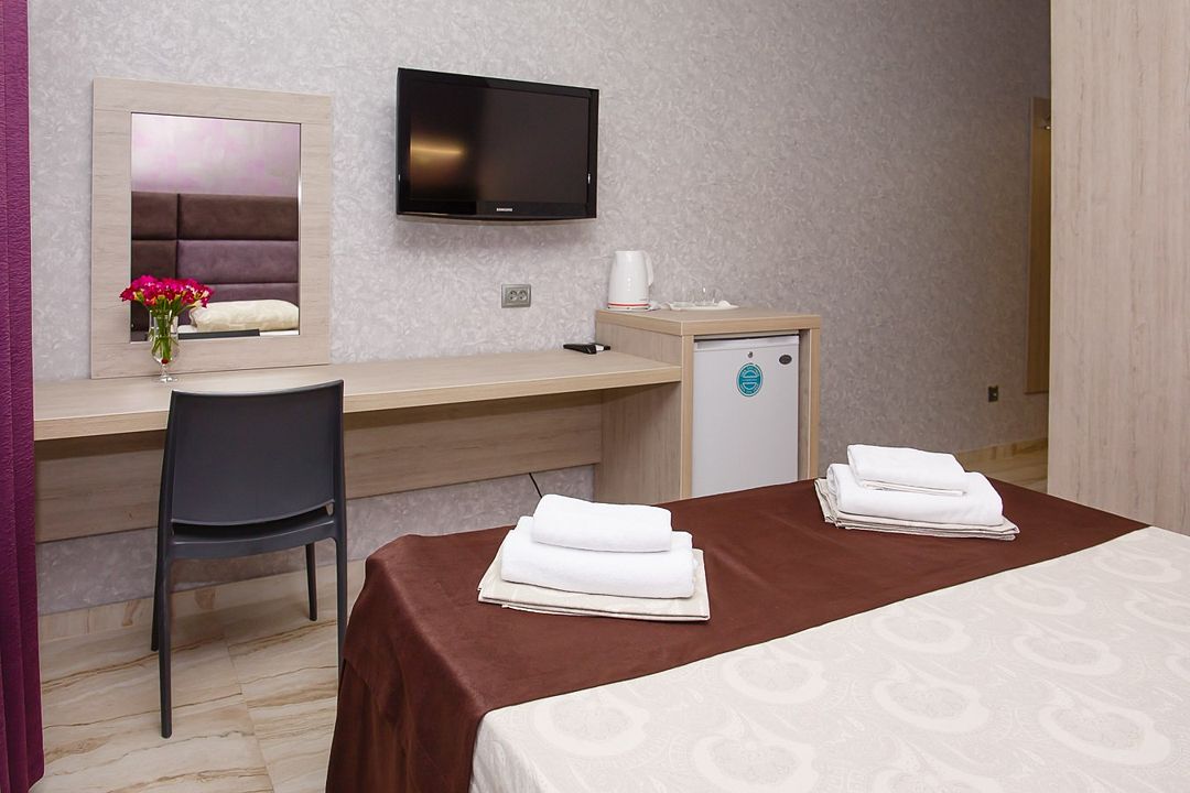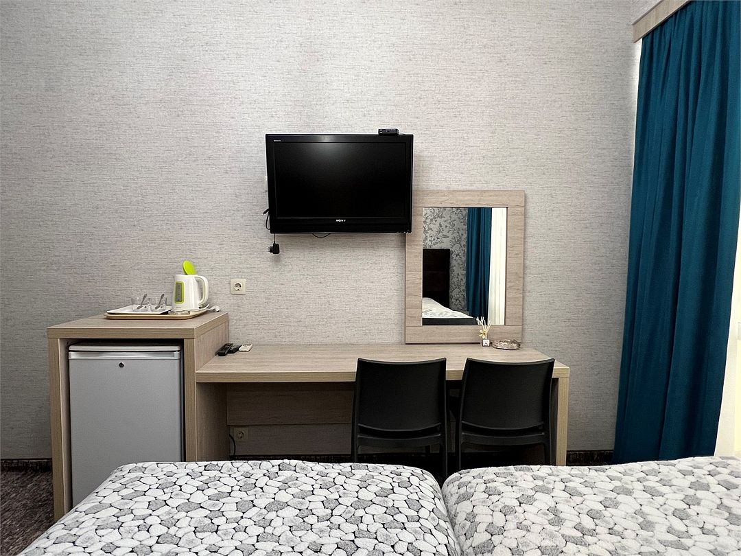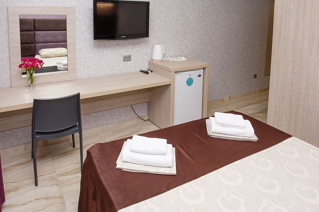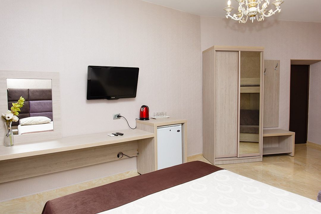 Стандарт+ современный комфортабельный номер, рассчитан на проживание до 3-х человек и возможно размещение ребенка без предоставления места. Номера располагаются на 3-м и 5-м этажах, вид из окна на соседний отель. Во всех номерах: двуспальная и односпальная(или софа) кровати, телевизор, кондиционер, мини-холодильник, сейф, чайник, халаты, санузел(душ, туалет, полотенца, фен), туалетные принадлежности(туалетная бумага, мыло, шампунь, гель для душа).Услуги и удобства