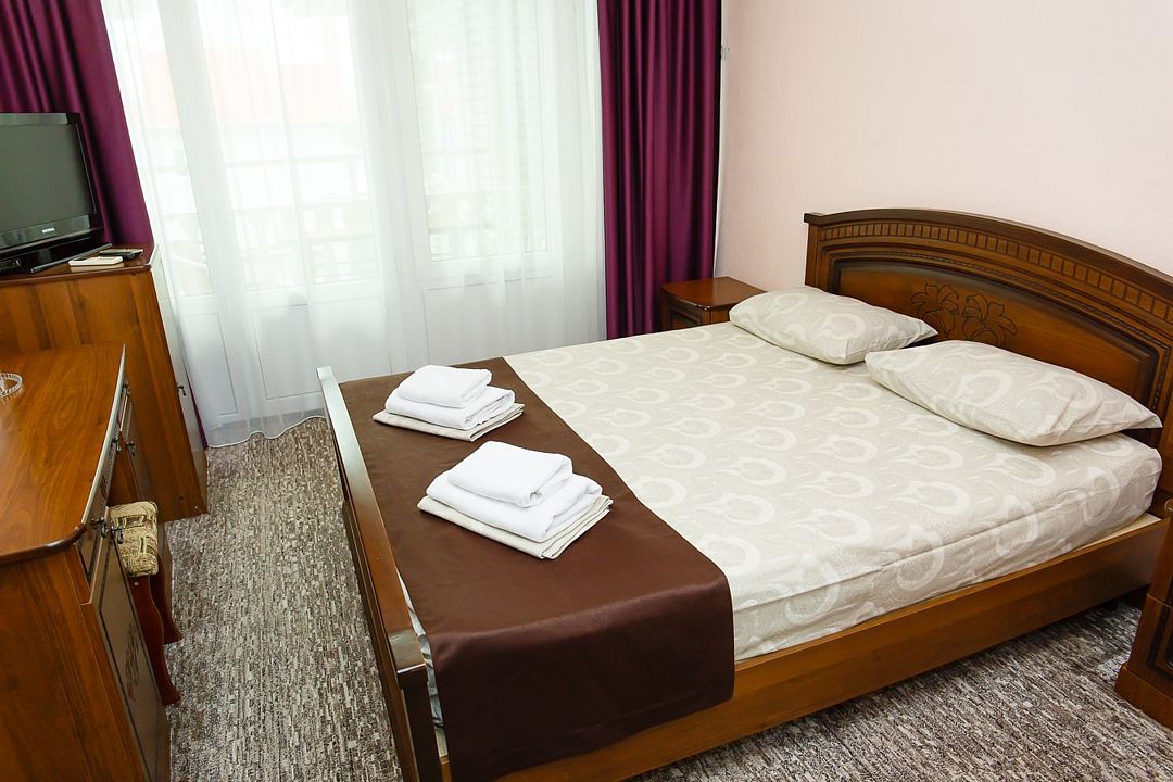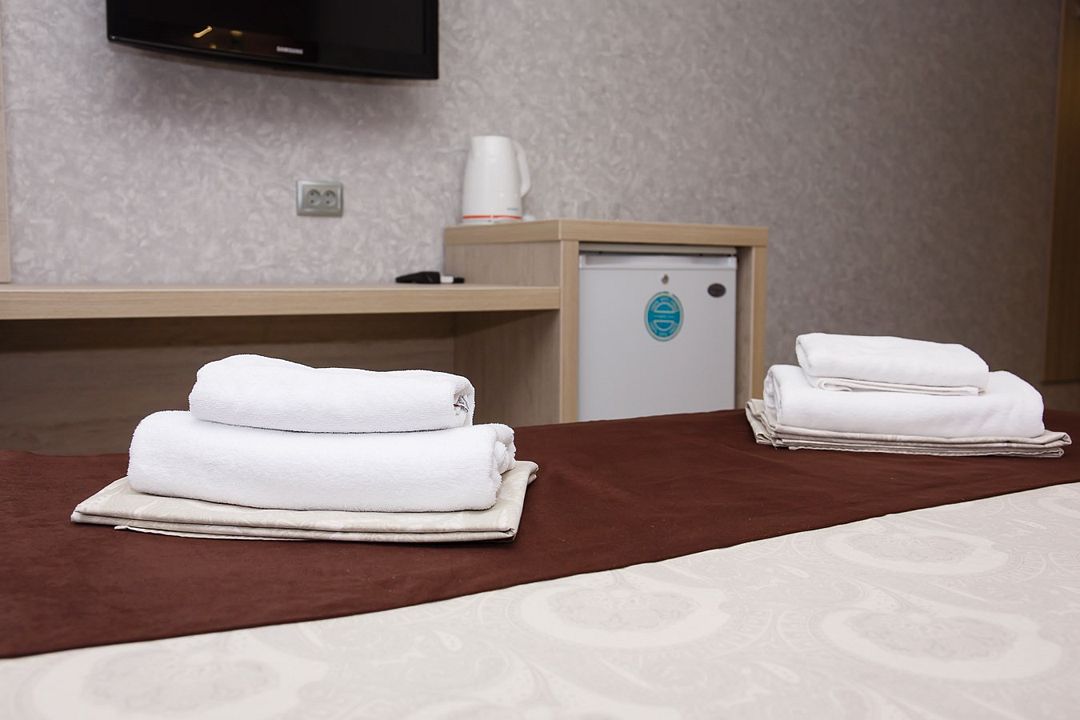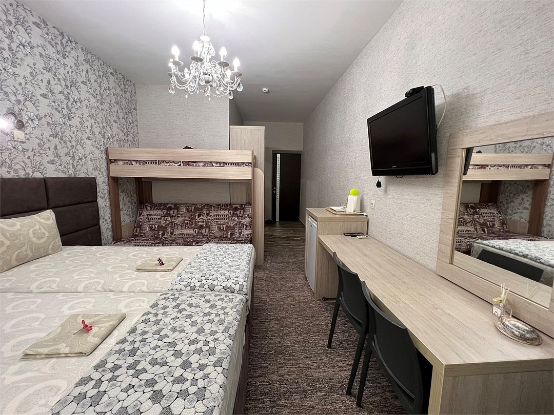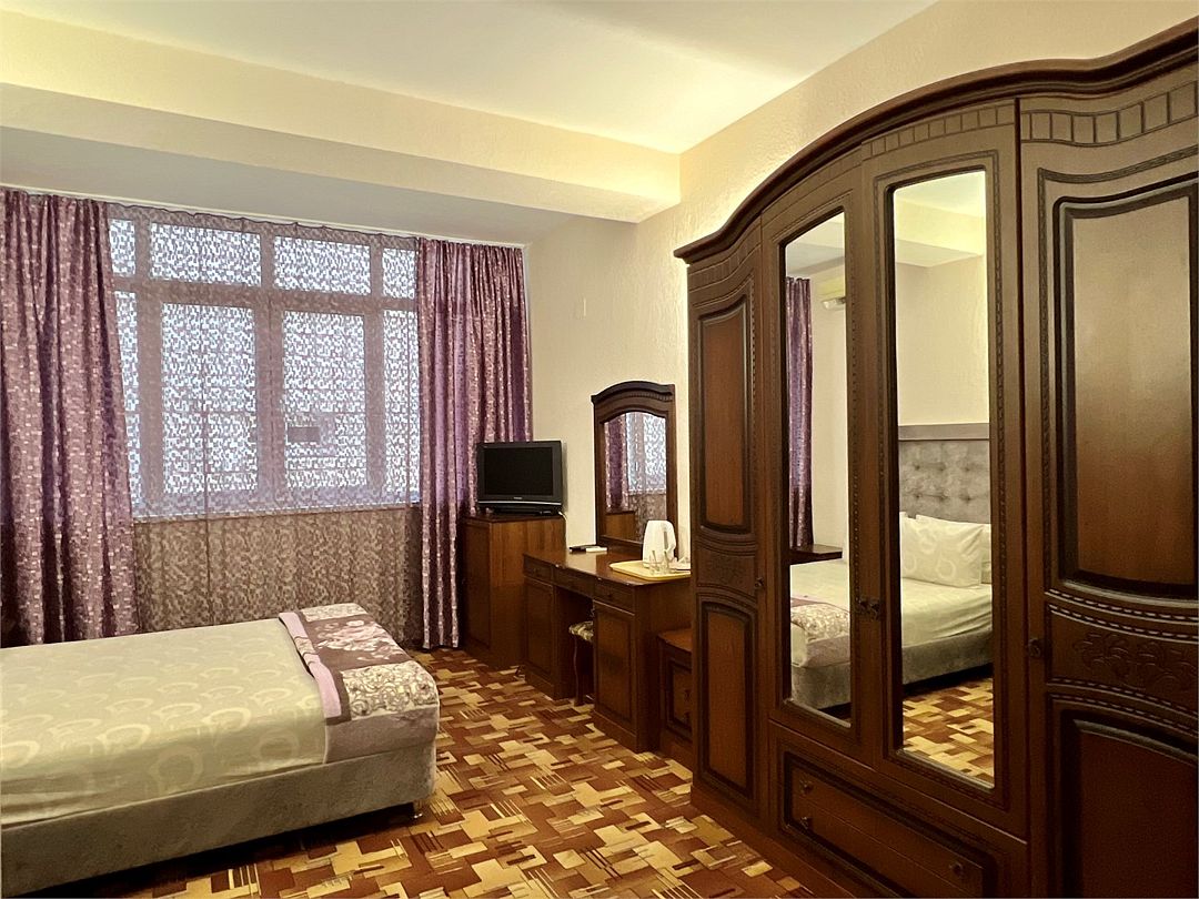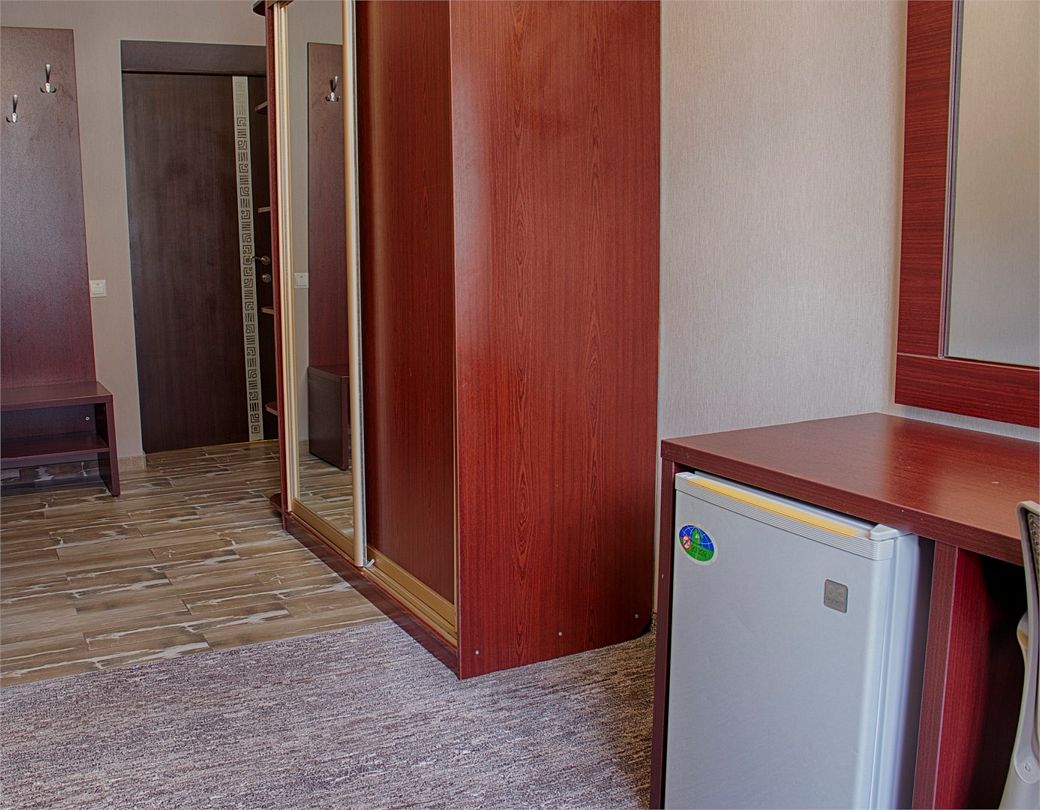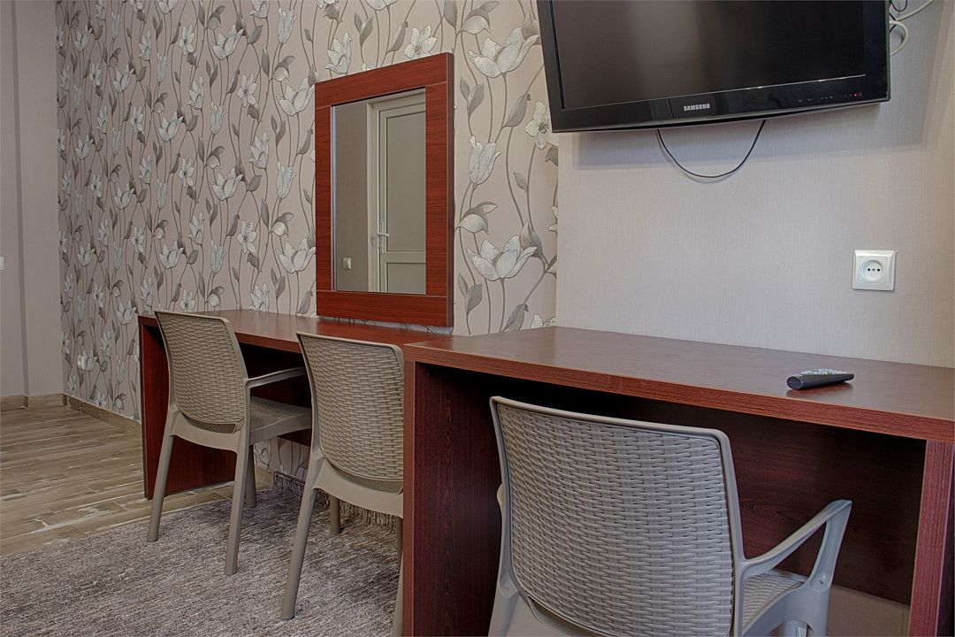Стандарт+ современный комфортабельный номер, рассчитан на проживание до 3-х человек и возможно размещение ребенка без предоставления места. Номера располагаются на 3-м и 5-м этажах, вид из окна на соседний отель. Во всех номерах: двуспальная и односпальная(или софа) кровати, телевизор, кондиционер, мини-холодильник, сейф, чайник, халаты, санузел(душ, туалет, полотенца, фен), туалетные принадлежности(туалетная бумага, мыло, шампунь, гель для душа).Услуги и удобства