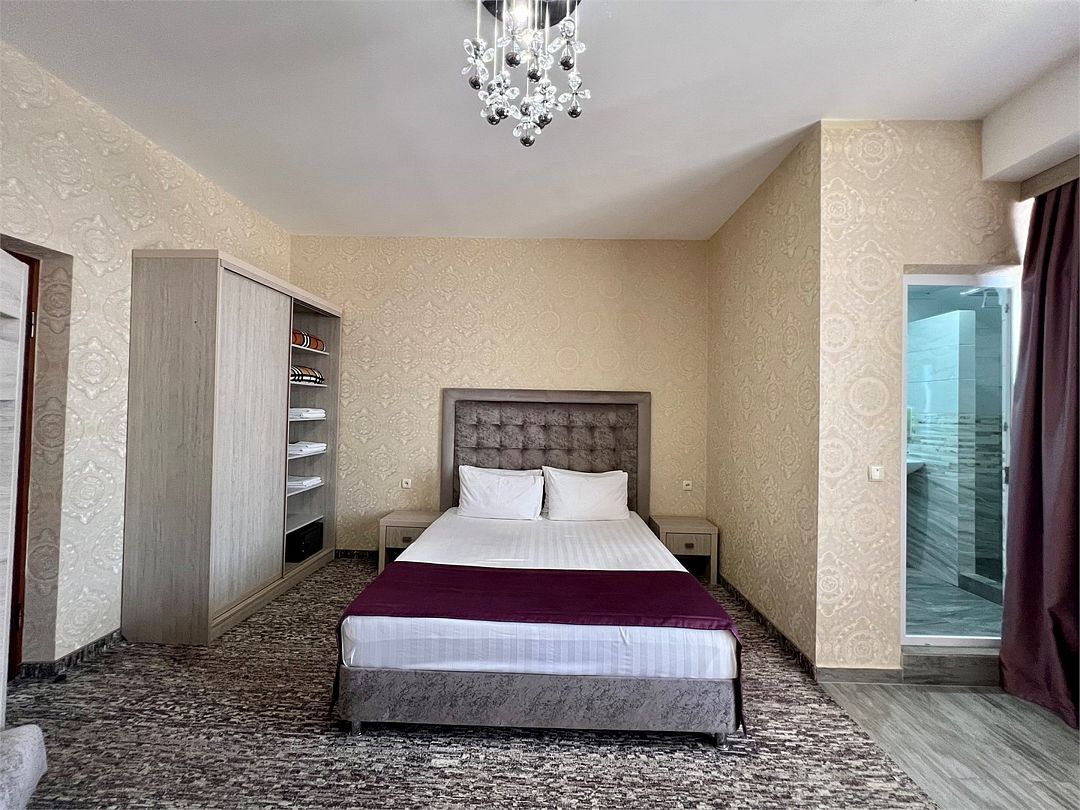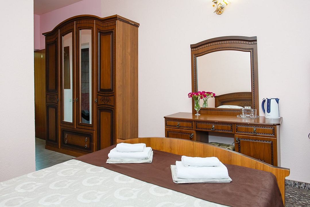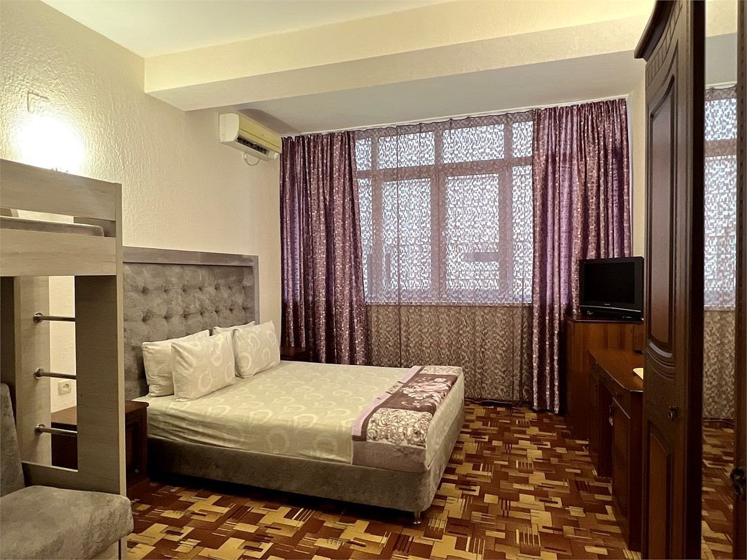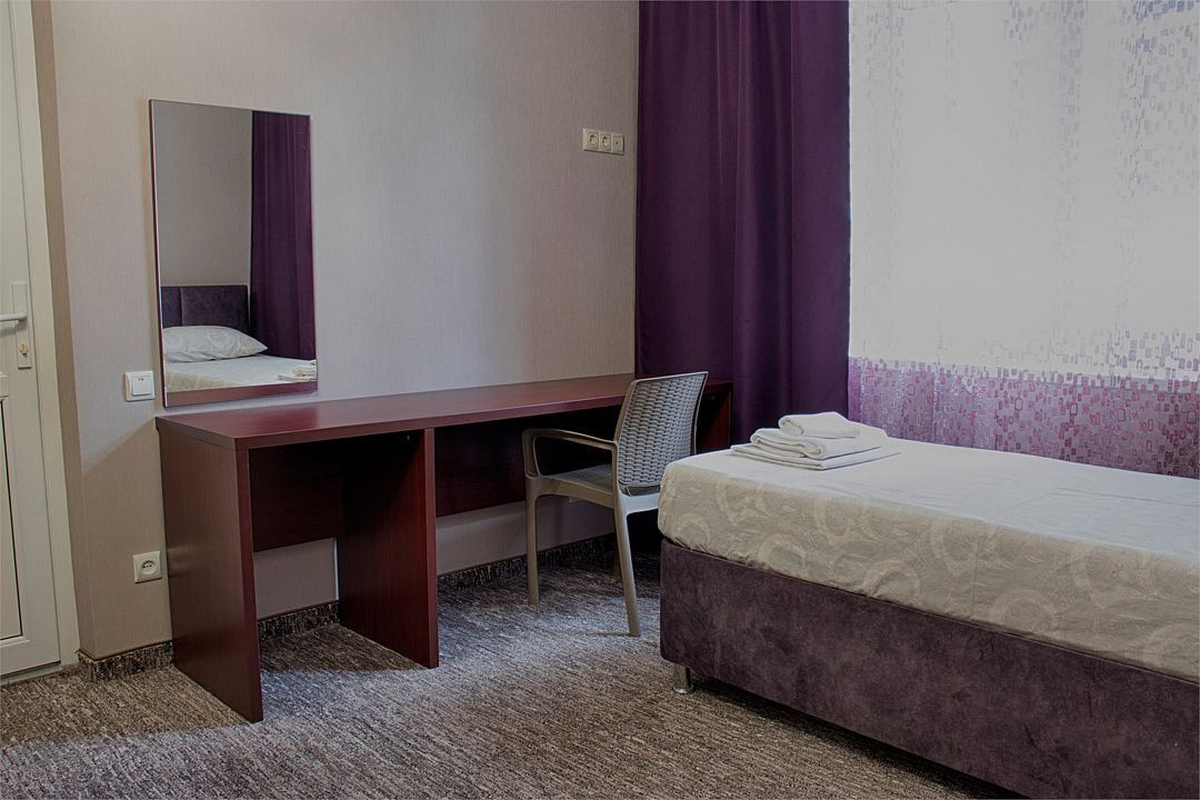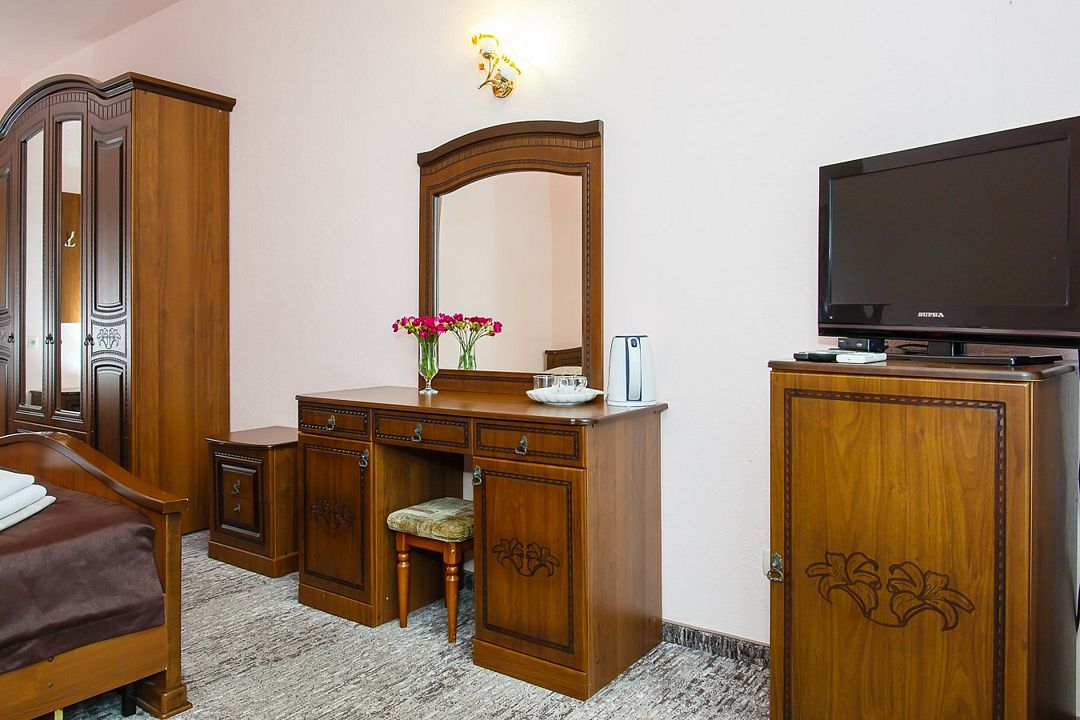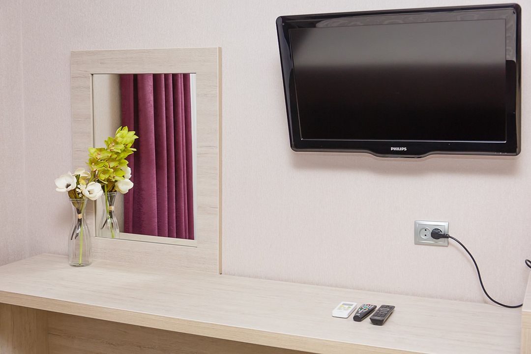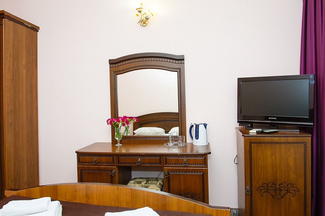 Стандарт+ современный комфортабельный номер, рассчитан на проживание до 3-х человек и возможно размещение ребенка без предоставления места. Номера располагаются на 3-м и 5-м этажах, вид из окна на соседний отель. Во всех номерах: двуспальная и односпальная(или софа) кровати, телевизор, кондиционер, мини-холодильник, сейф, чайник, халаты, санузел(душ, туалет, полотенца, фен), туалетные принадлежности(туалетная бумага, мыло, шампунь, гель для душа).Услуги и удобства