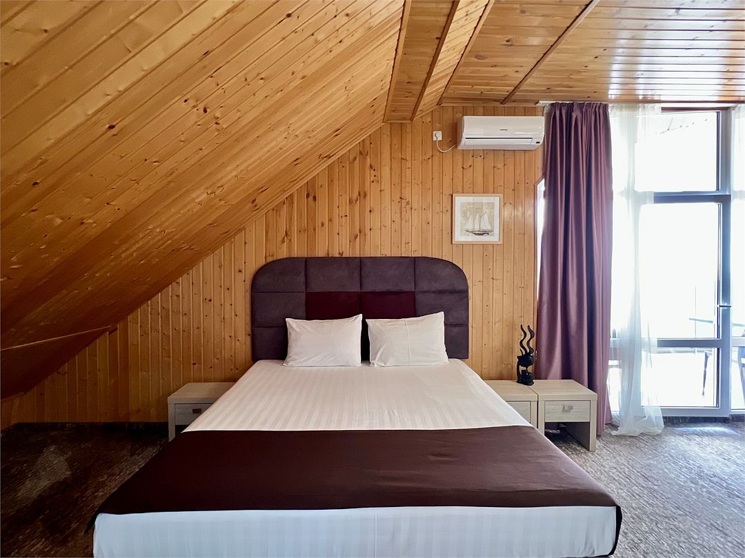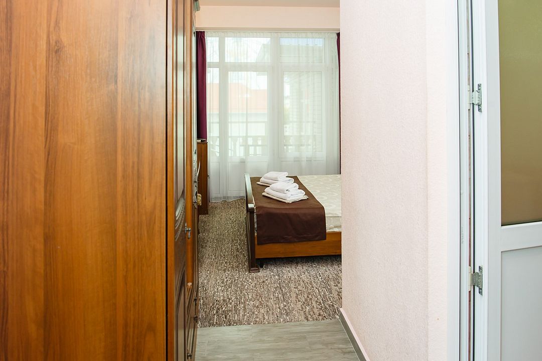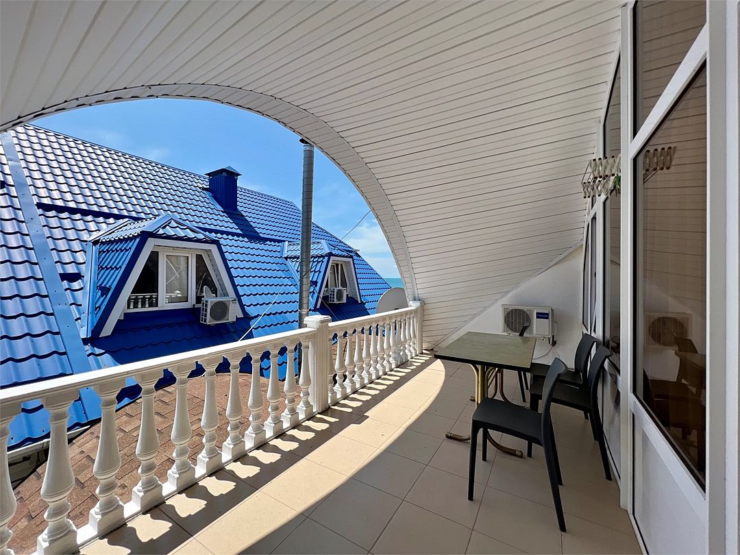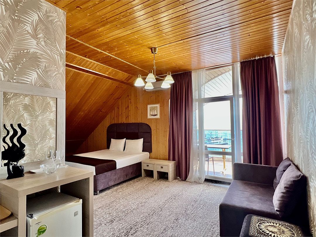 Комфорт+ с балконом прямой вид на море современный комфортабельный номер, рассчитан на проживание до 5-х человек. Номера располагаются на 3-м и 4-м этажах, балкон с прямым видом на море. Во всех номерах: Двуспальная кровать, двухъярусный диван-кровать, телевизор, кондиционер, мини-холодильник, сейф, чайник, халаты, санузел(душ, туалет, полотенца, фен), туалетные принадлежности(туалетная бумага, мыло, шампунь, гель для душа).Услуги и удобства