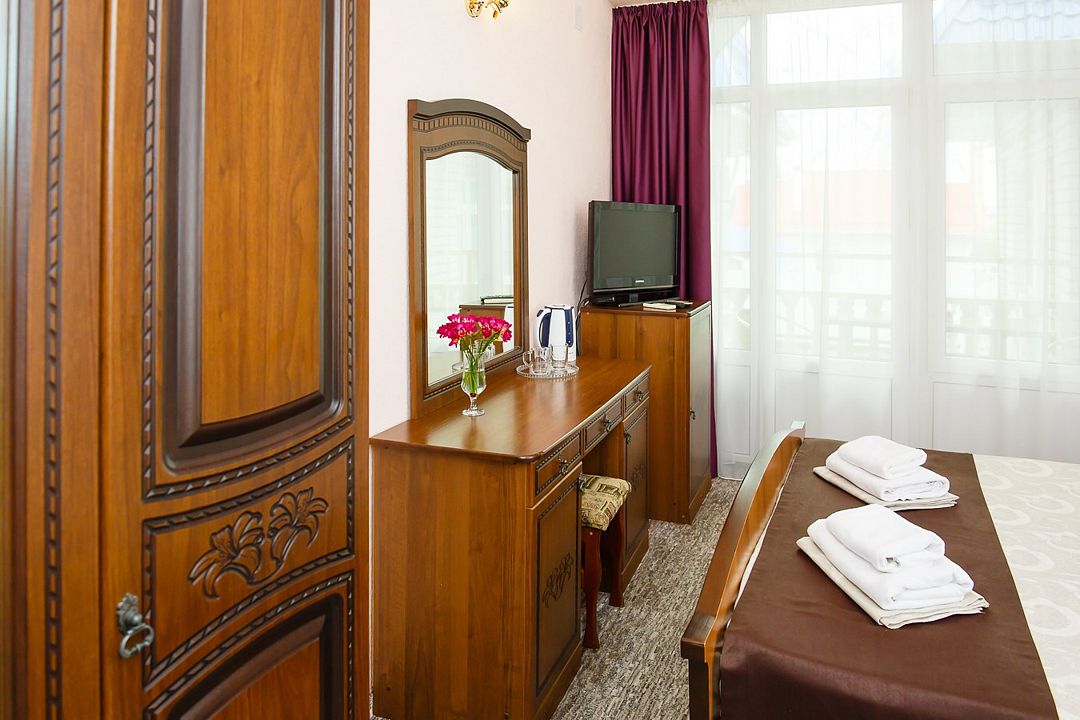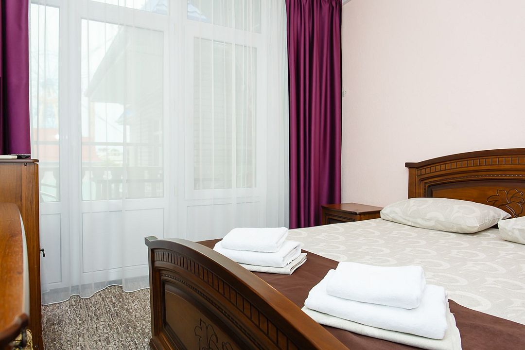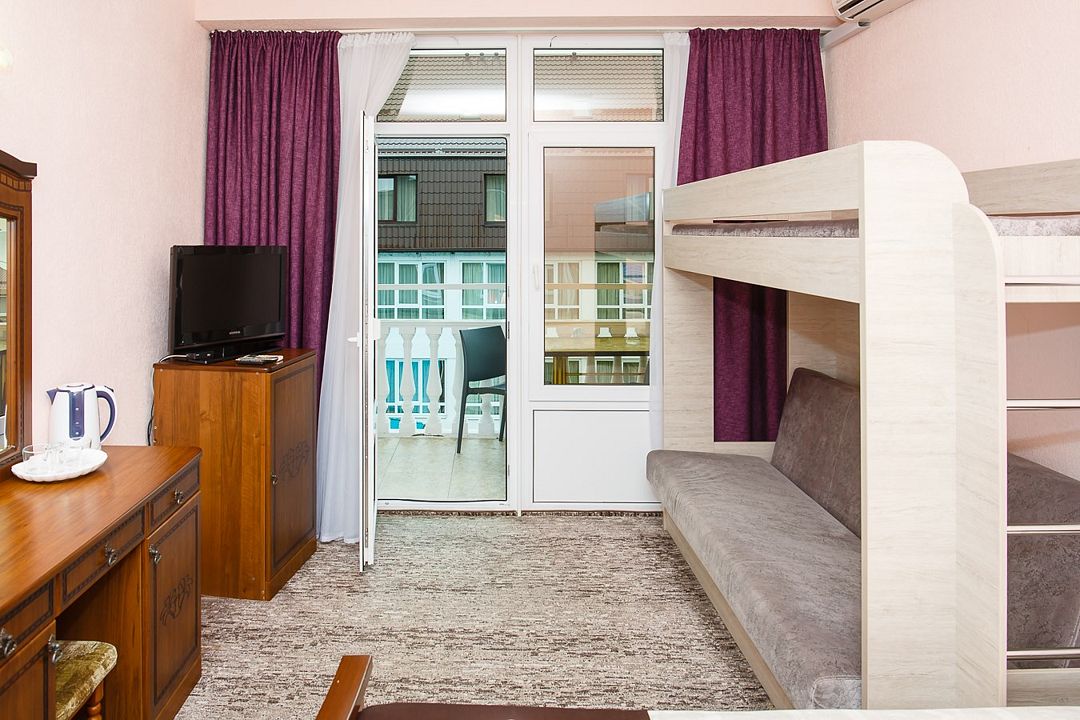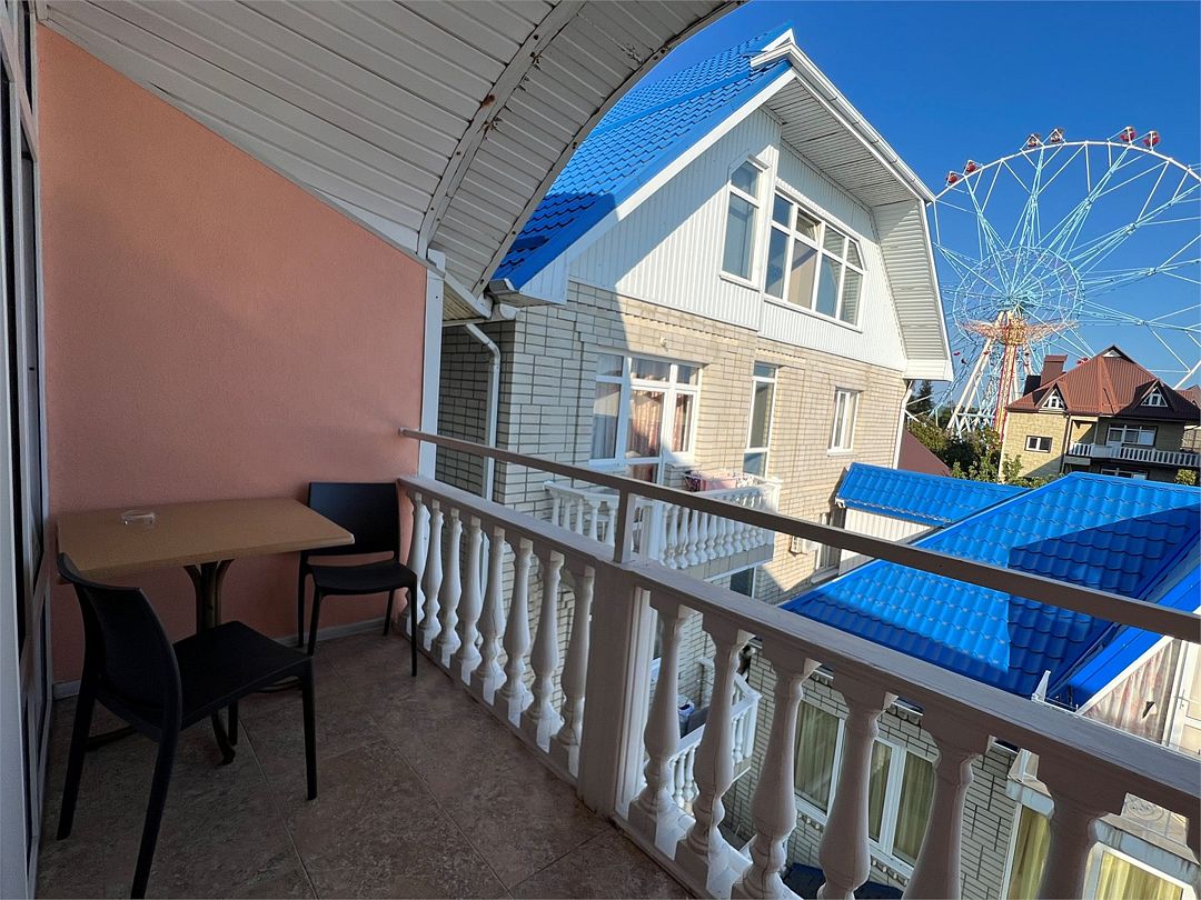 Стандарт+ с балконом современный комфортабельный номер, рассчитан на проживание до 3-х человек и возможно размещение ребенка без предоставления места. Номера располагаются на 3-м и 4-м этажах, балкон с видом на соседний отель. Во всех номерах: двуспальная и односпальная(или софа) кровати, телевизор, кондиционер, мини-холодильник, сейф, чайник, халаты, санузел(душ, туалет, полотенца, фен), туалетные принадлежности(туалетная бумага, мыло, шампунь, гель для душа).Услуги и удобства