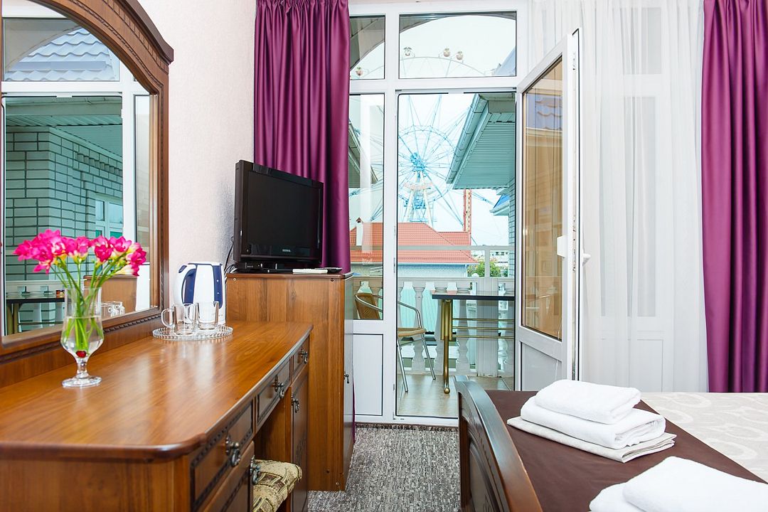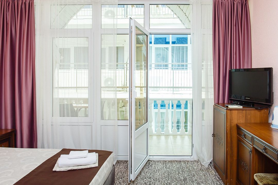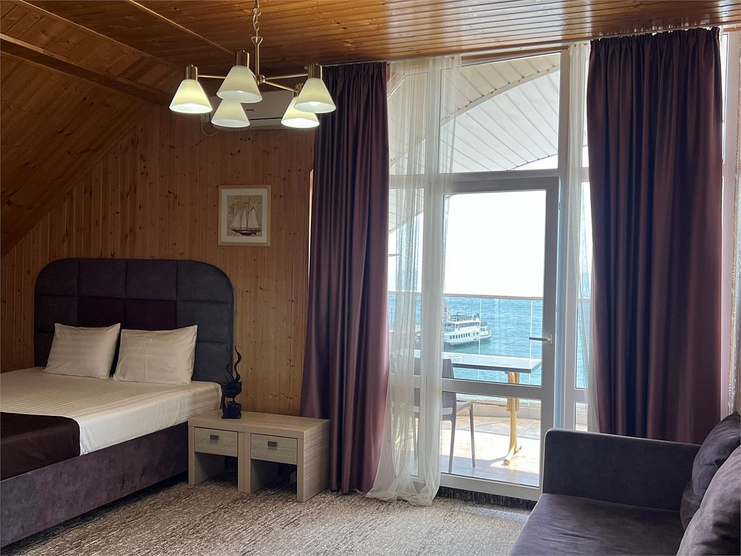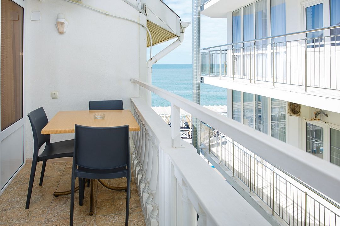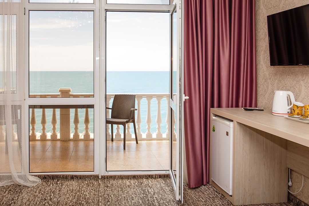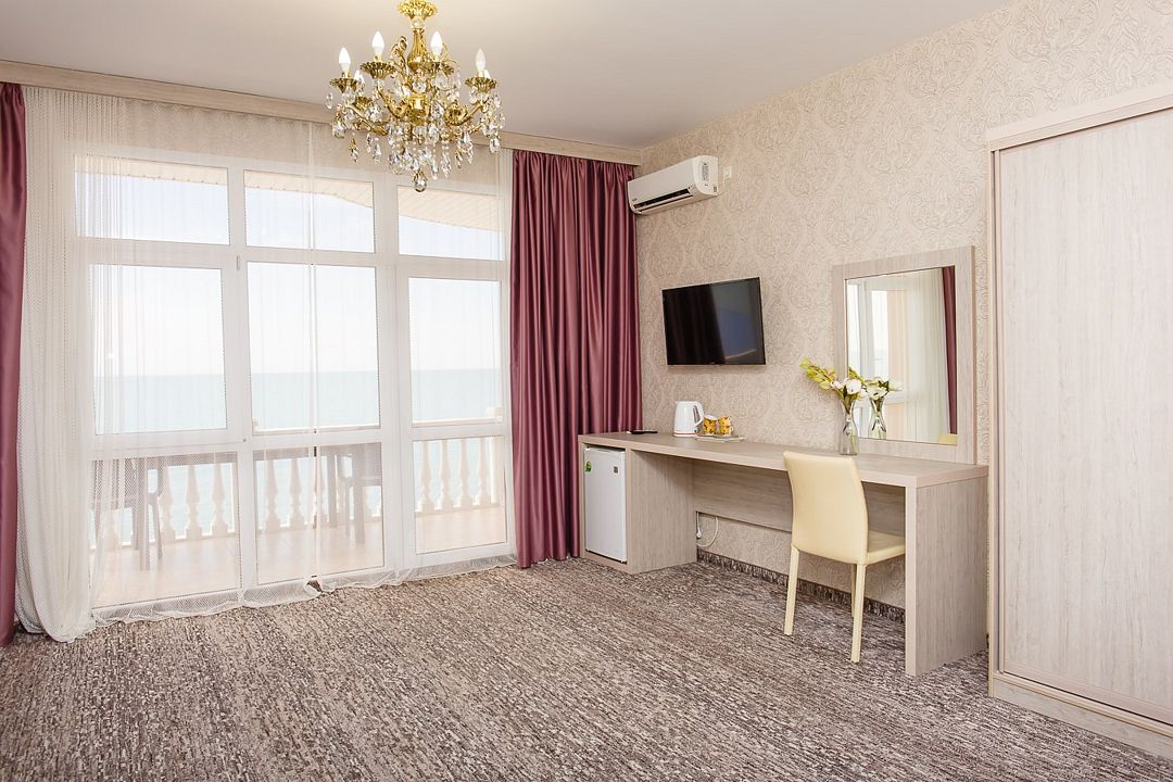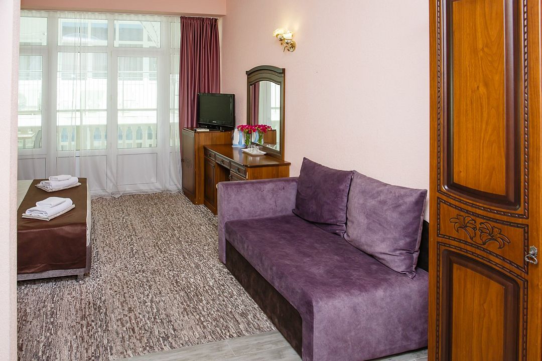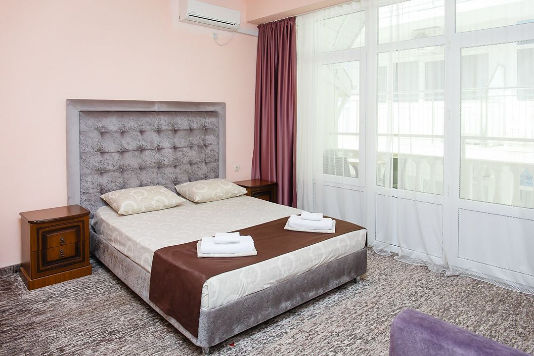 Комфорт с балконом прямой вид на море современный комфортабельный номер, рассчитан на проживание до 4-х человек. Номера располагаются на 5-м этажах, балкон с прямым видом на море. Во всех номерах: Двуспальная кровать, две софы, телевизор, кондиционер, мини-холодильник, сейф, чайник, халаты, санузел(душ, туалет, полотенца, фен), туалетные принадлежности(туалетная бумага, мыло, шампунь, гель для душа).Услуги и удобства