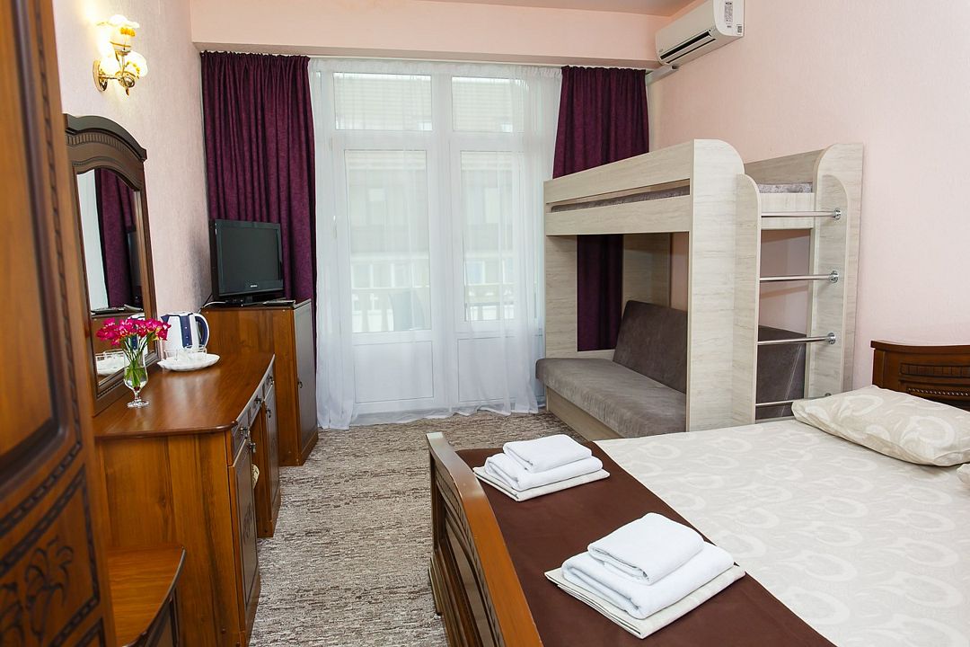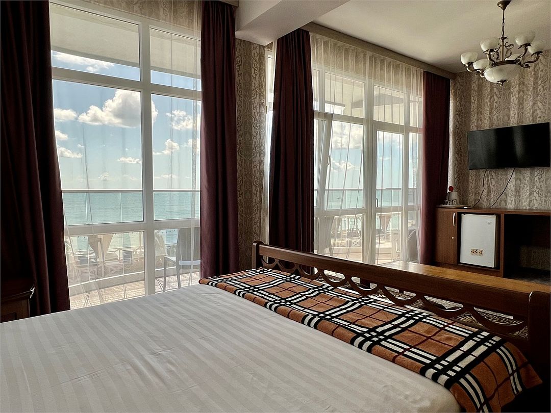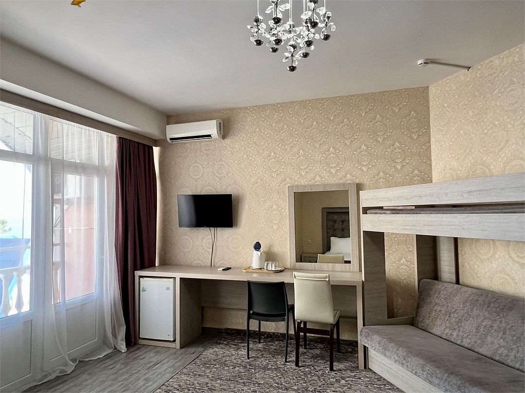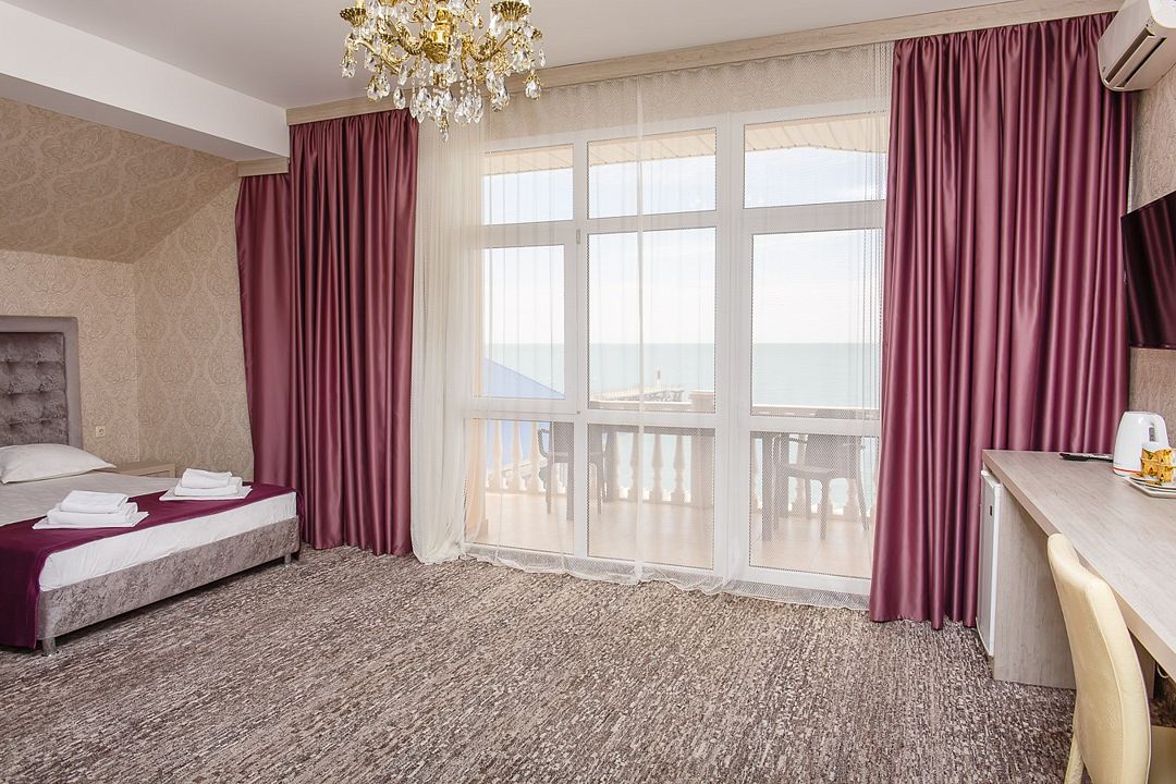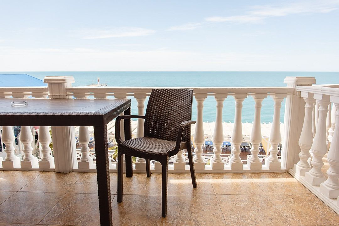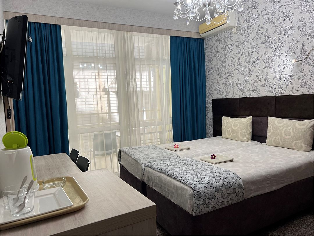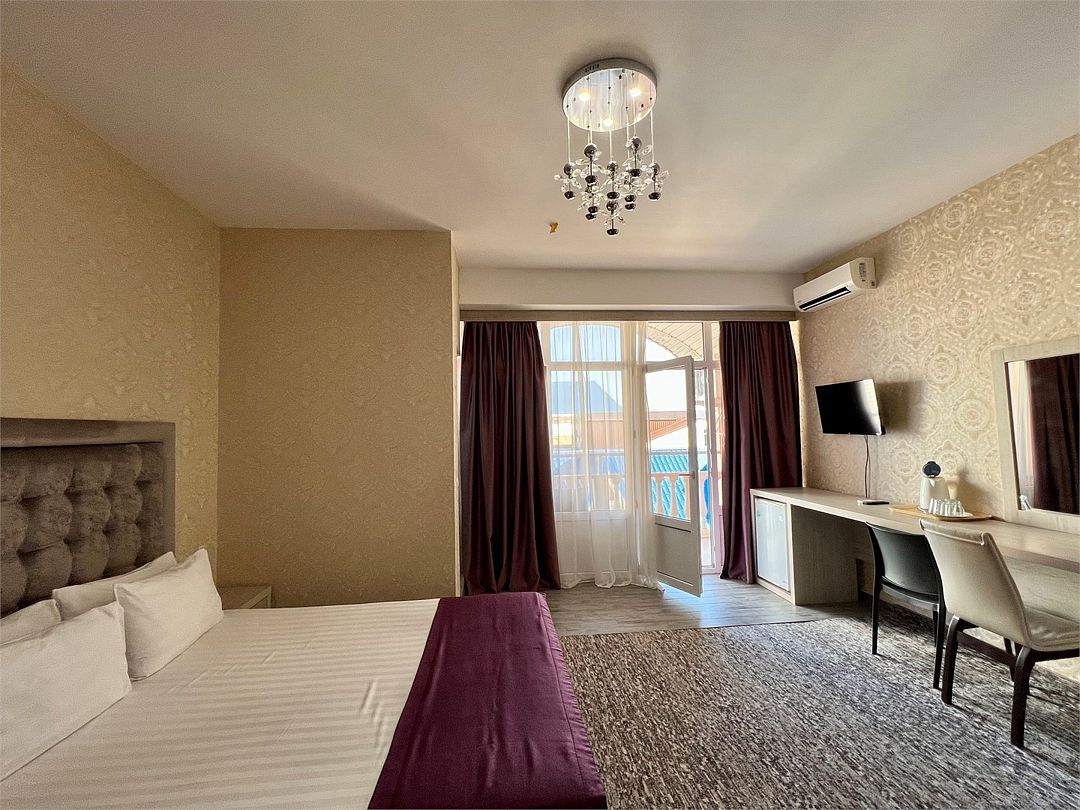 Комфорт с балконом прямой вид на море современный комфортабельный номер, рассчитан на проживание до 4-х человек. Номера располагаются на 5-м этажах, балкон с прямым видом на море. Во всех номерах: Двуспальная кровать, две софы, телевизор, кондиционер, мини-холодильник, сейф, чайник, халаты, санузел(душ, туалет, полотенца, фен), туалетные принадлежности(туалетная бумага, мыло, шампунь, гель для душа).Услуги и удобства