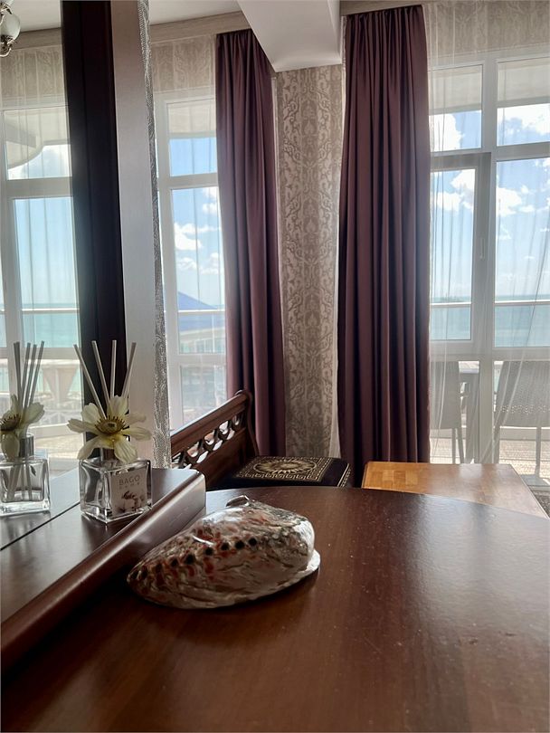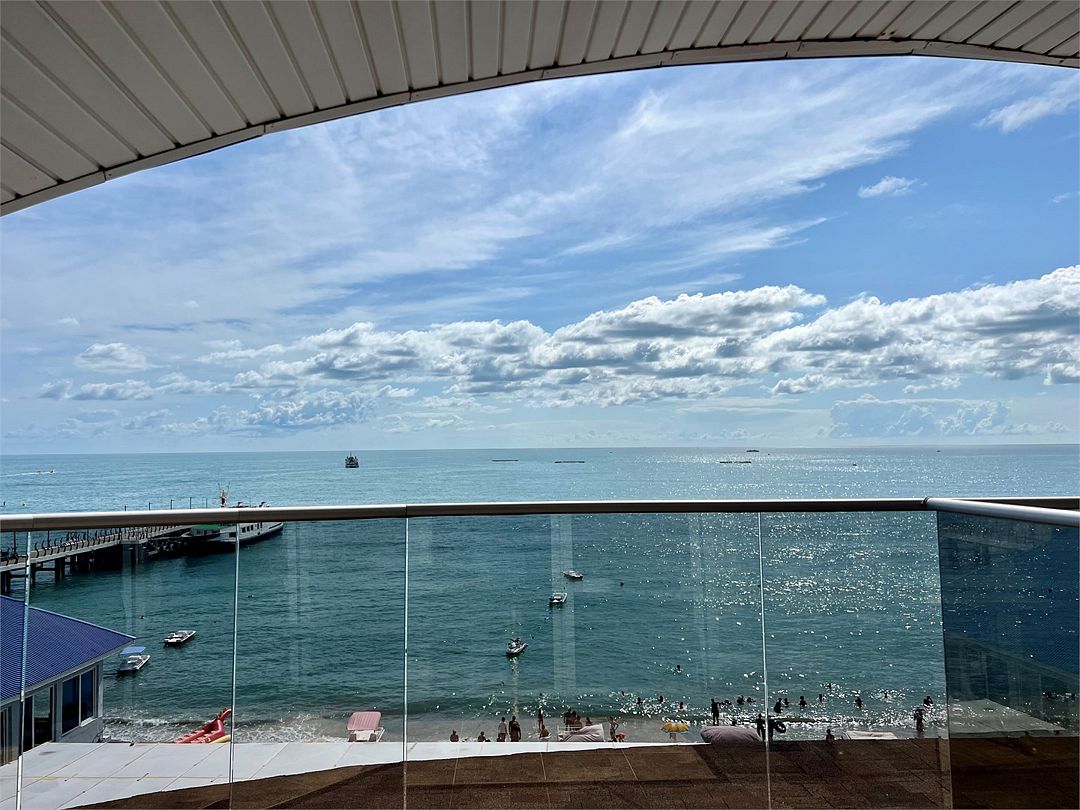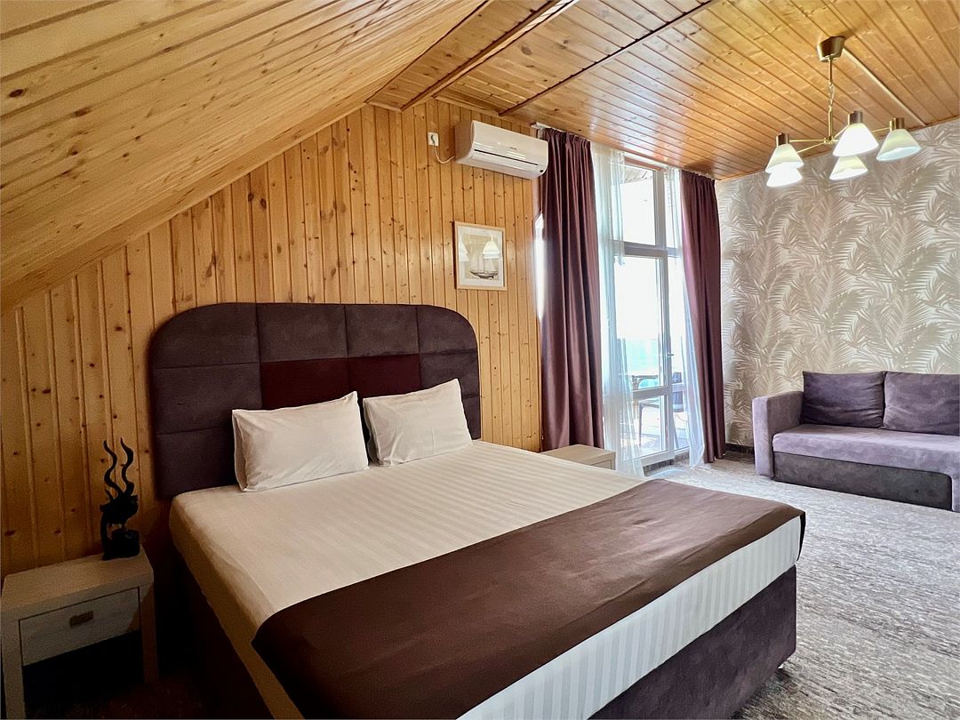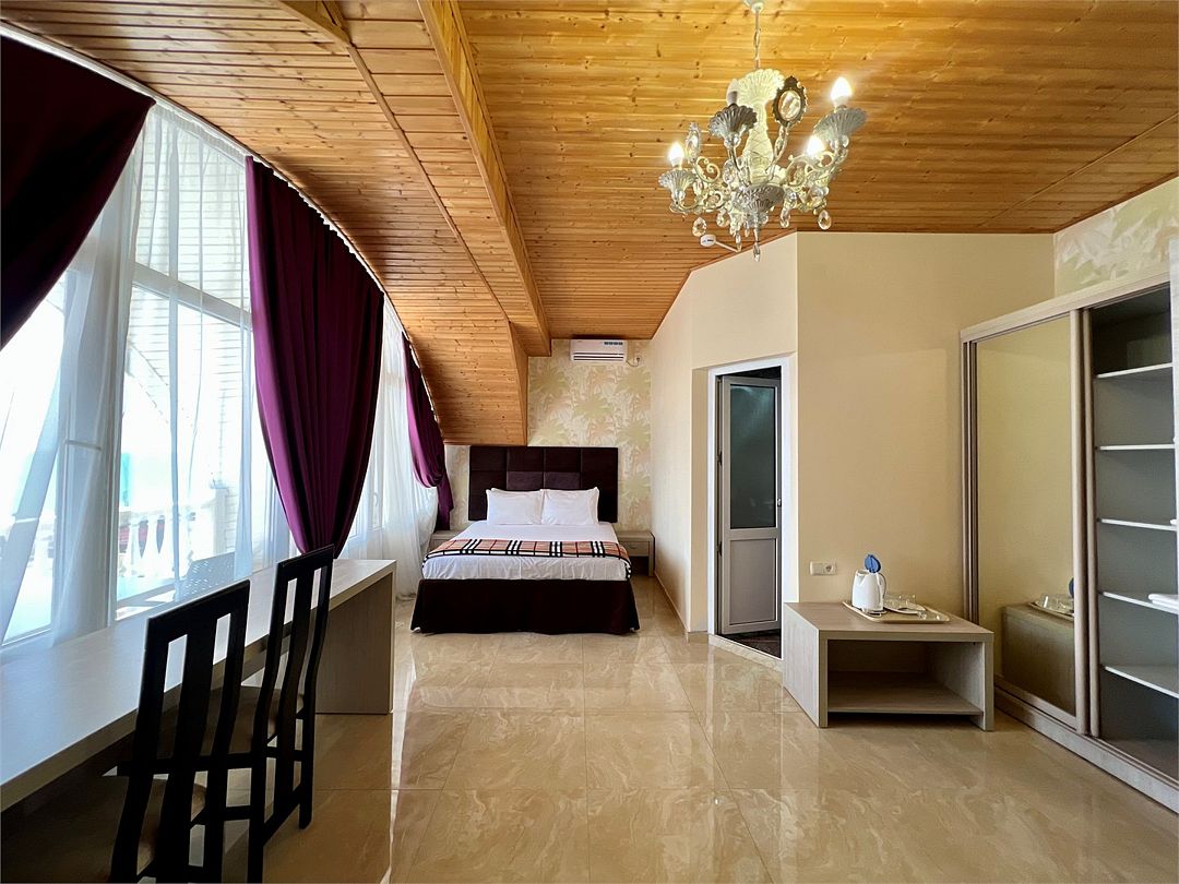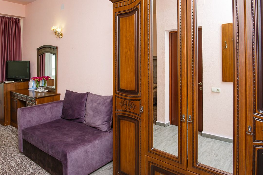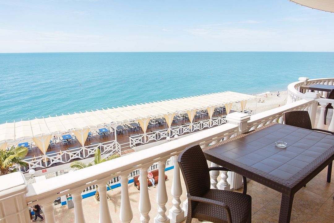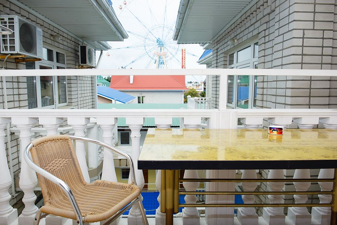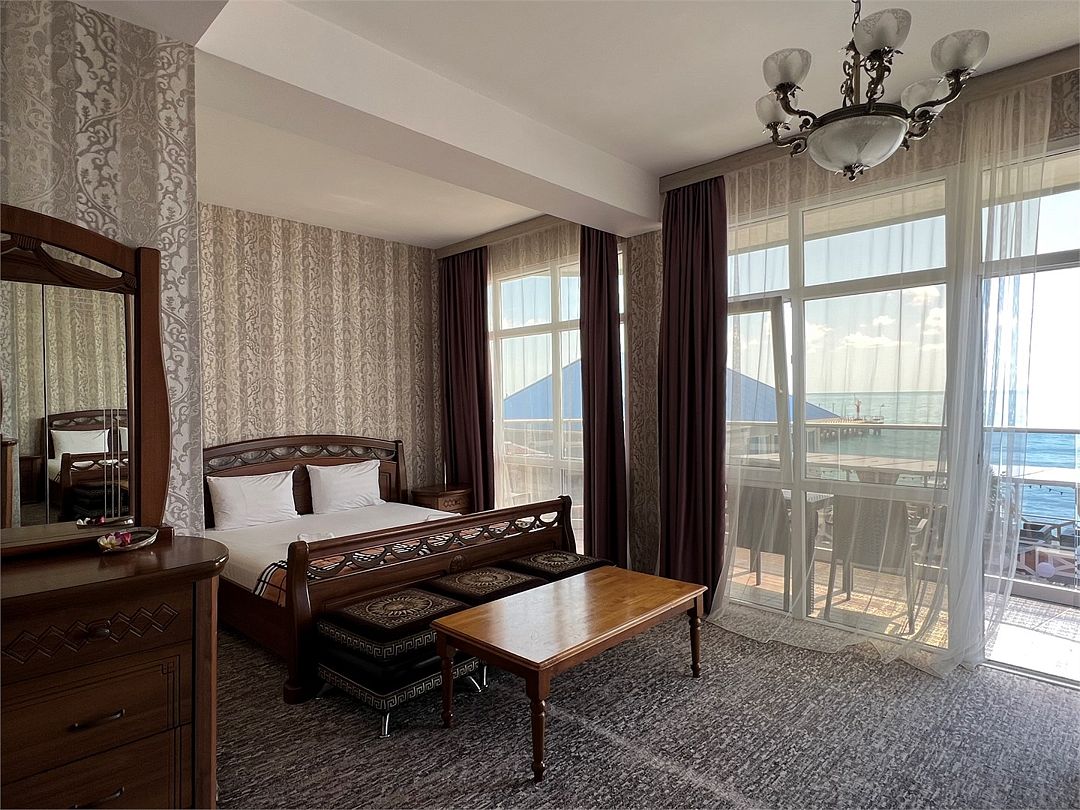 Комфорт с балконом прямой вид на море современный комфортабельный номер, рассчитан на проживание до 4-х человек. Номера располагаются на 5-м этажах, балкон с прямым видом на море. Во всех номерах: Двуспальная кровать, две софы, телевизор, кондиционер, мини-холодильник, сейф, чайник, халаты, санузел(душ, туалет, полотенца, фен), туалетные принадлежности(туалетная бумага, мыло, шампунь, гель для душа).Услуги и удобства