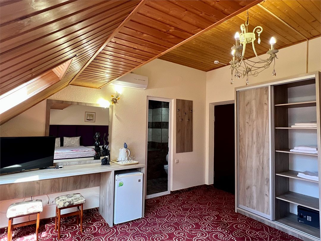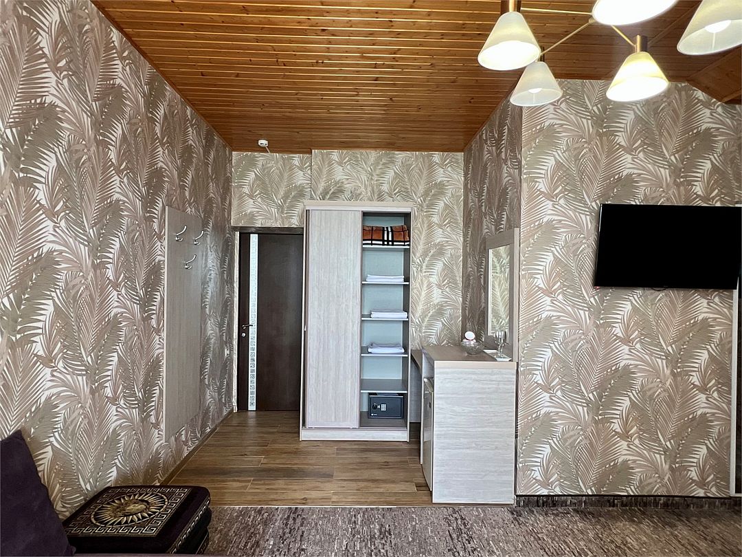 Стандарт современный комфортабельный номер, рассчитан на проживание до 2-х человек и возможно размещение ребенка без предоставления места. Номера располагаются на 2-м и 3-м этажах, вид из окна на соседний отель. Во всех номерах: двуспальная кровать, телевизор, кондиционер, мини-холодильник, сейф, чайник, халаты, санузел(душ, туалет, полотенца, фен), туалетные принадлежности(туалетная бумага, мыло, шампунь, гель для душа).Услуги и удобства