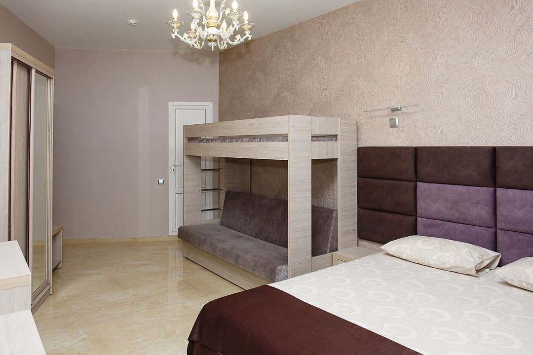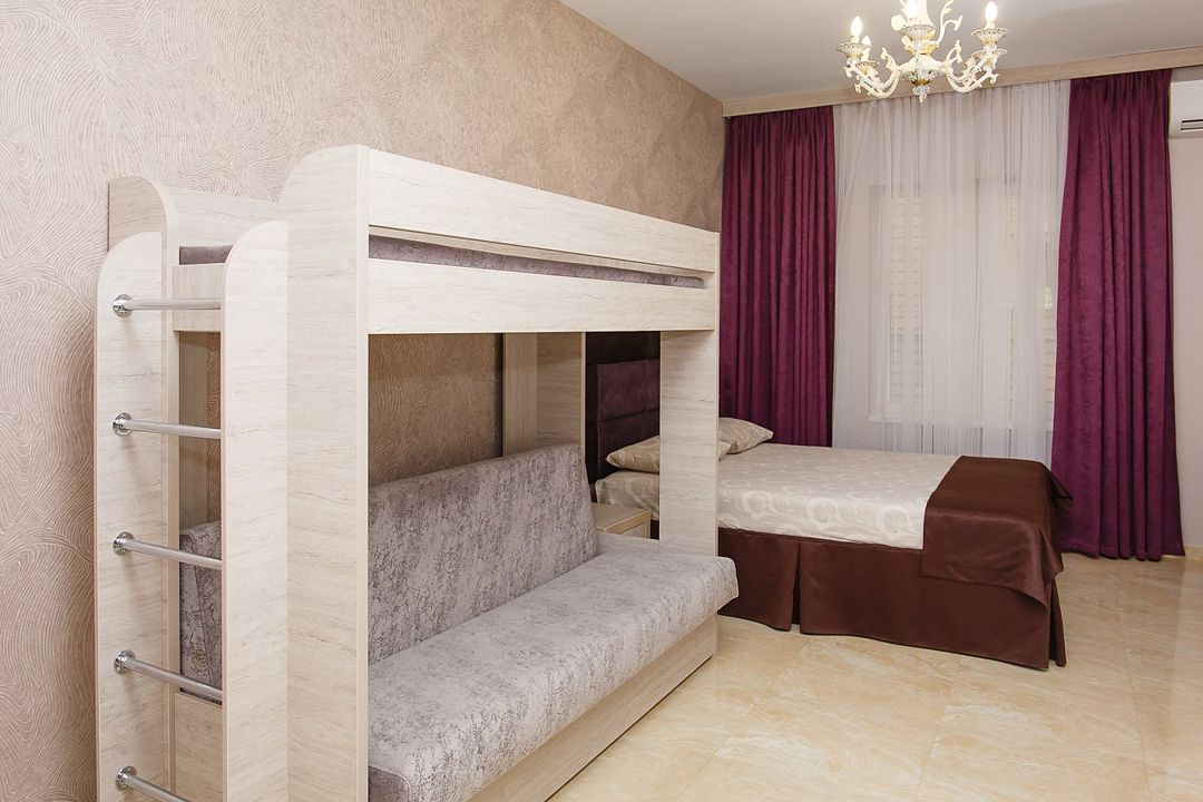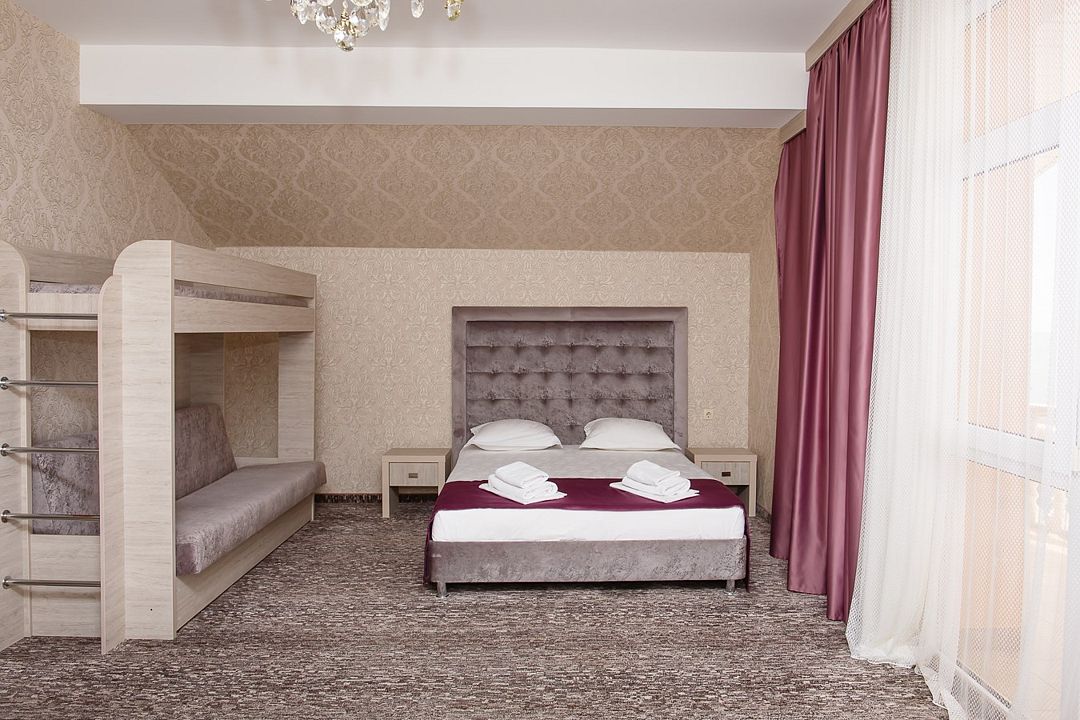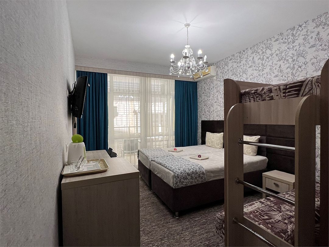 Семейный 2-х комнатный современный комфортабельный номер, рассчитан на проживание до 6-х человек. Номера располагаются на 2-м этаже, вид из окна на соседний отель. Во всех номерах: Двуспальная кровать, односпальная кровать, двухъярусный диван-кровать, телевизор, кондиционер, мини-холодильник, сейф, чайник, халаты, санузел(душ, туалет, полотенца, фен), туалетные принадлежности(туалетная бумага, мыло, шампунь, гель для душа).Услуги и удобства