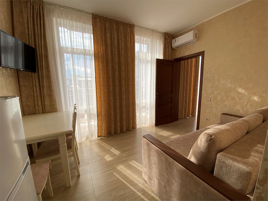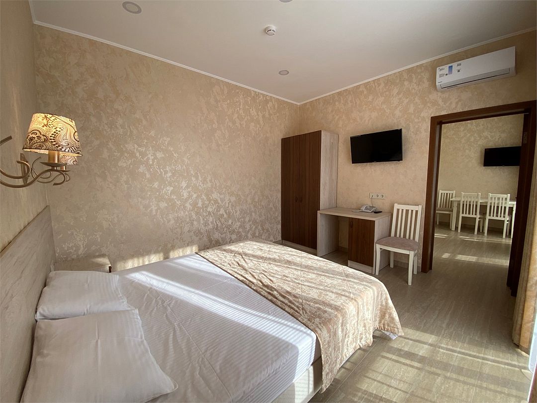 телевизор, Wi-Fi, холодильник, кондиционер, светильник, фен, банные полотенца, пляжные полотенца, две односпальные или большая двуспальная кровать, тумбы, стулья, обеденный стол, багажная тумба, зеркало, душ, вид во двор, туалетный столик, туалет, диван-кровать, раскладной диван, внутренний телефон, вешалки-плечики, без питомцевВ гостиничном номере