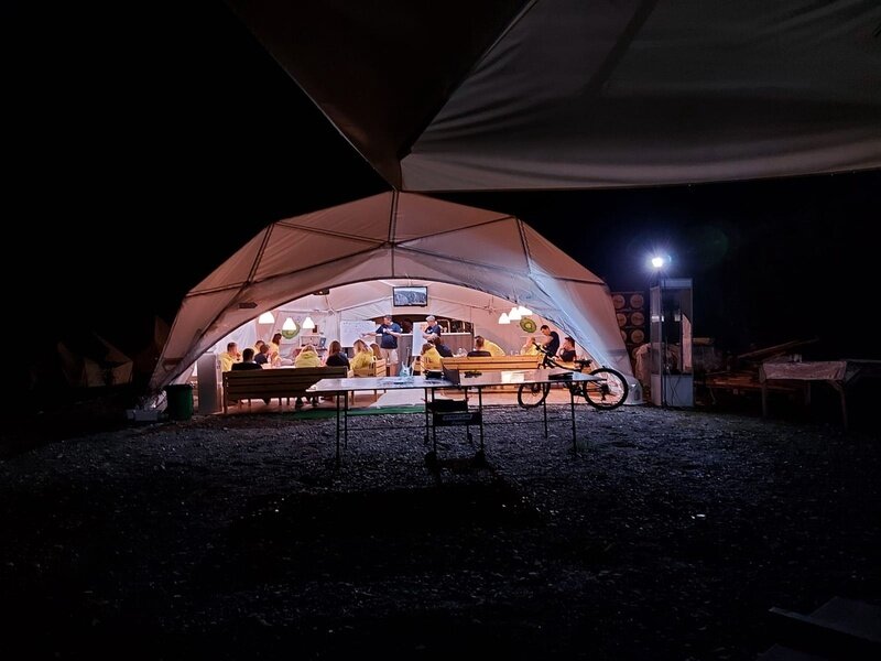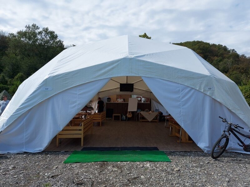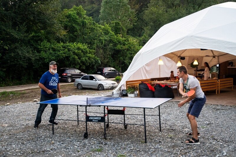 На территории теннисный стол и бассейн (с подогревом), комфортабельные душевые кабины и туалеты.Зал-шатёр