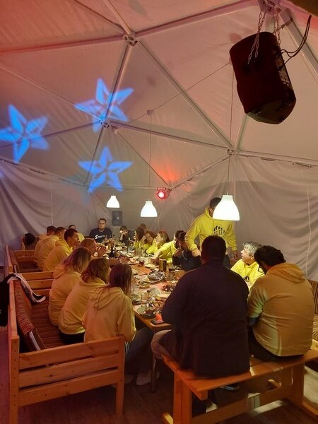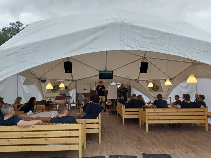 Зал-шатер для проведения корпоративов, конференций, тренингов. А так же семейных мероприятий, юбилеев, свадебных торжеств, вместимостью 40 человек.